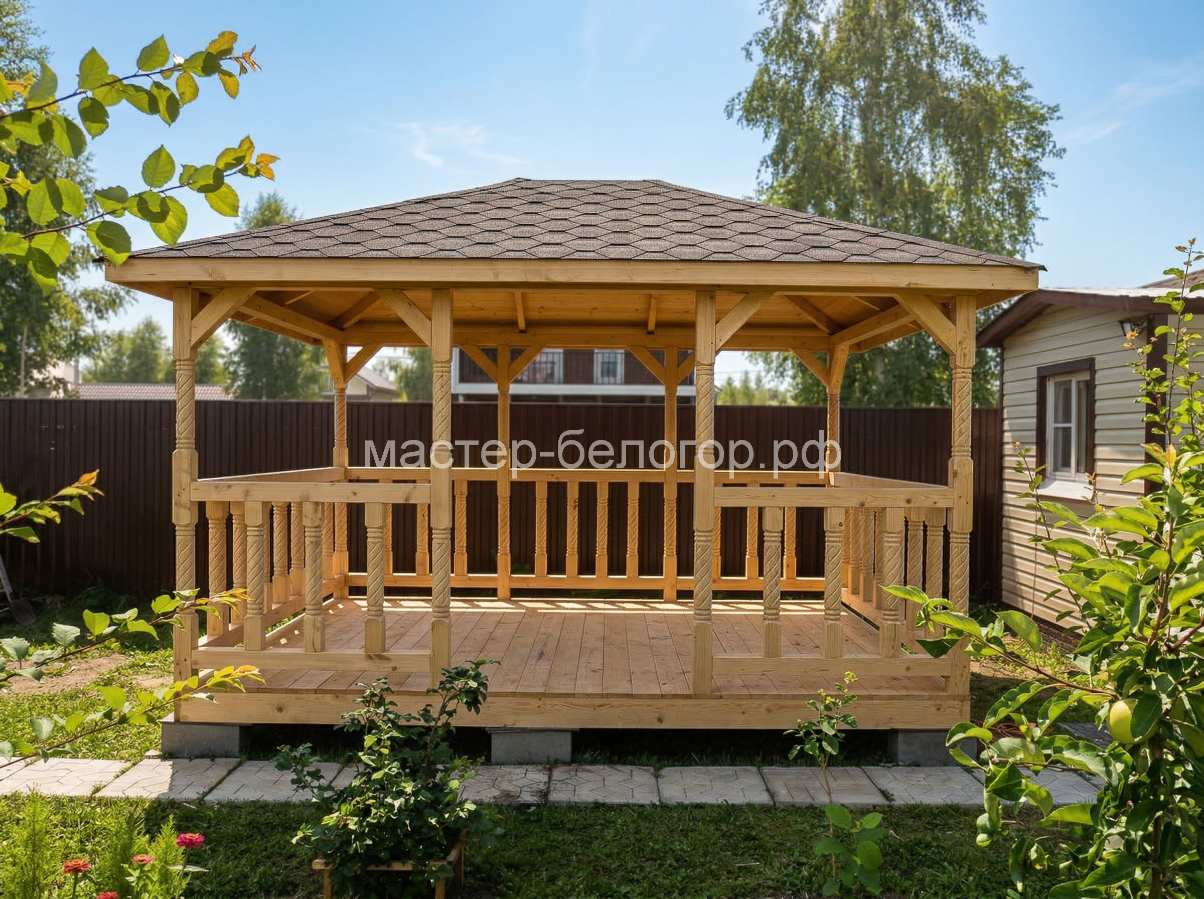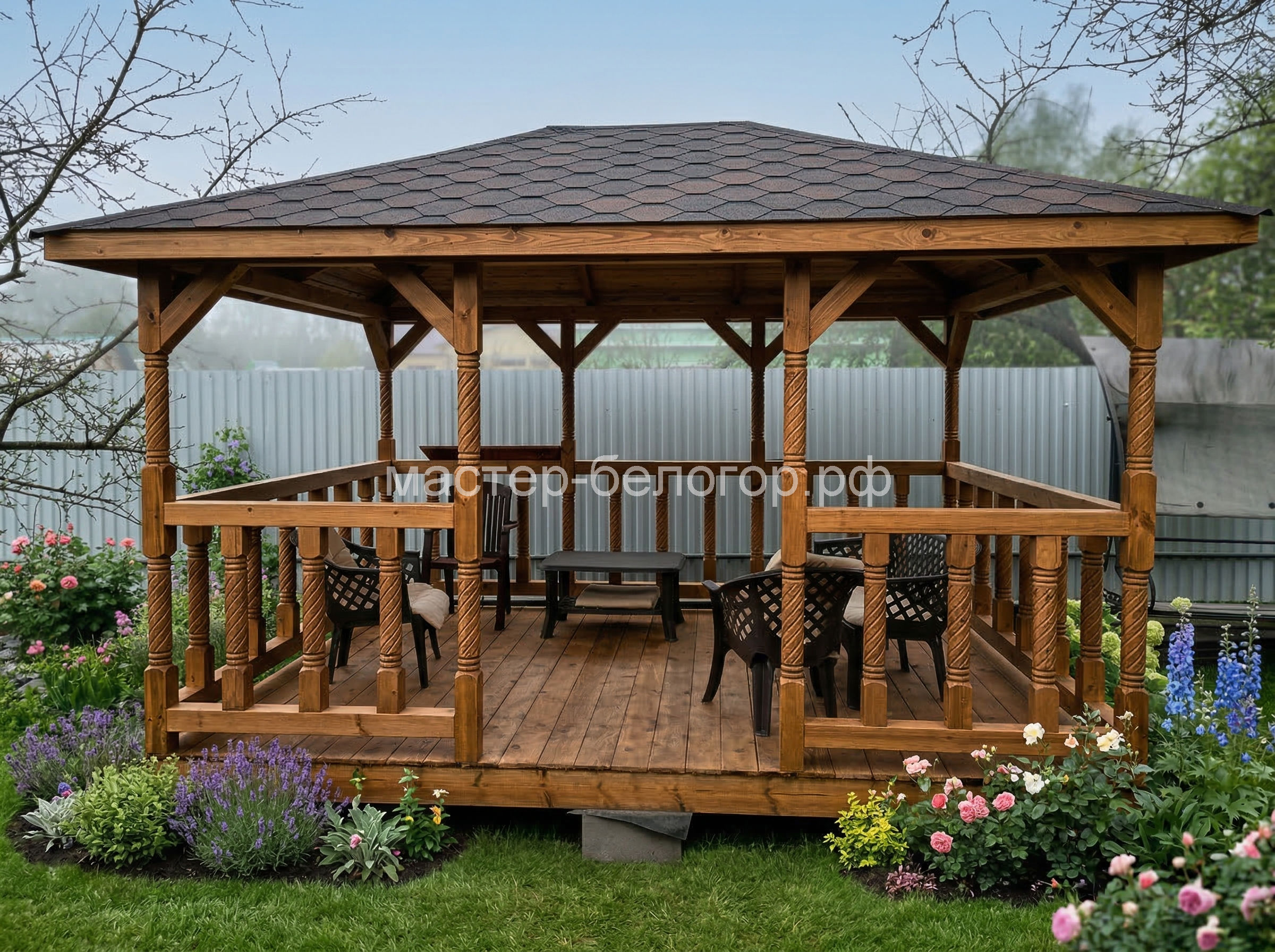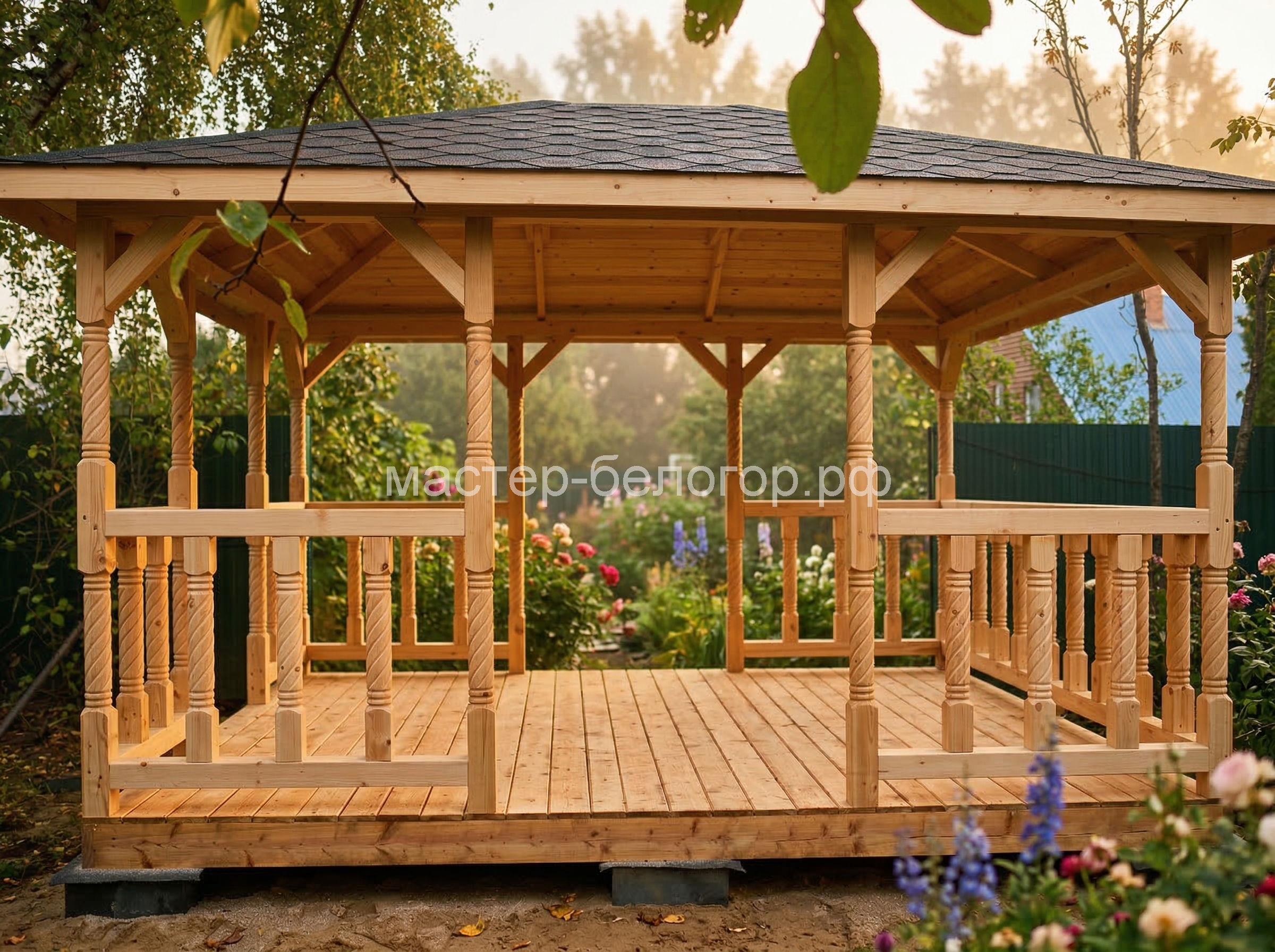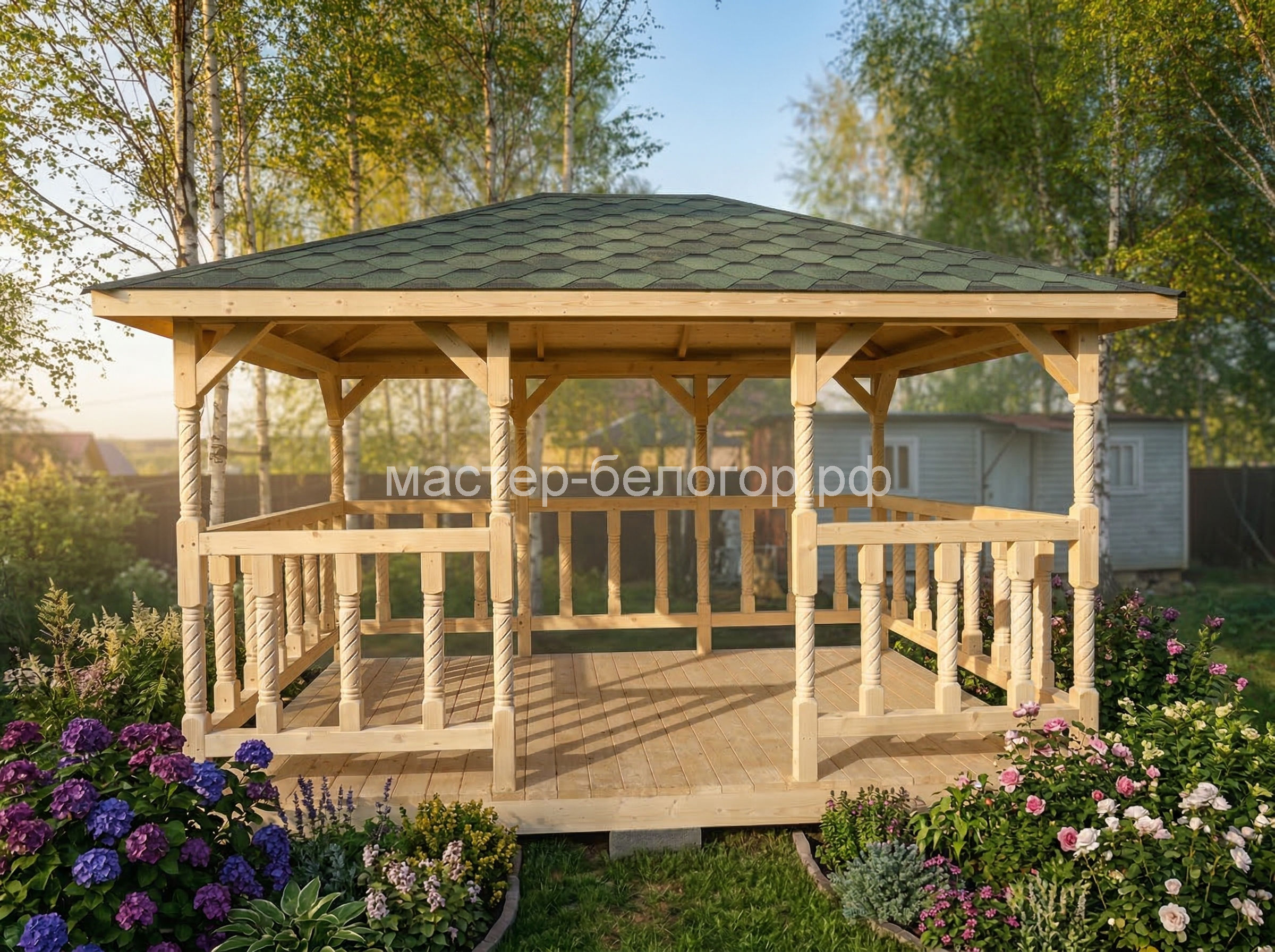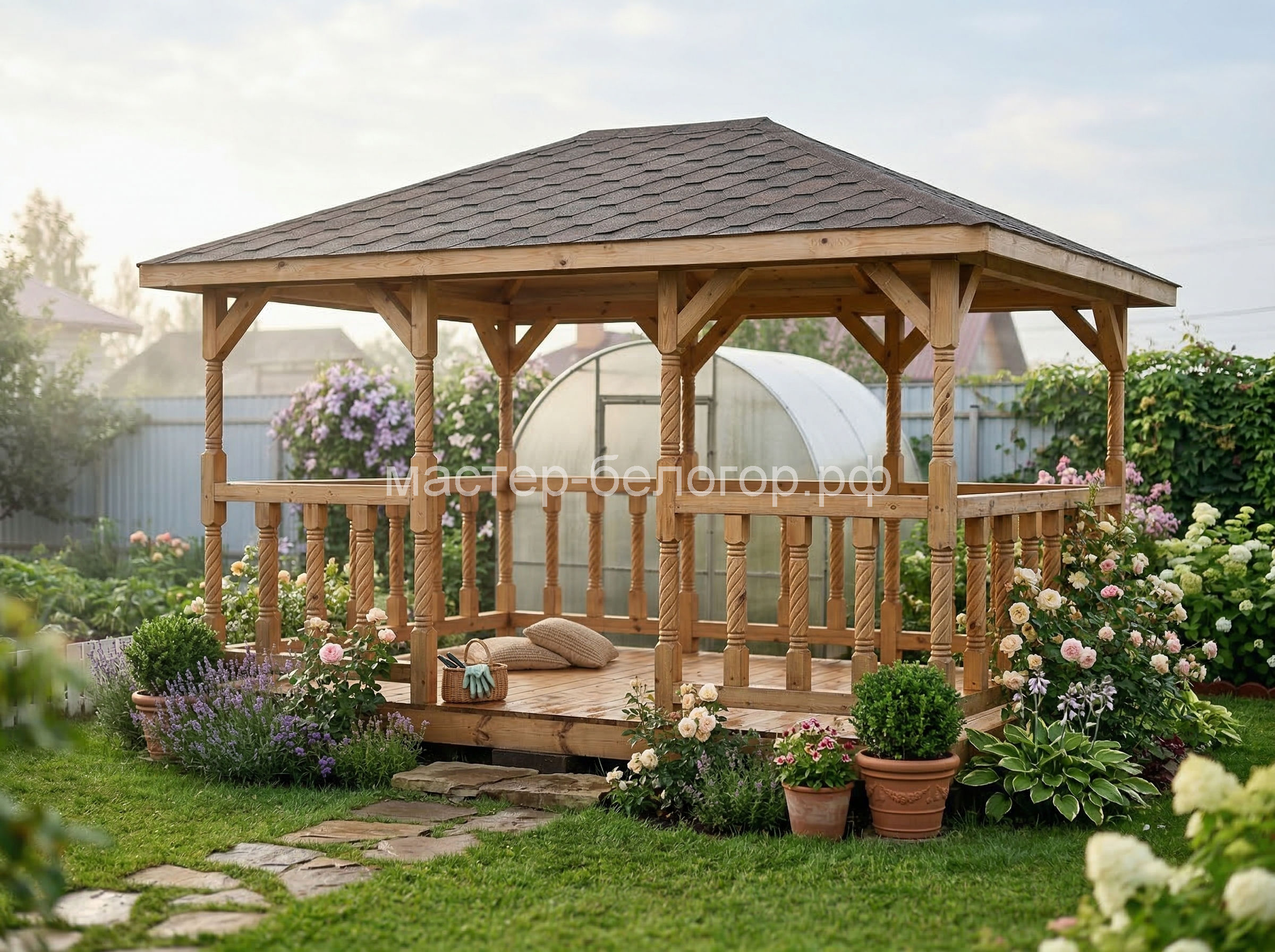4х-гранная крыша,мягкая кровля.Перголы