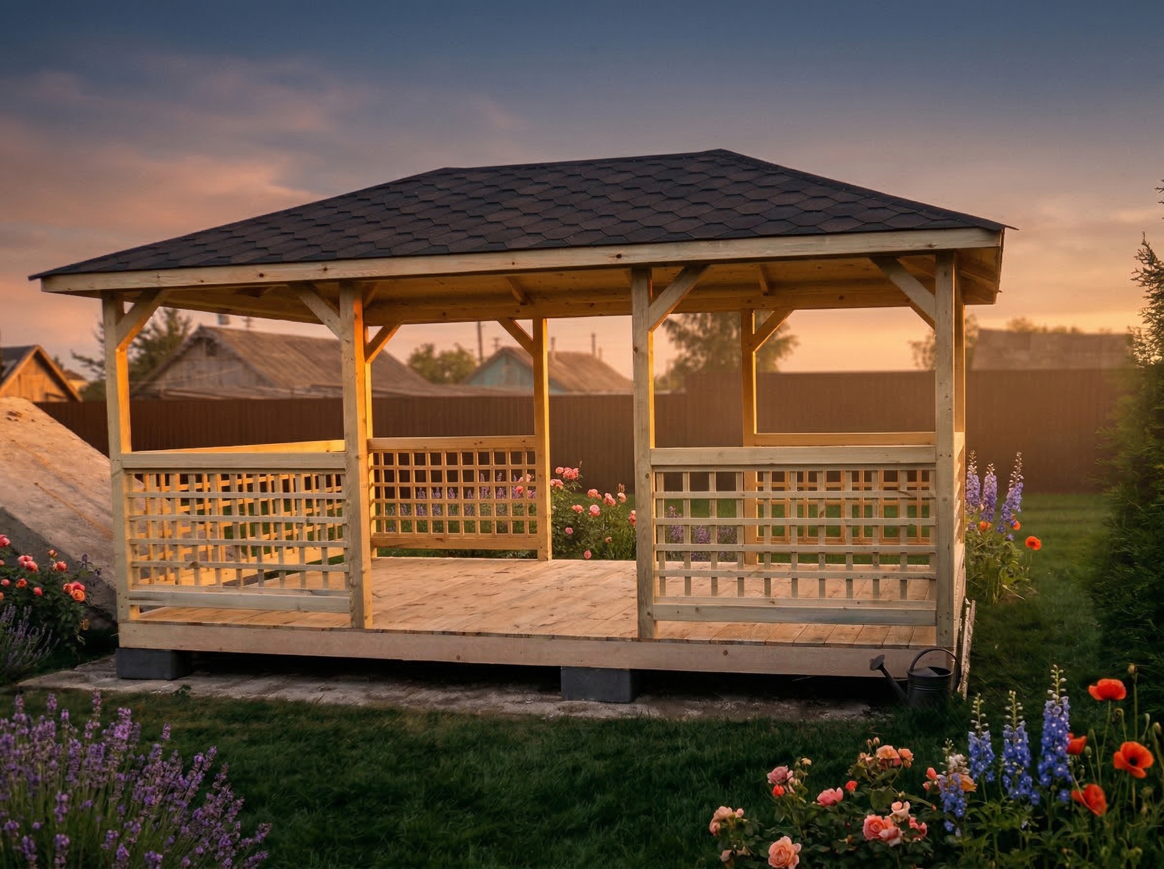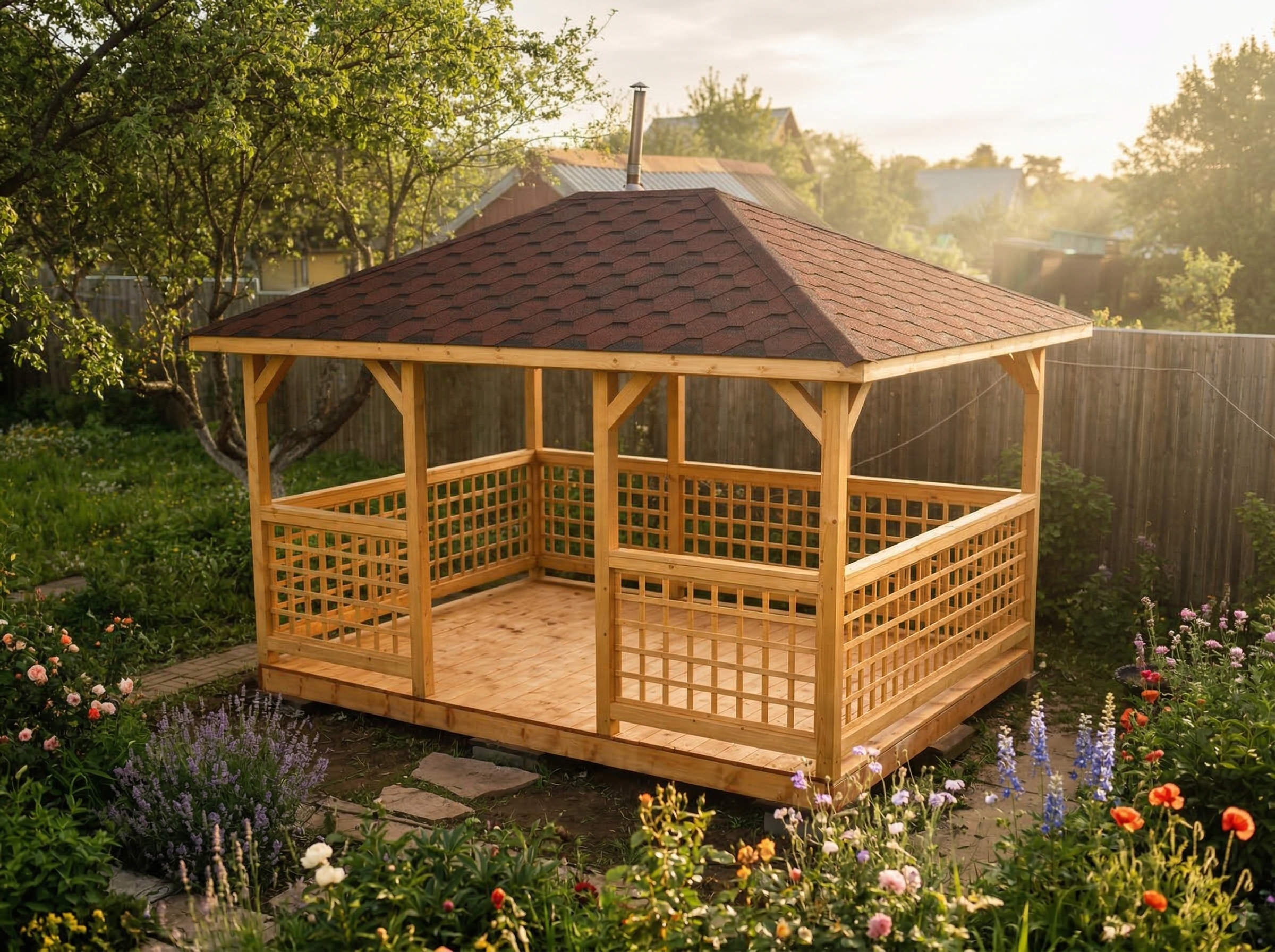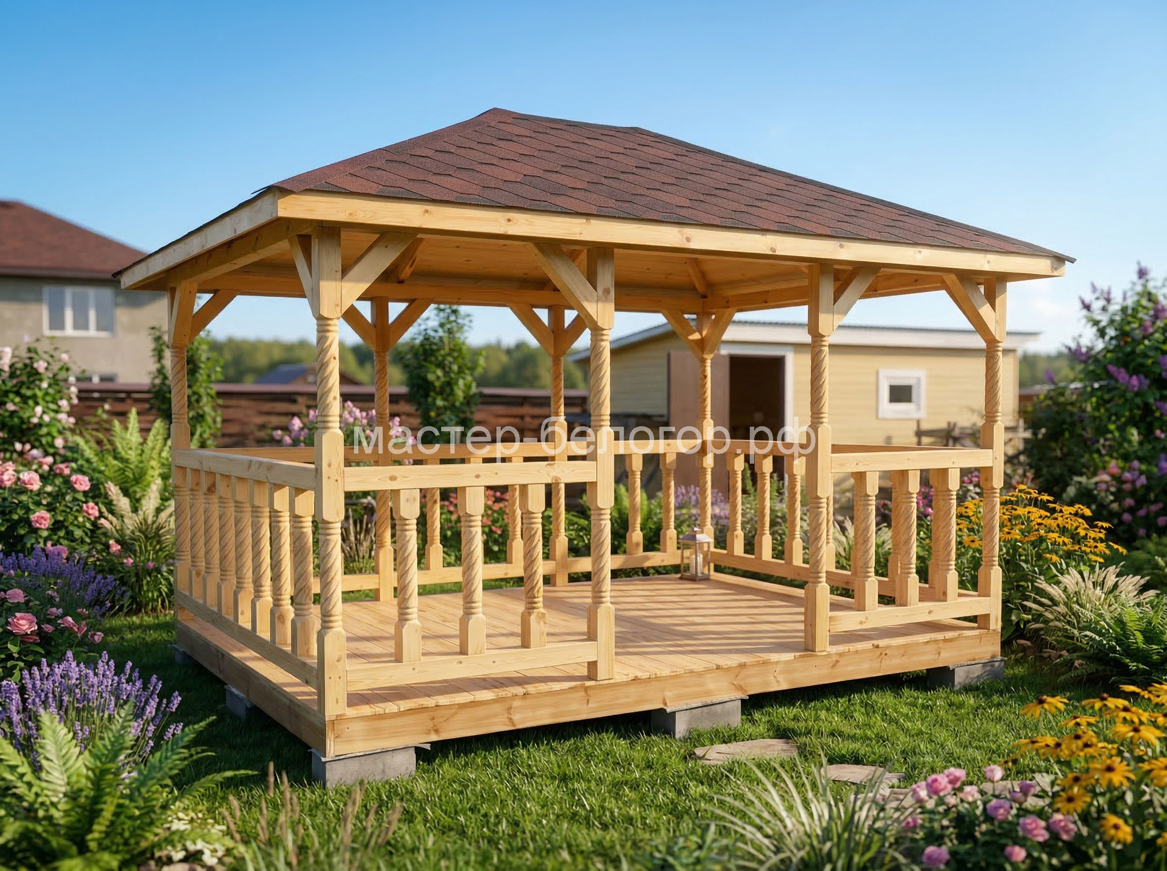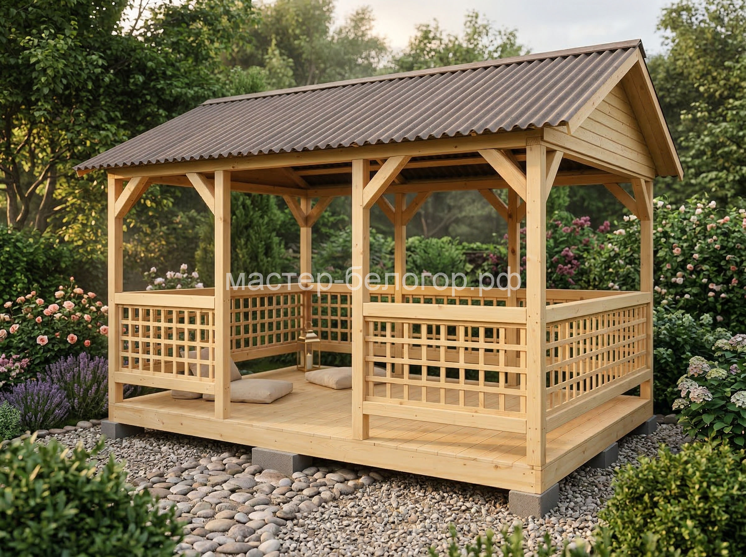 4х-гранная крыша,мягкая кровля.Перголы