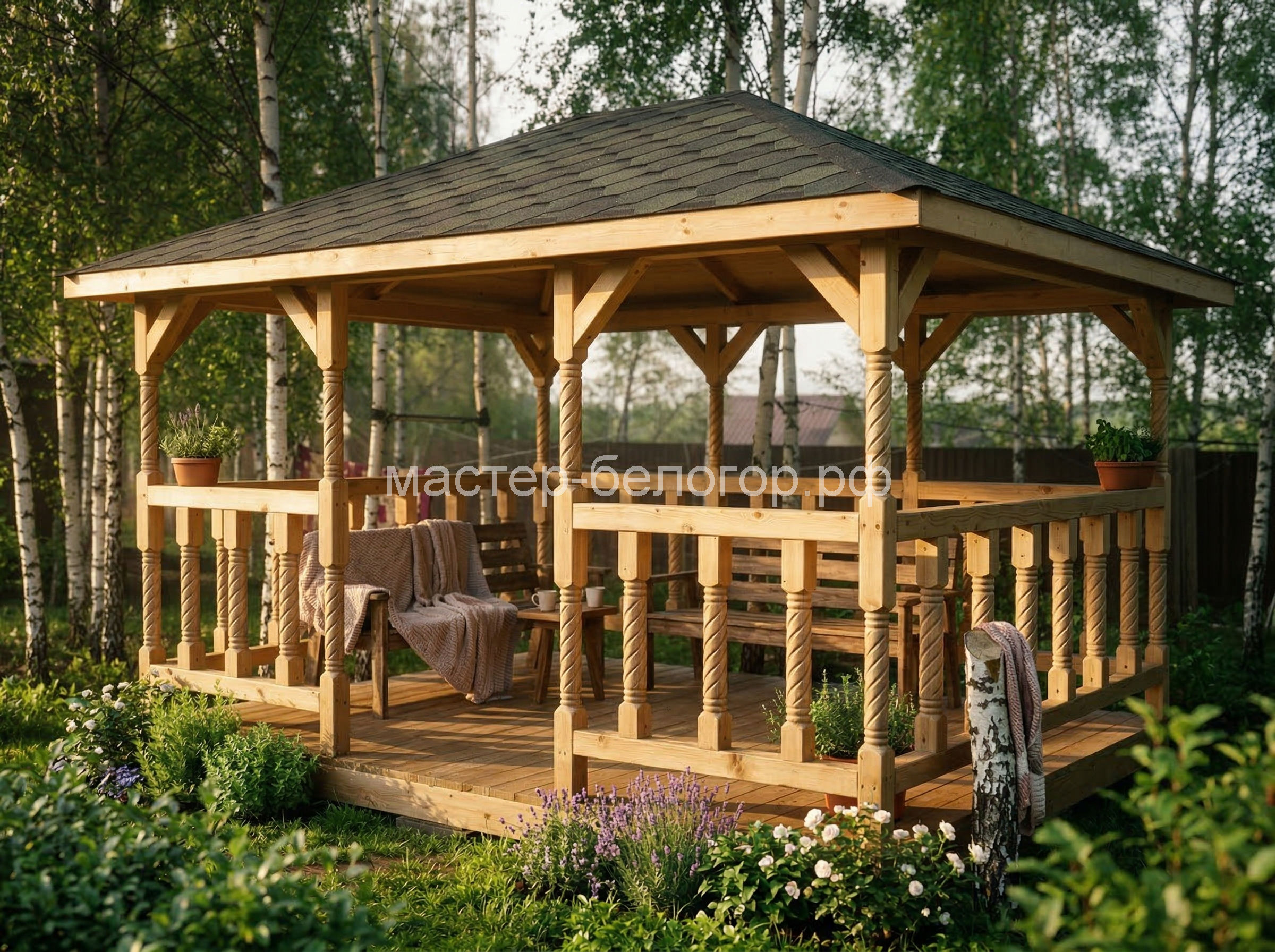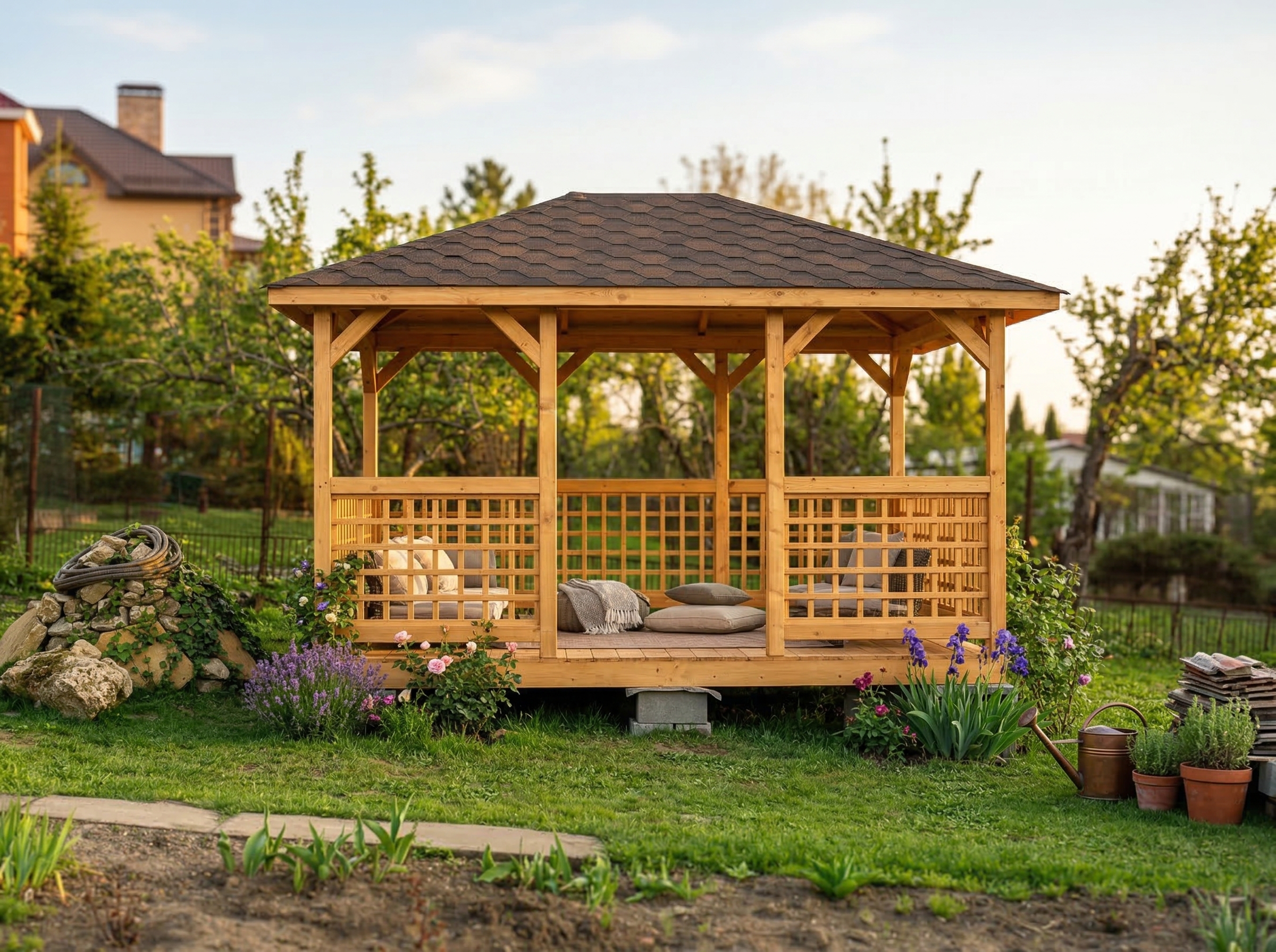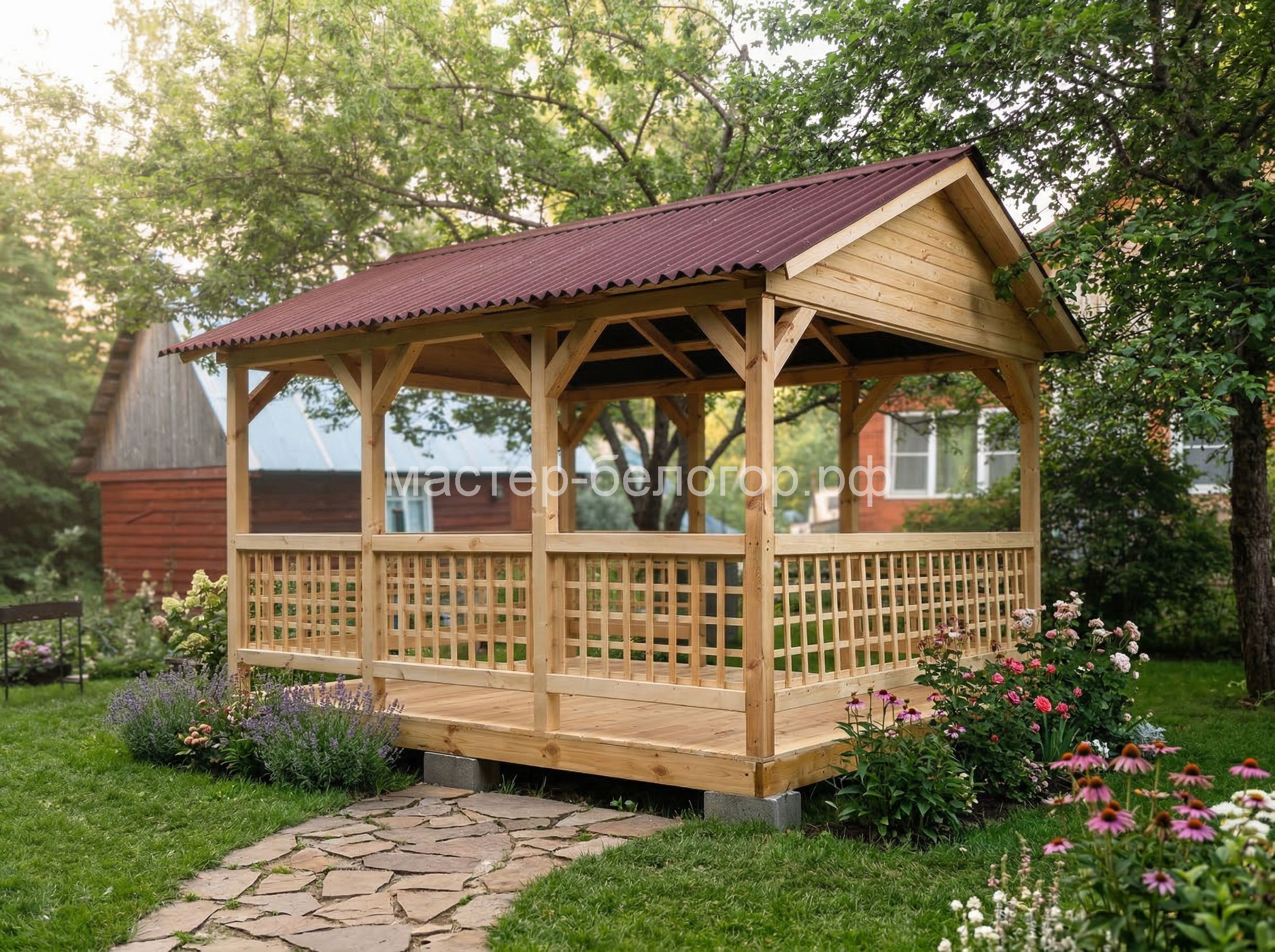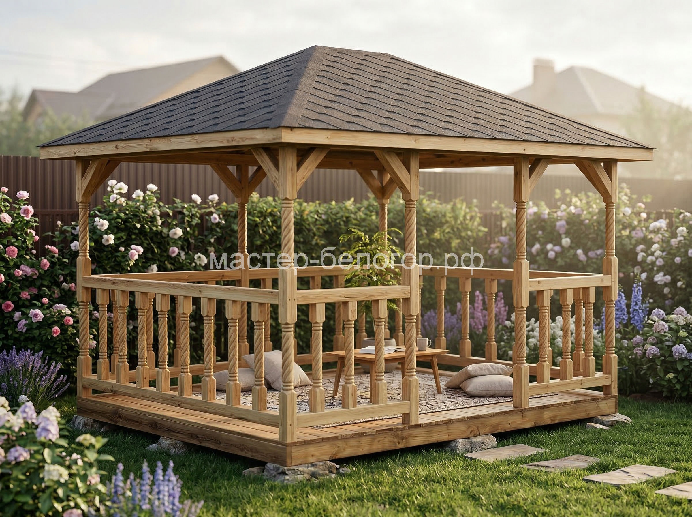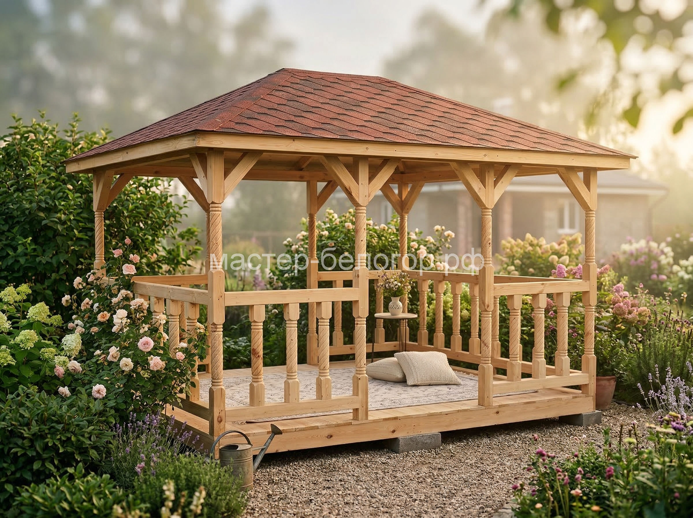 4х-гранная крыша,мягкая кровля.Перголы
