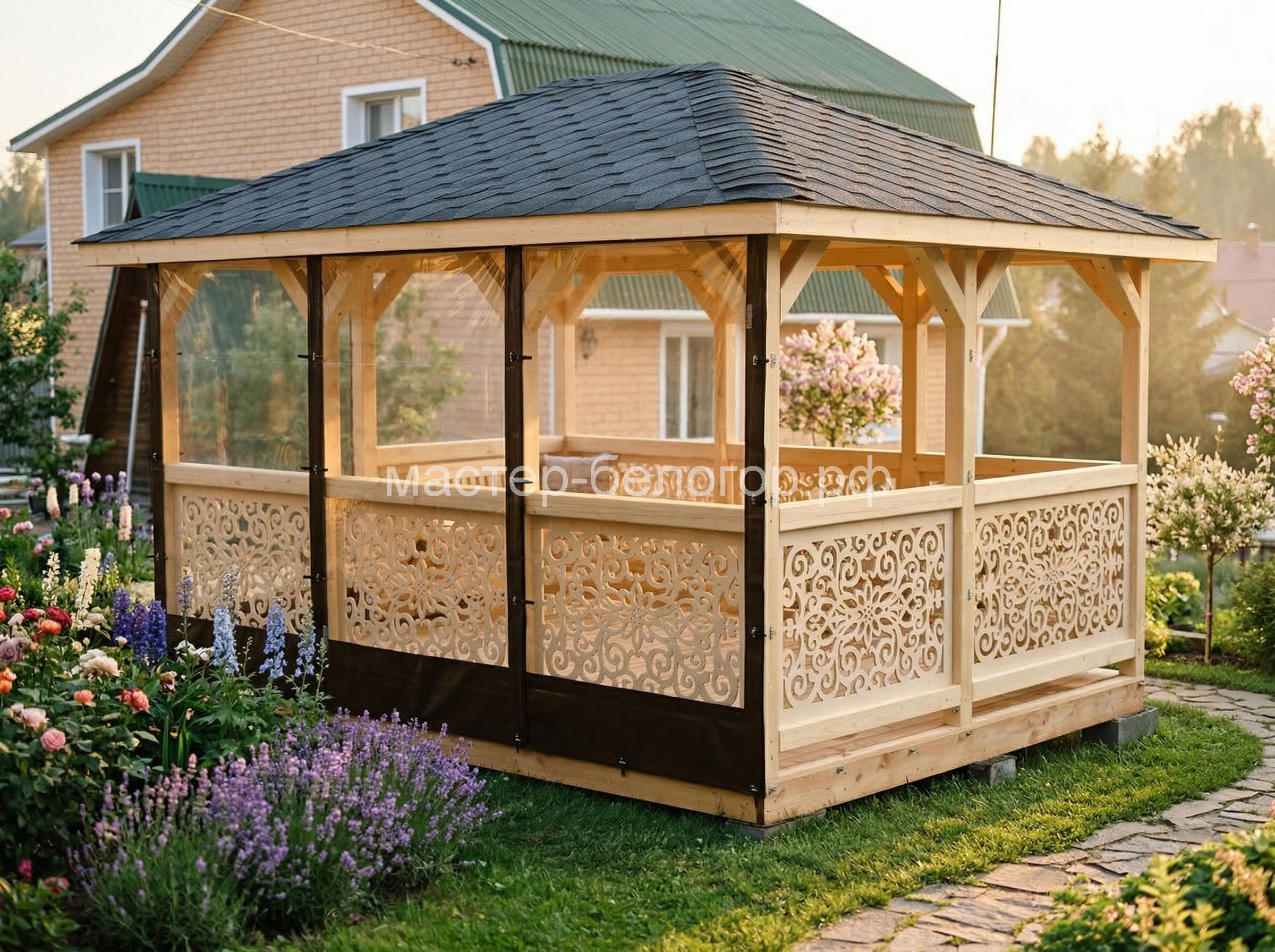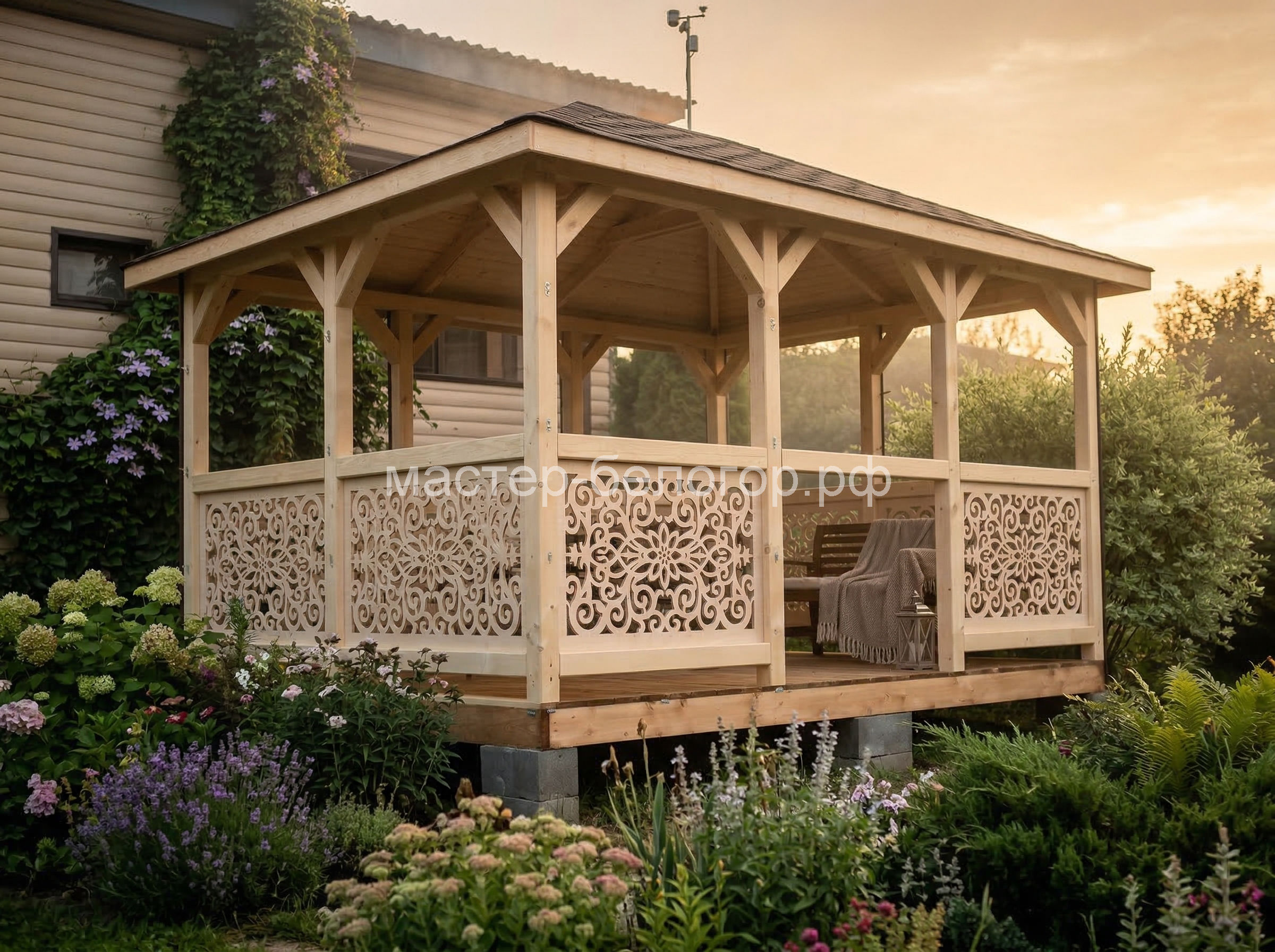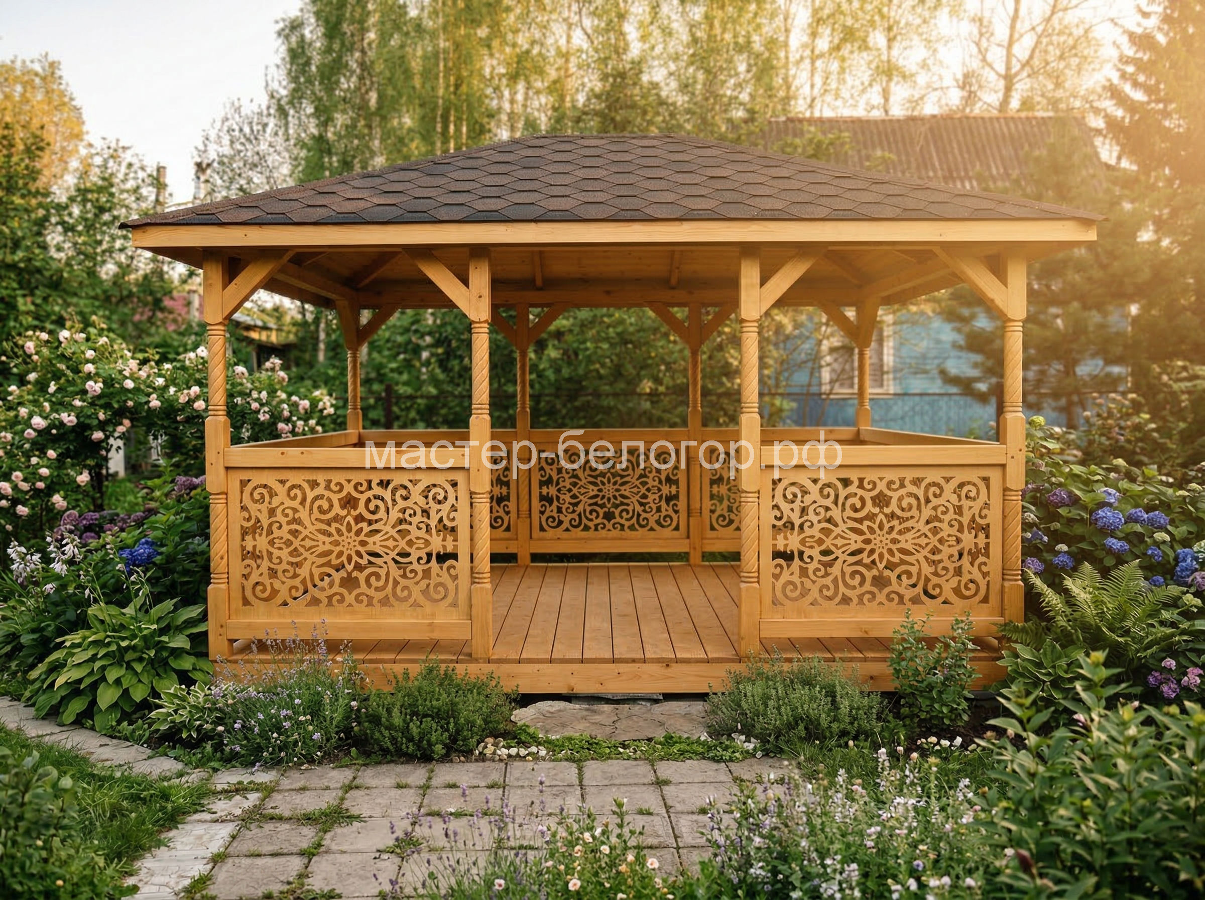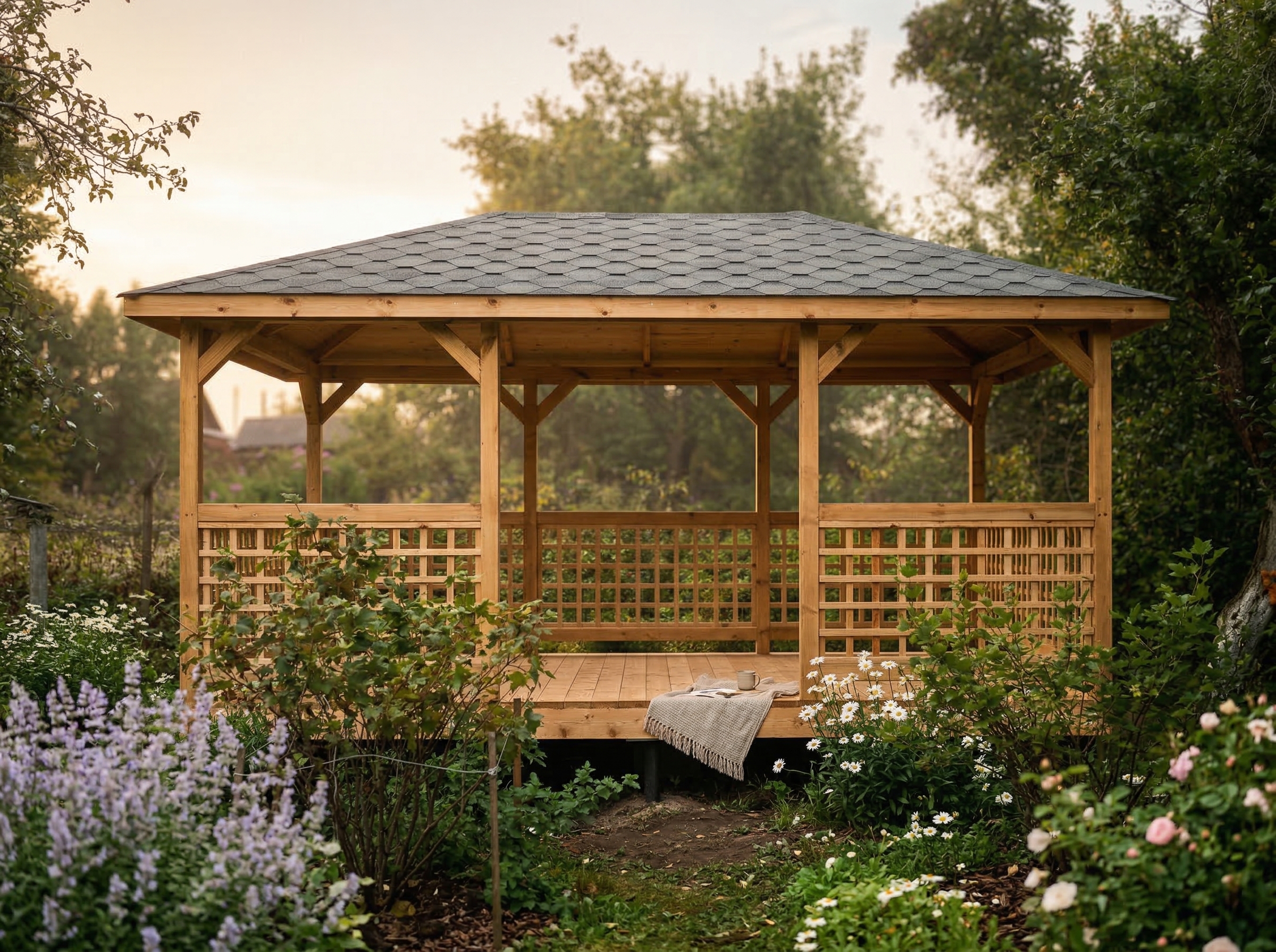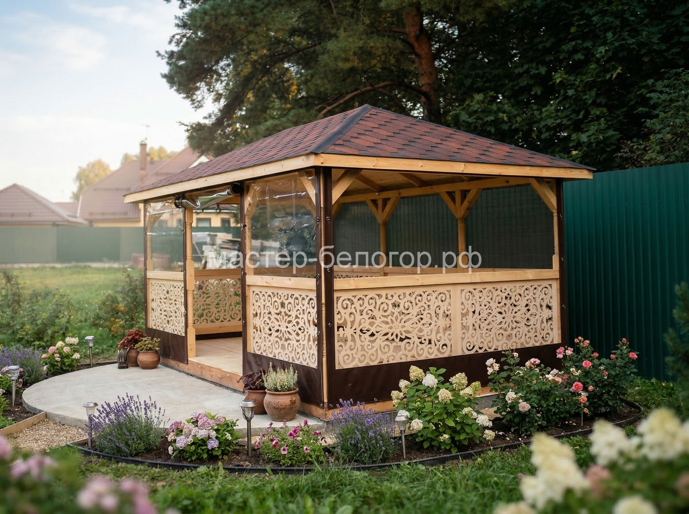 4х-гранная крыша,мягкая кровля.Перголы