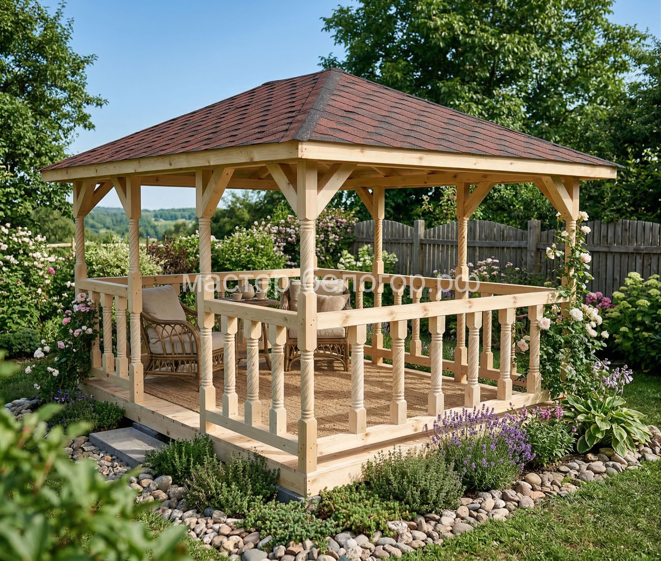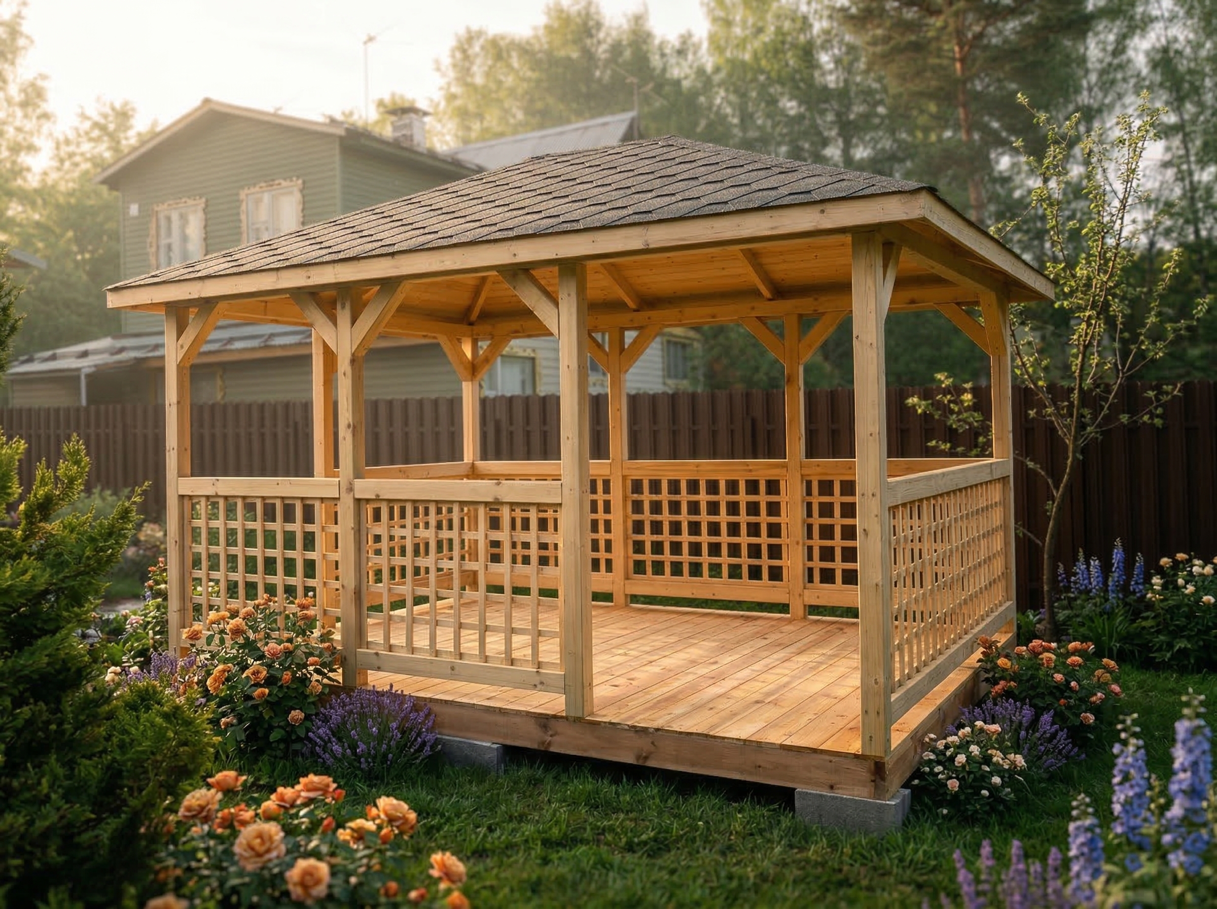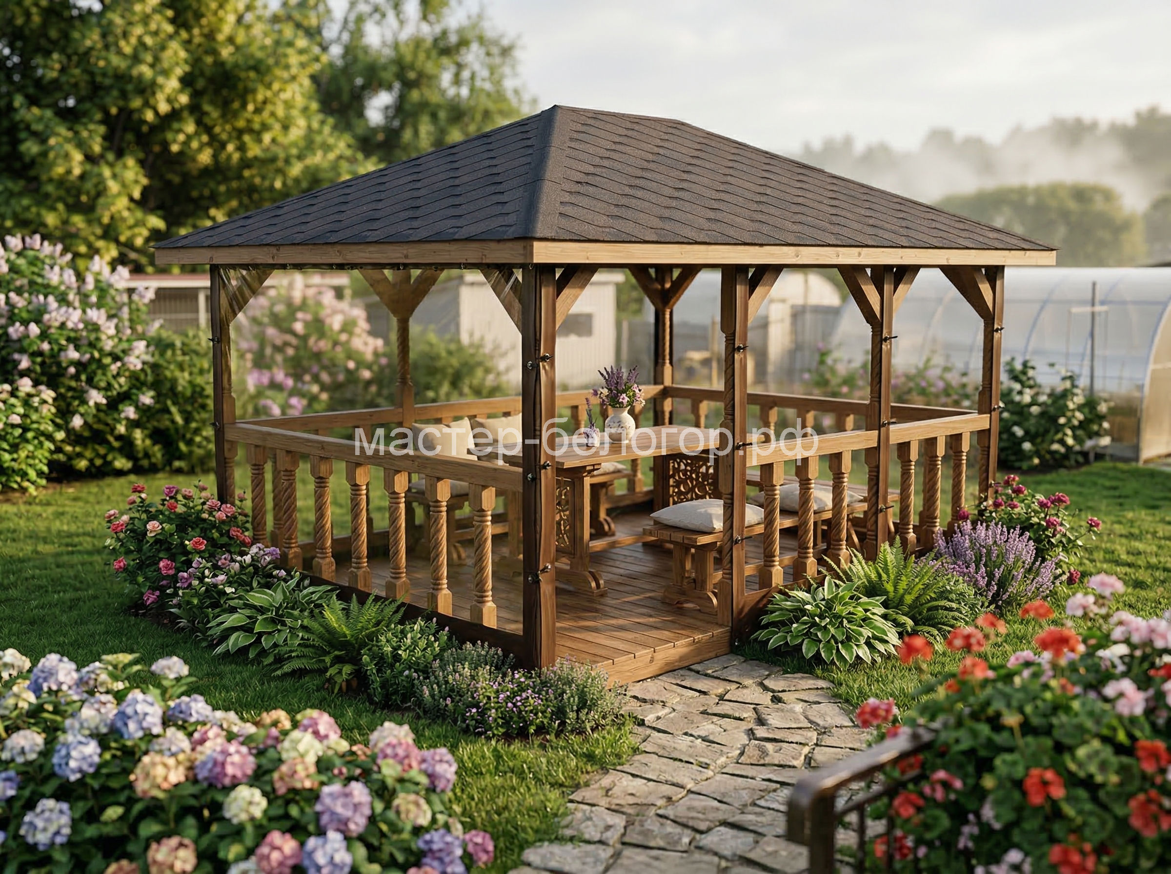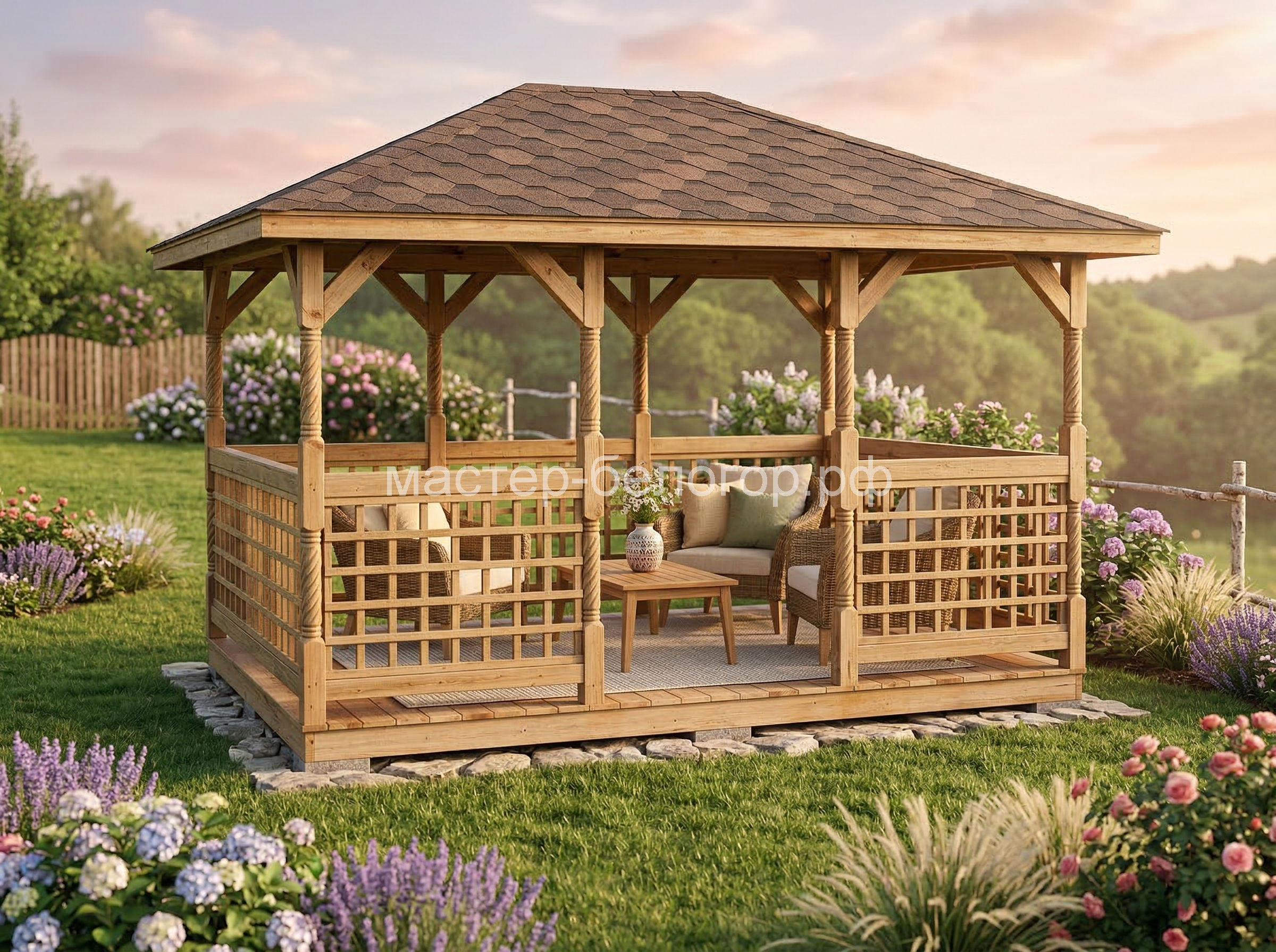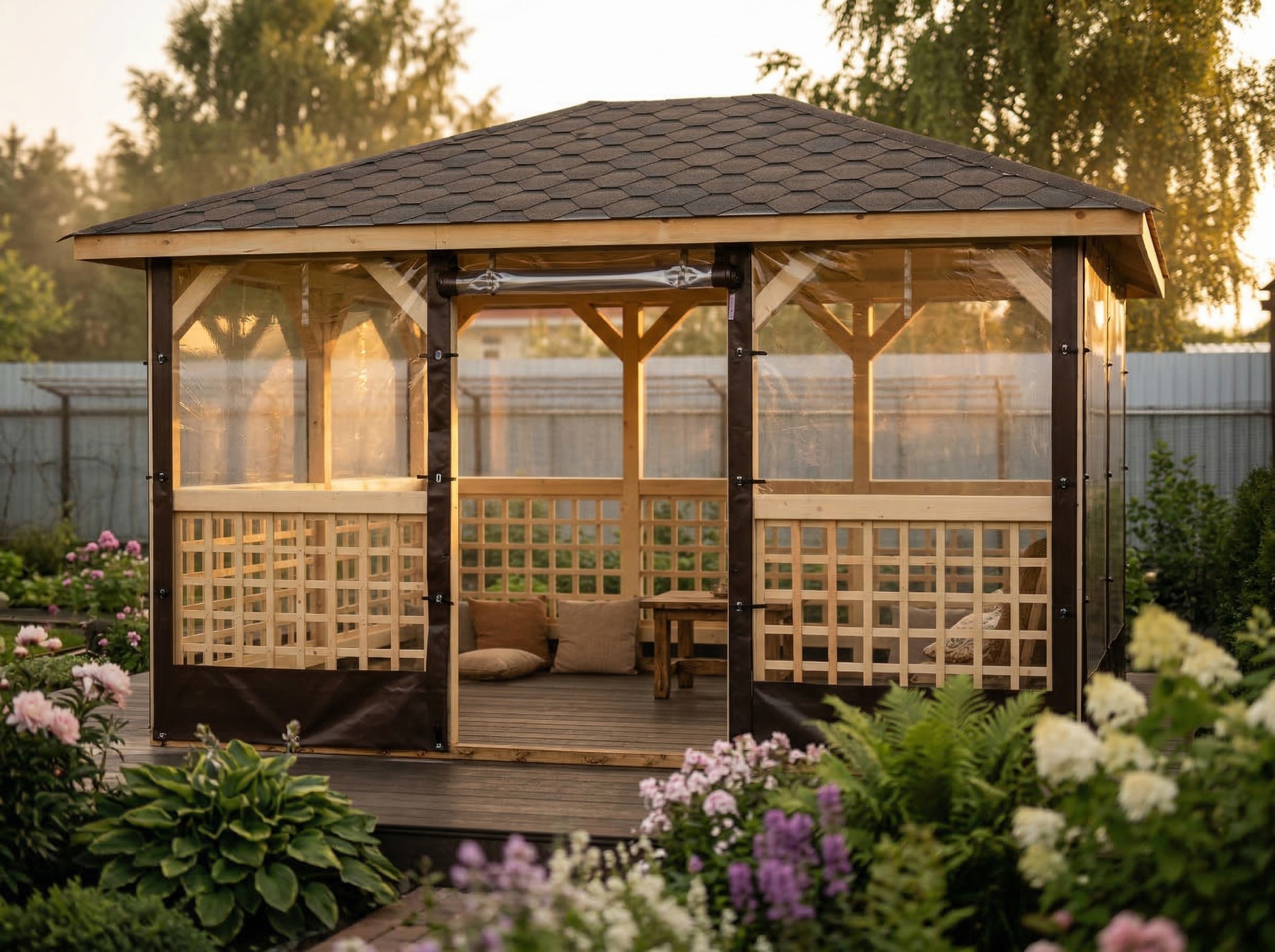 4х-гранная крыша,мягкая кровля.Перголы