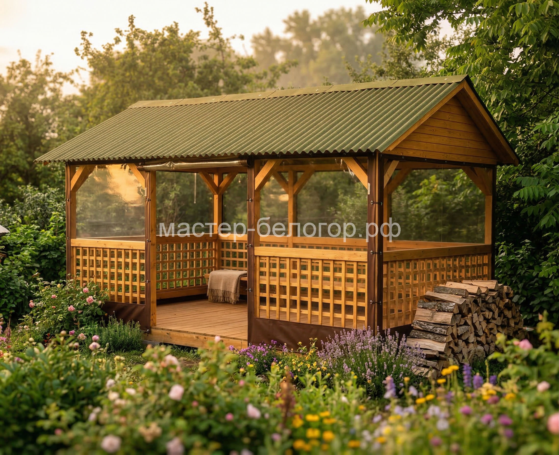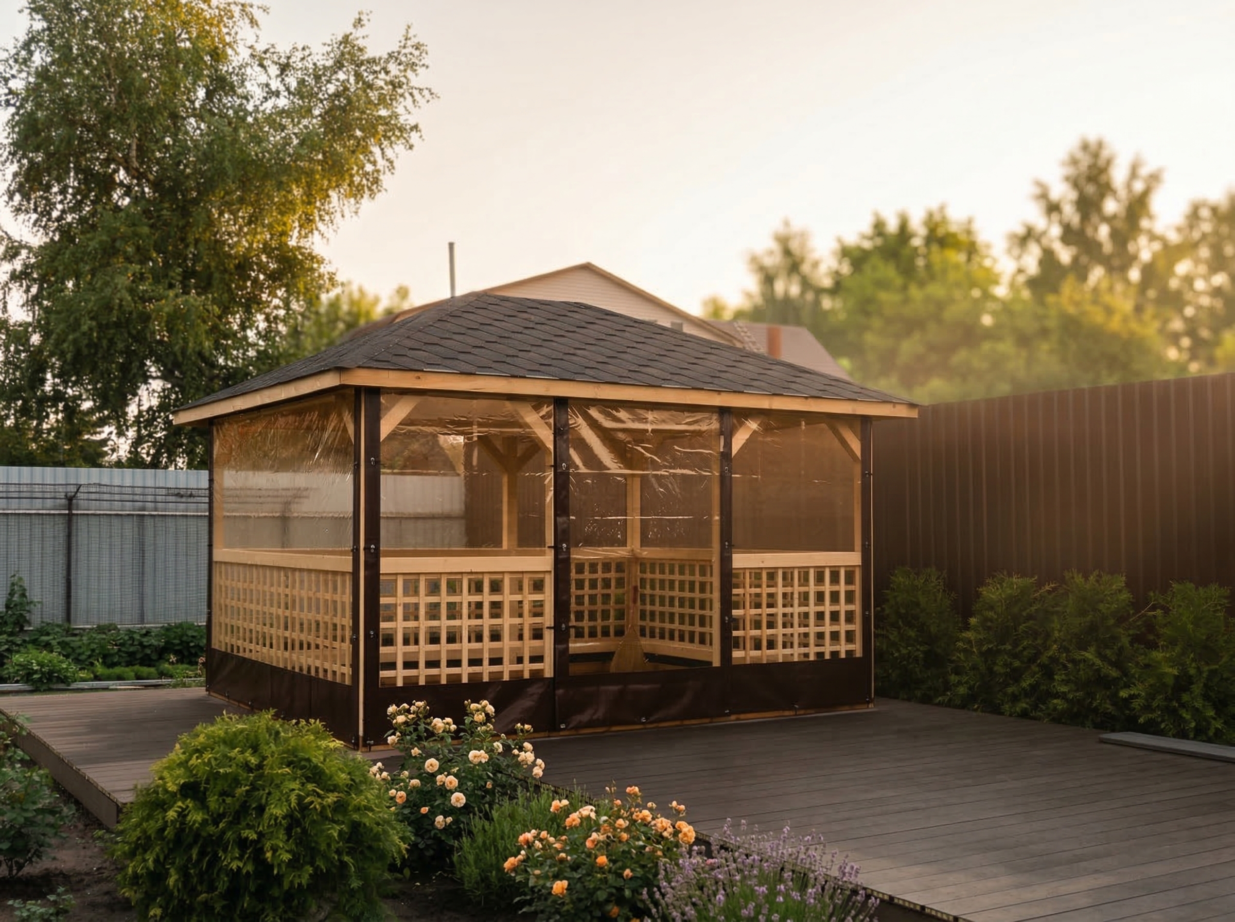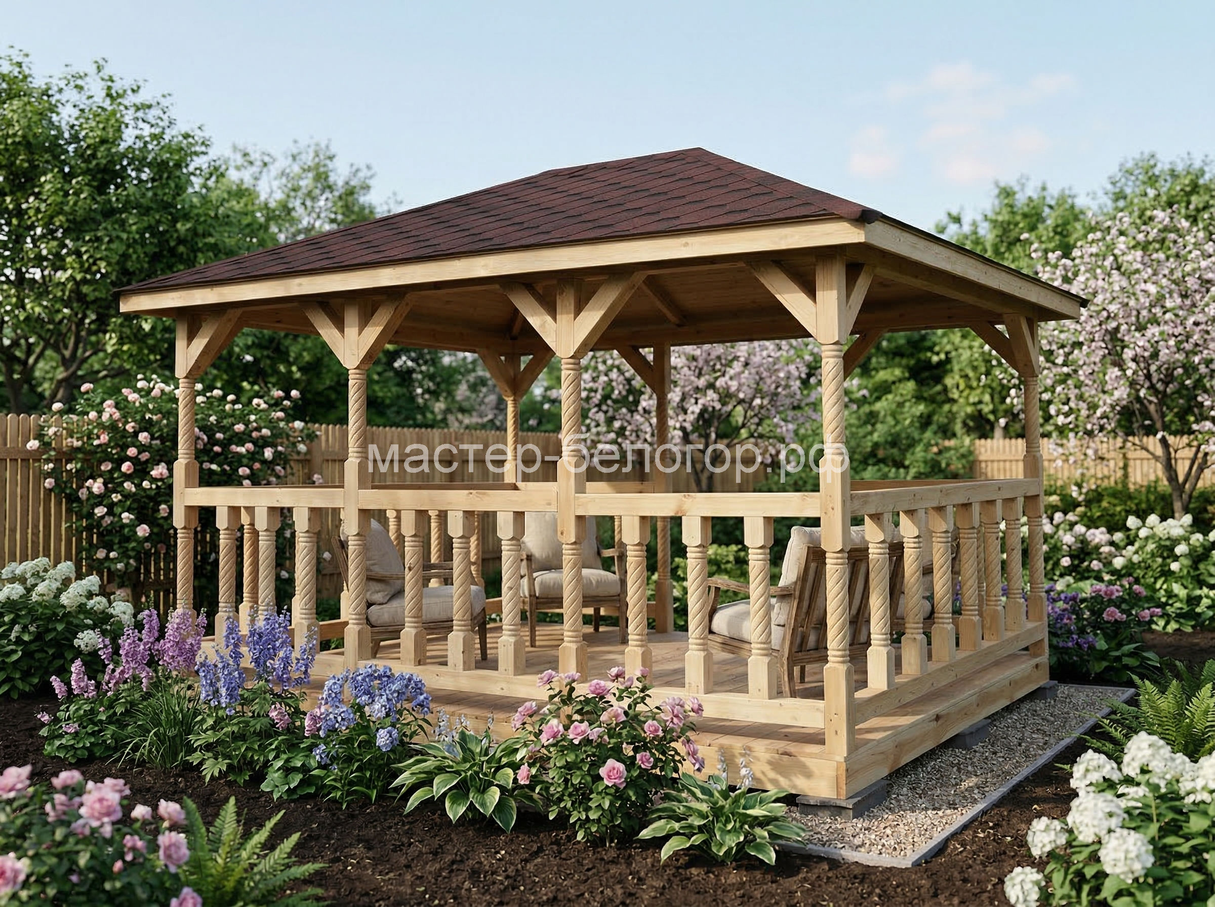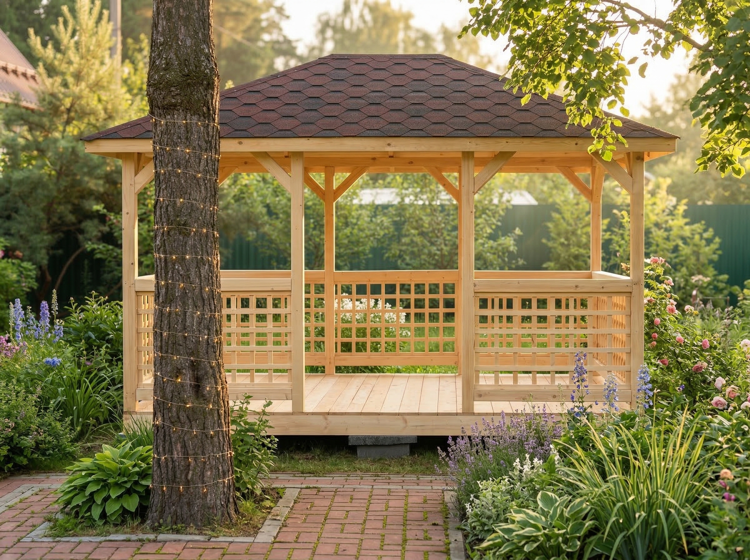 4х-гранная крыша,мягкая кровля.Перголы