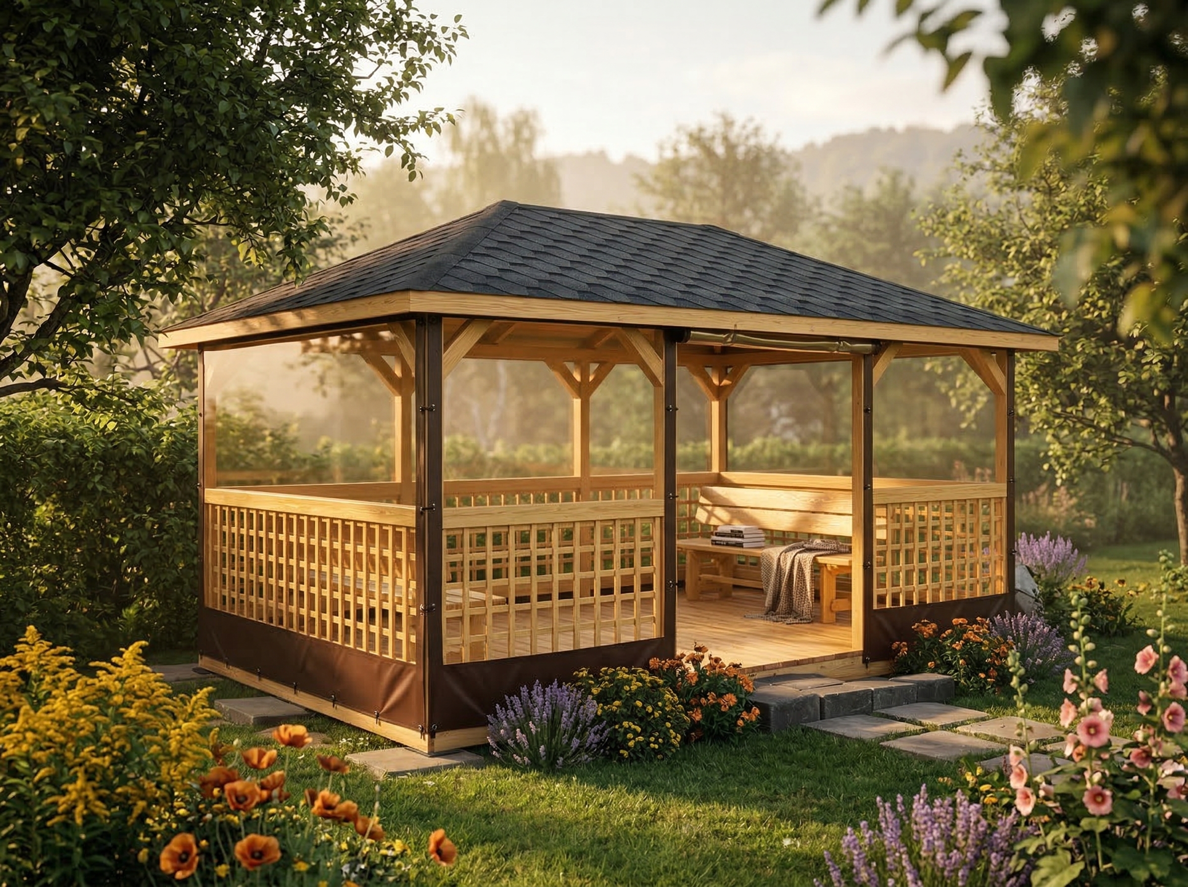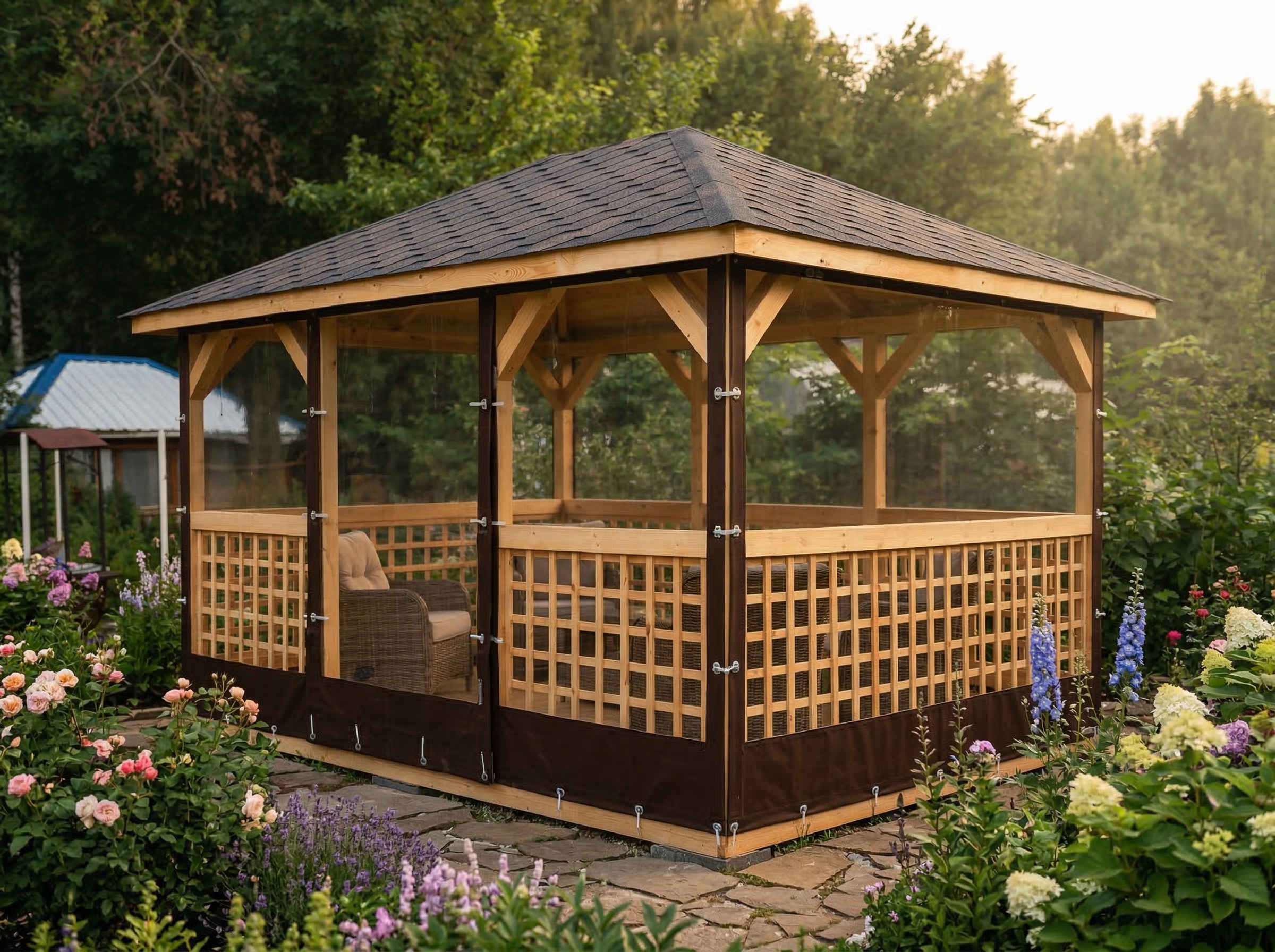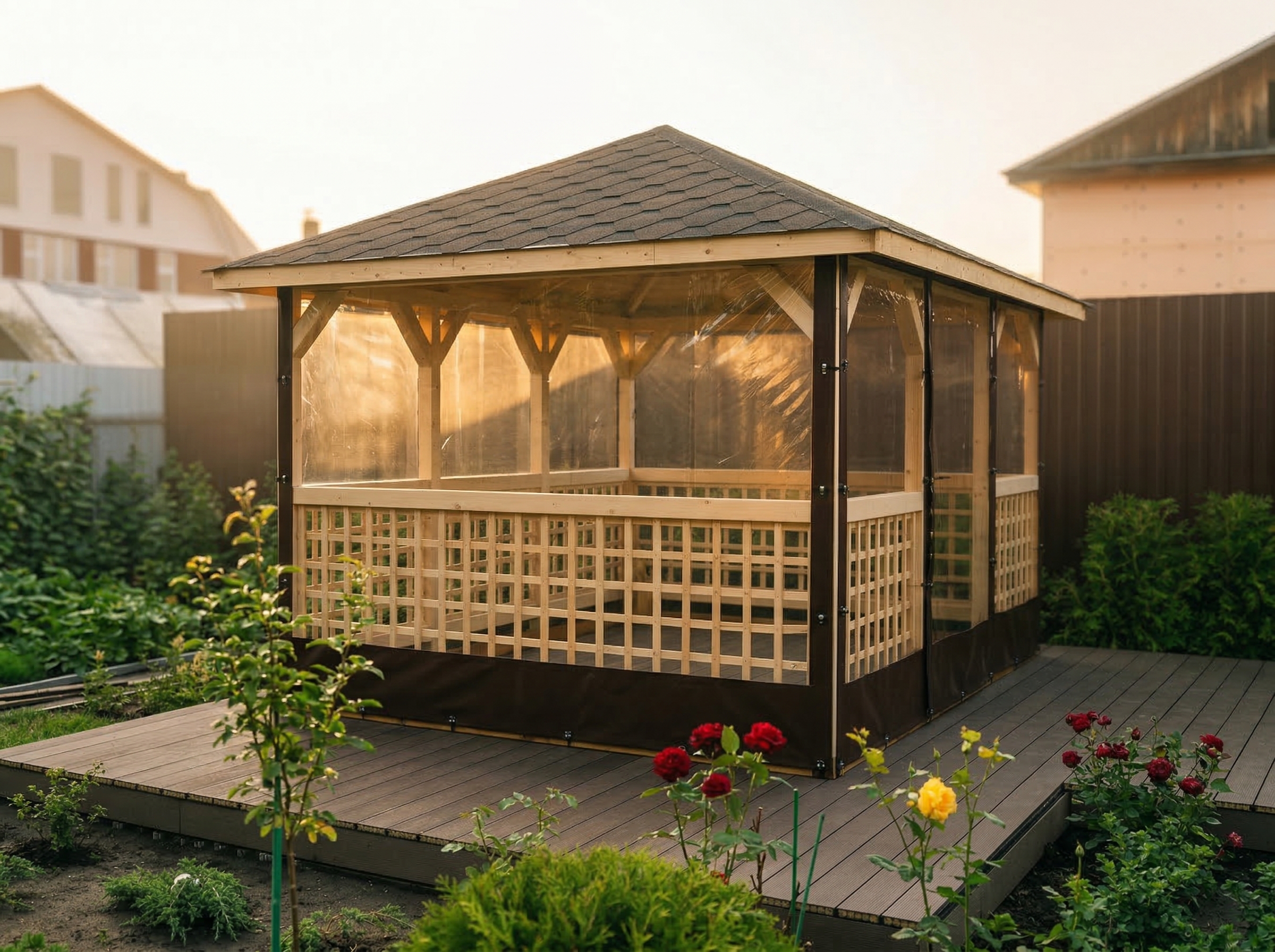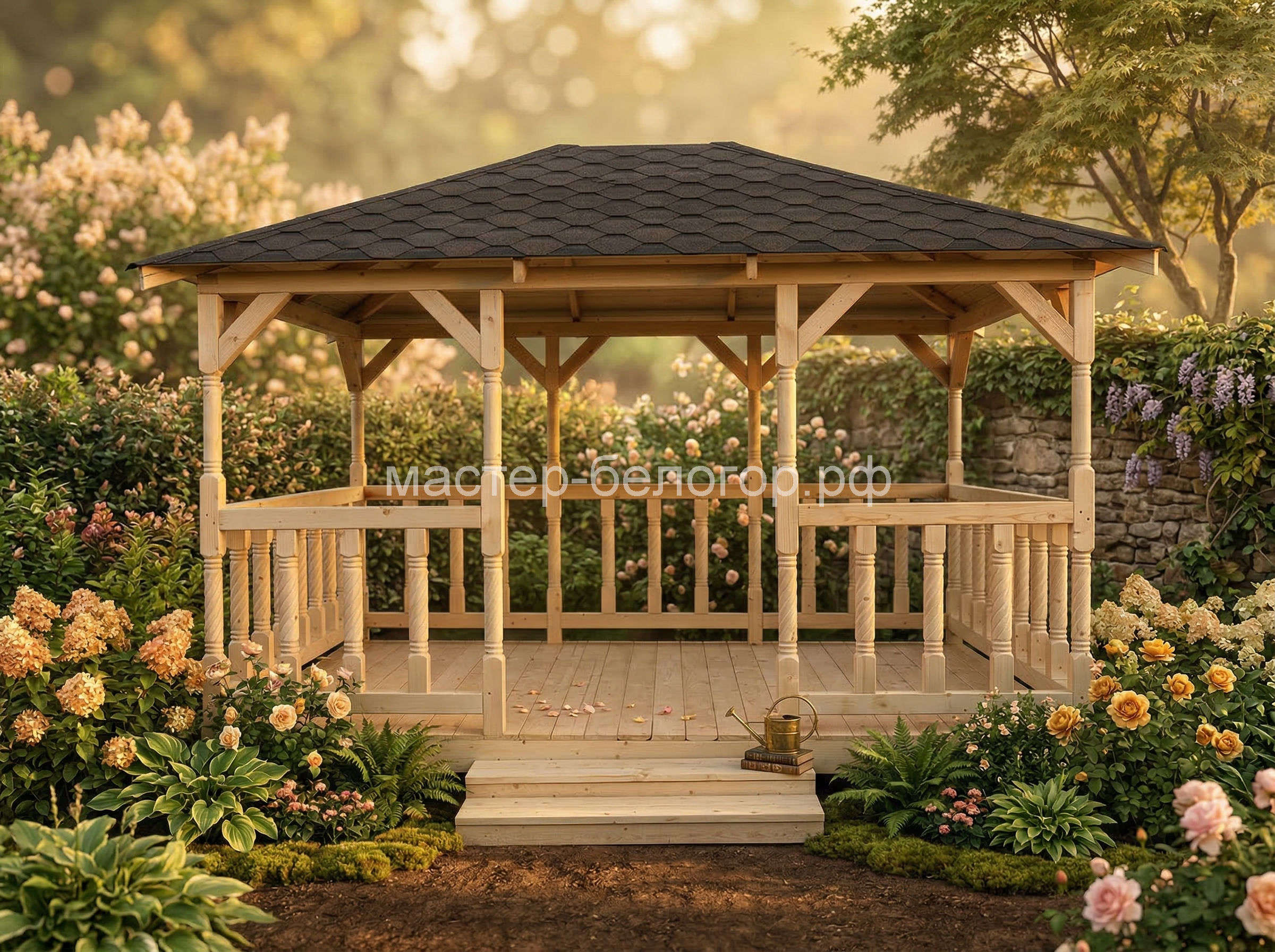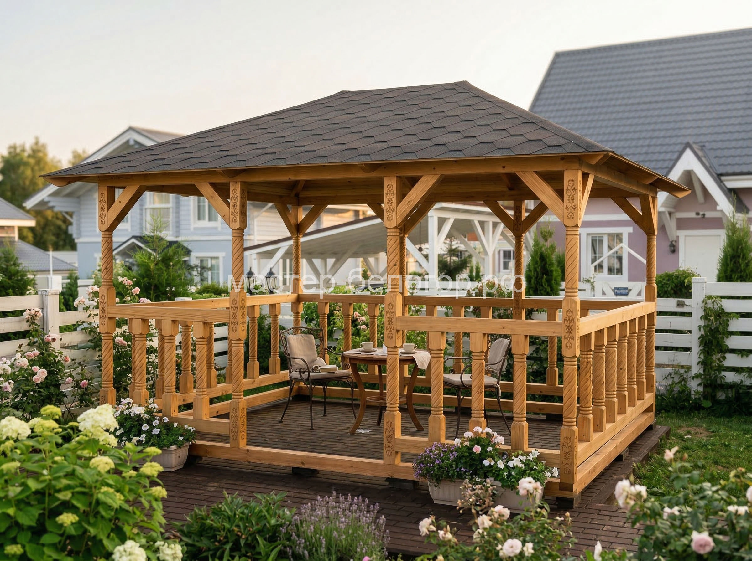 4х-гранная крыша,мягкая кровля.Перголы