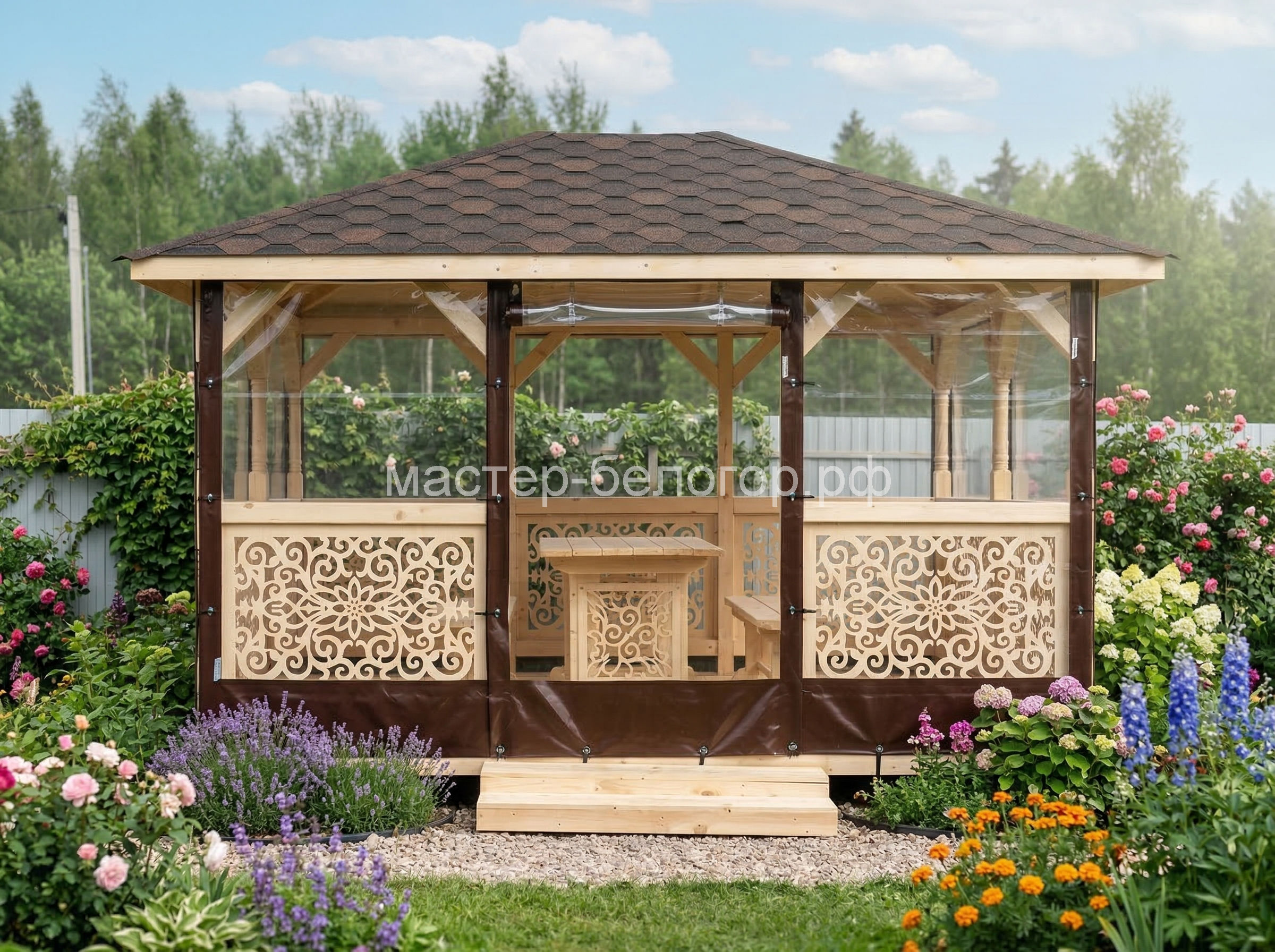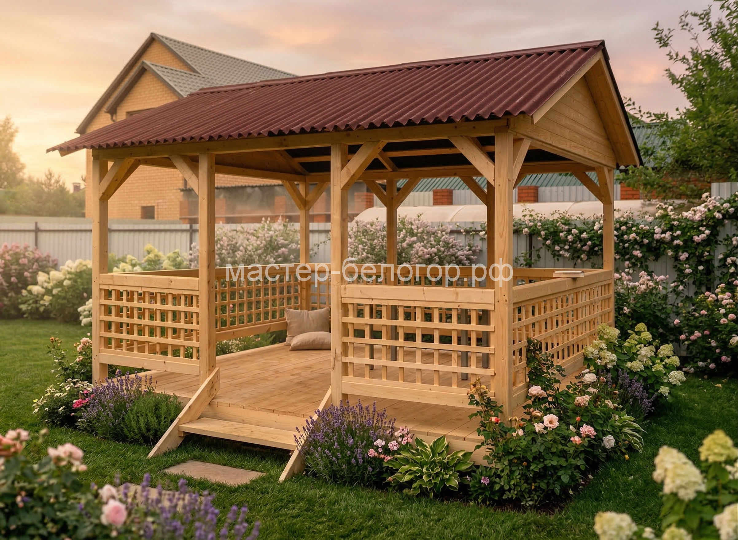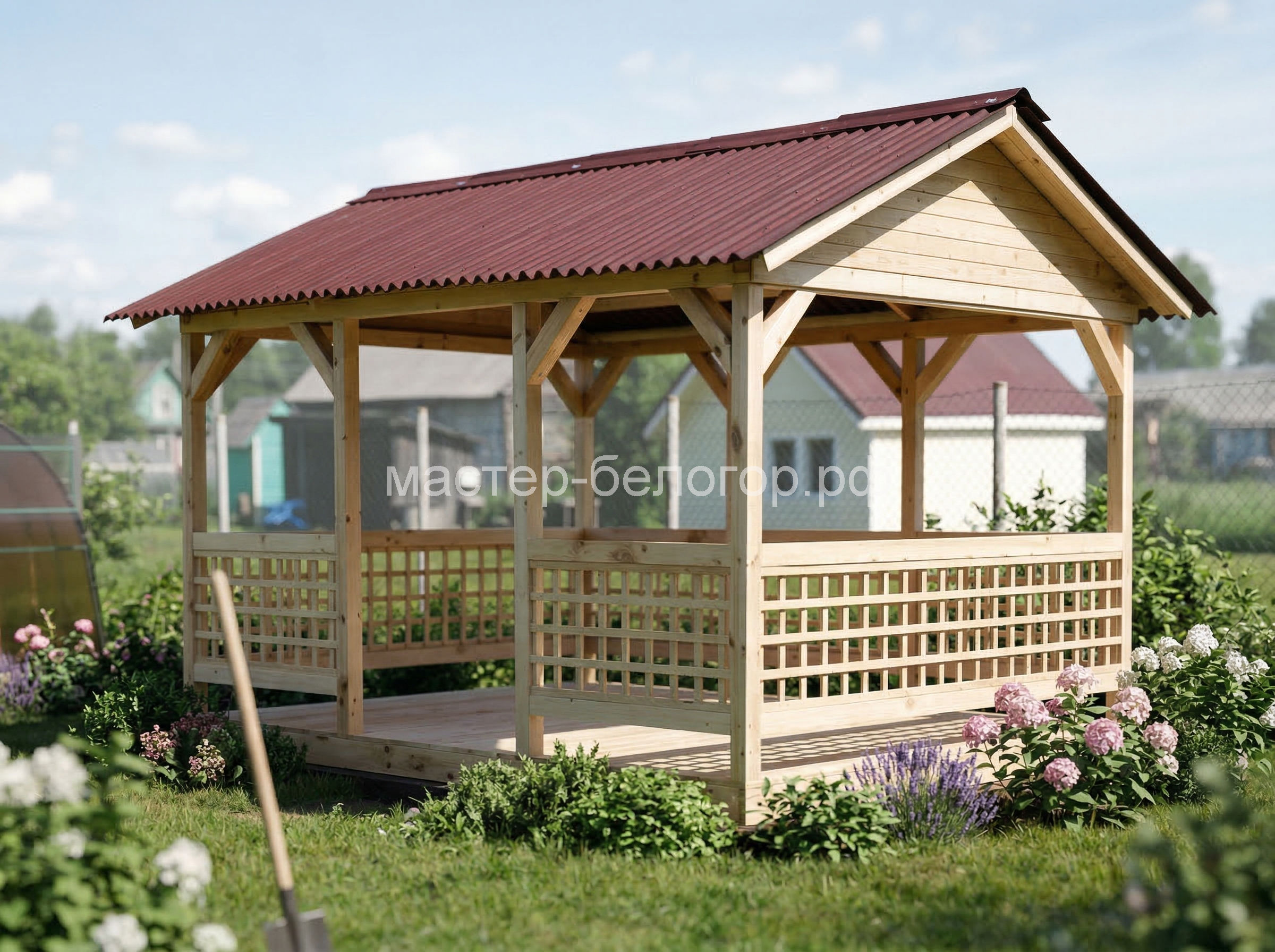 Крыша-ондулин,металлопрофиль или мягкая кровля(в зависимости от модели беседки).Цвет на выбор:красный,коричневый,зеленый.