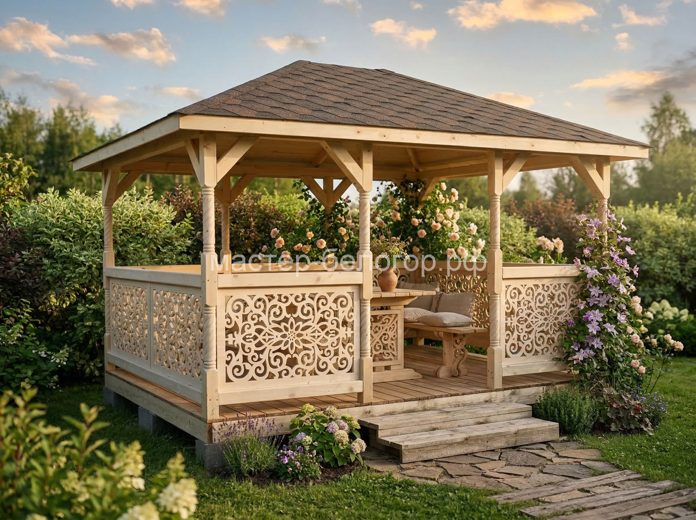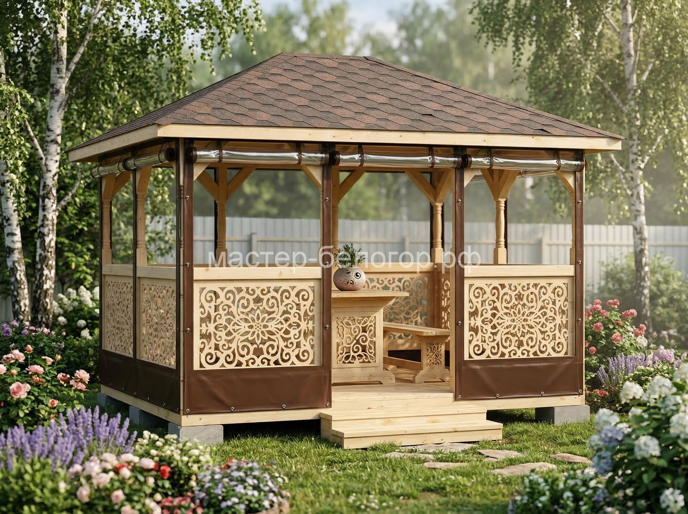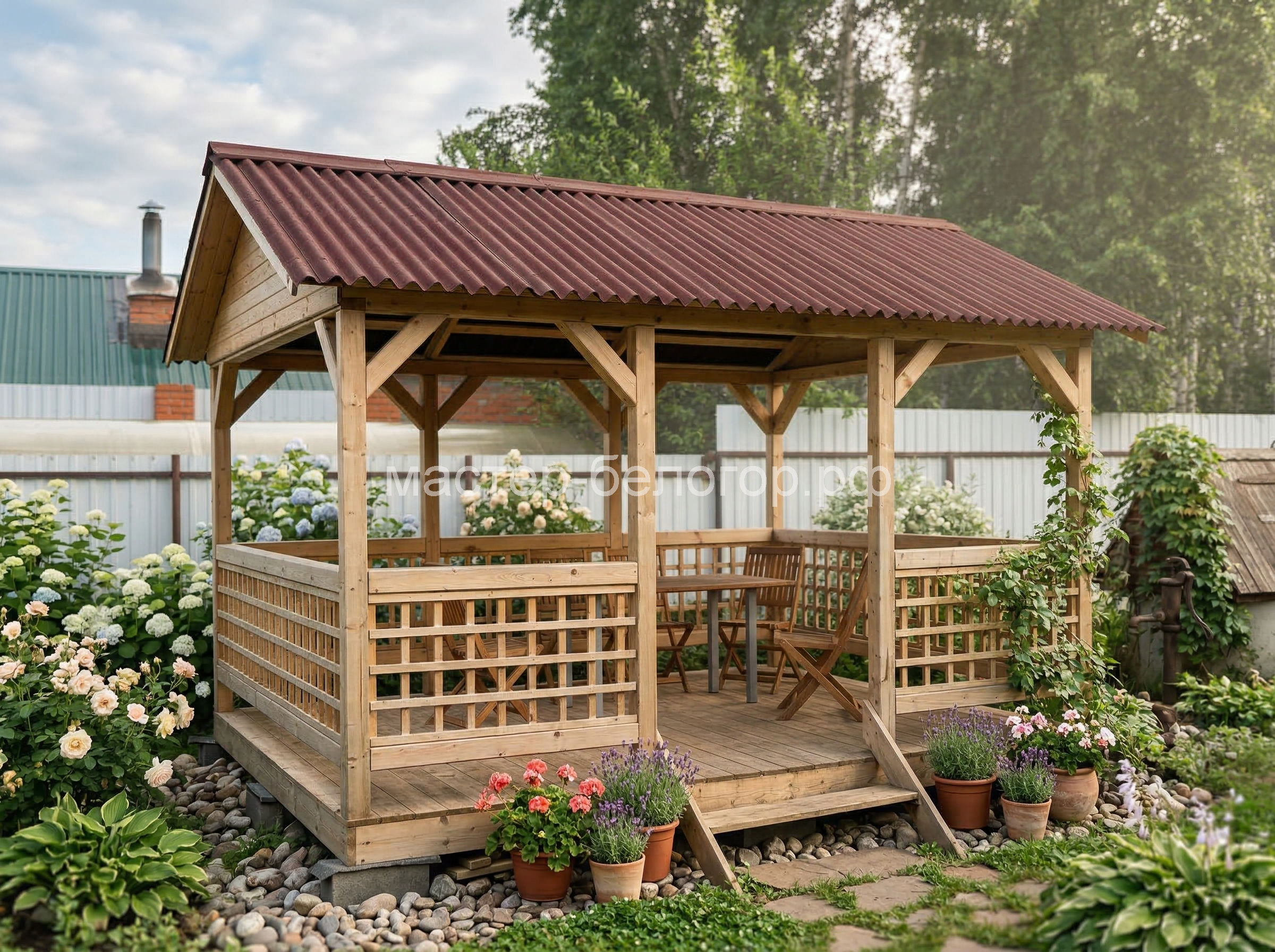 Крыша-ондулин,металлопрофиль или мягкая кровля(в зависимости от модели беседки).Цвет на выбор:красный,коричневый,зеленый.