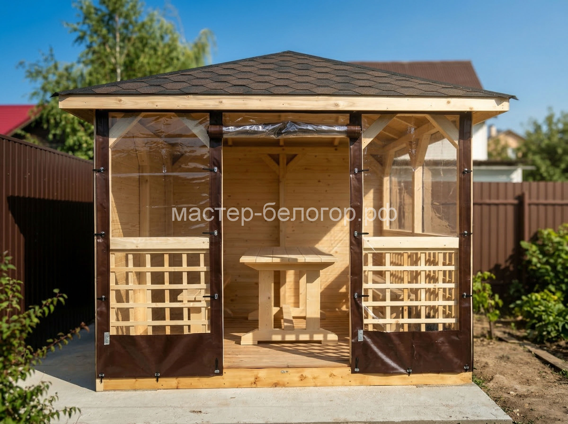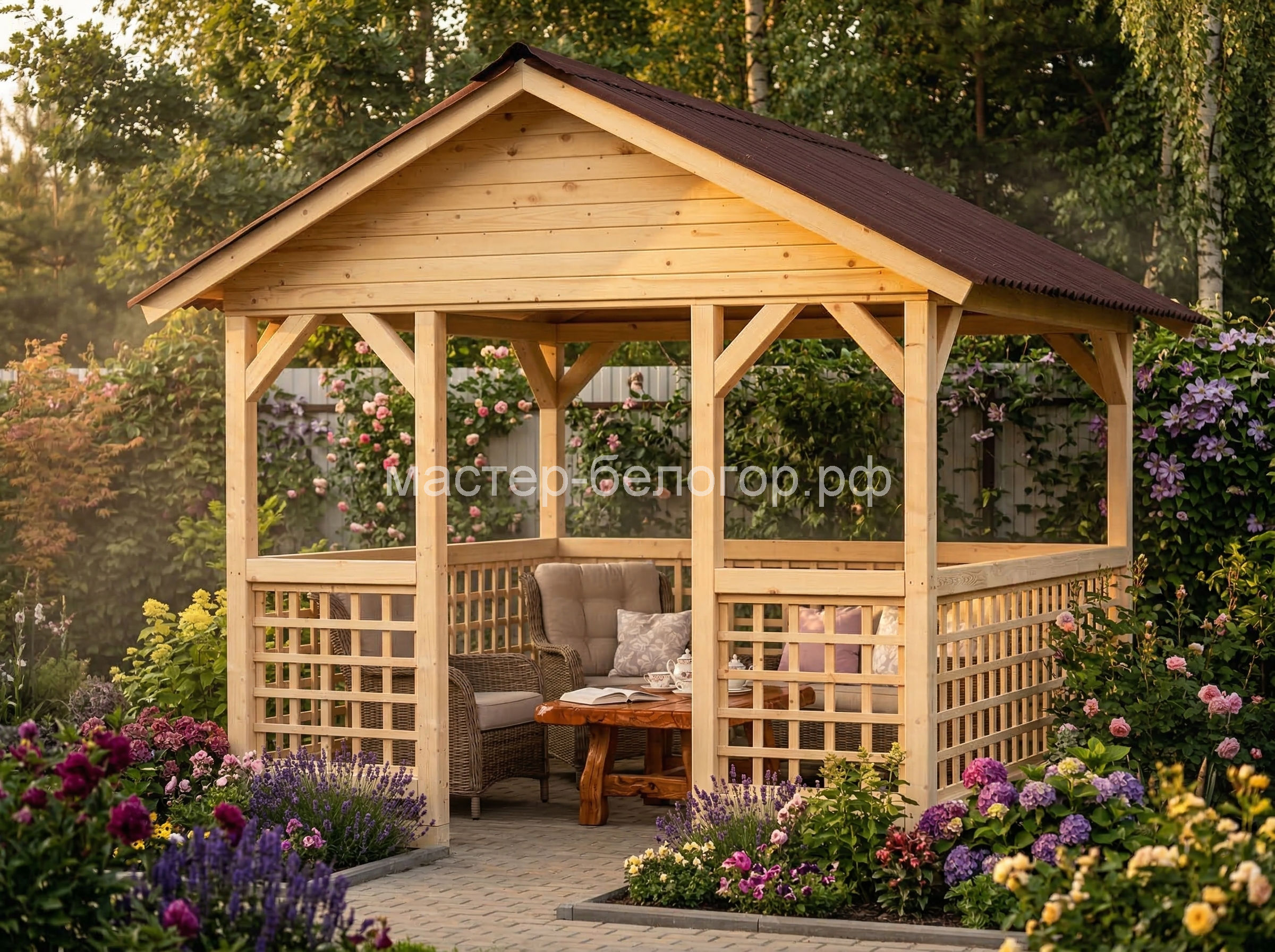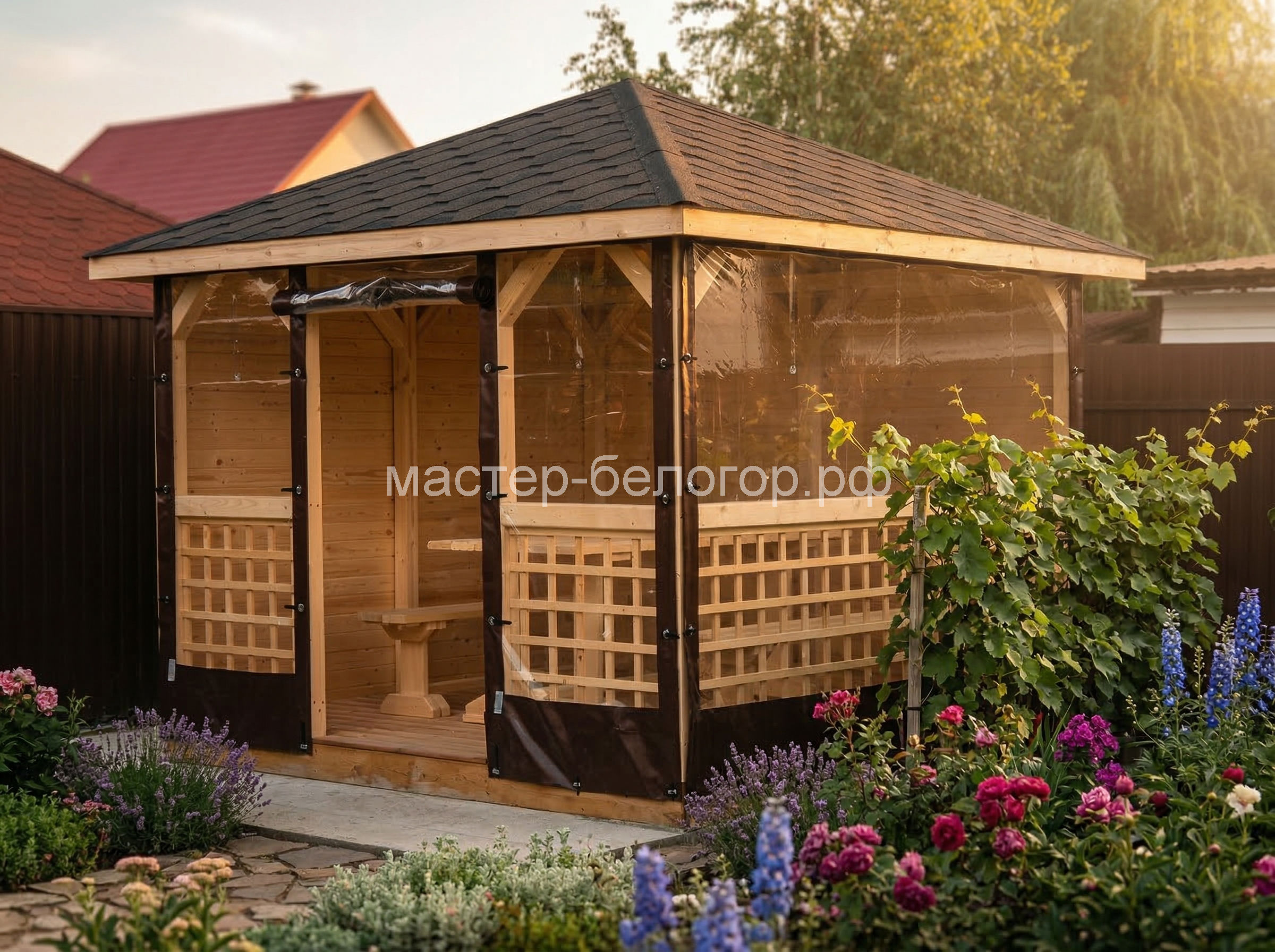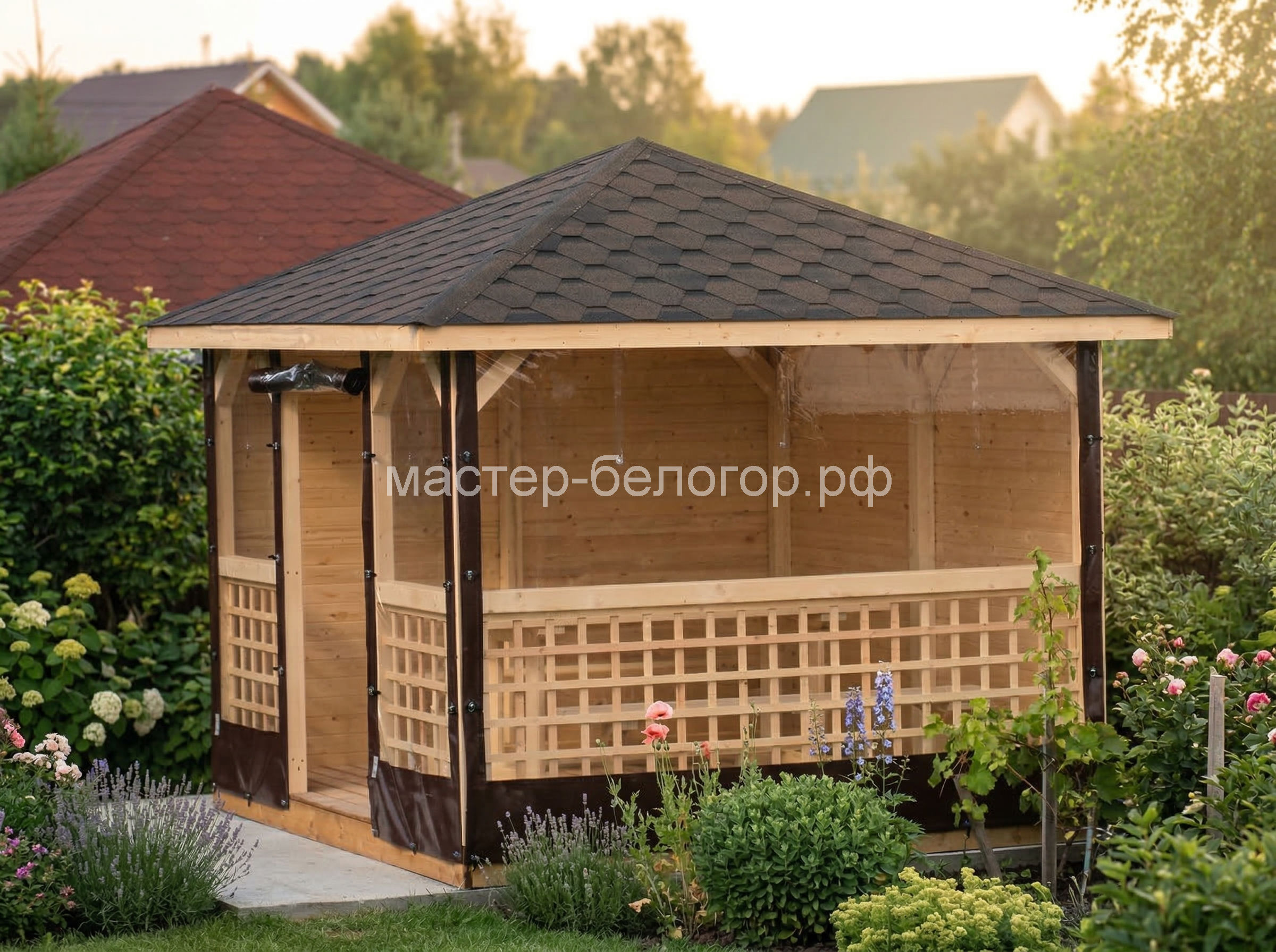Крыша-ондулин,металлопрофиль или мягкая кровля(в зависимости от модели беседки).Цвет на выбор:красный,коричневый,зеленый.