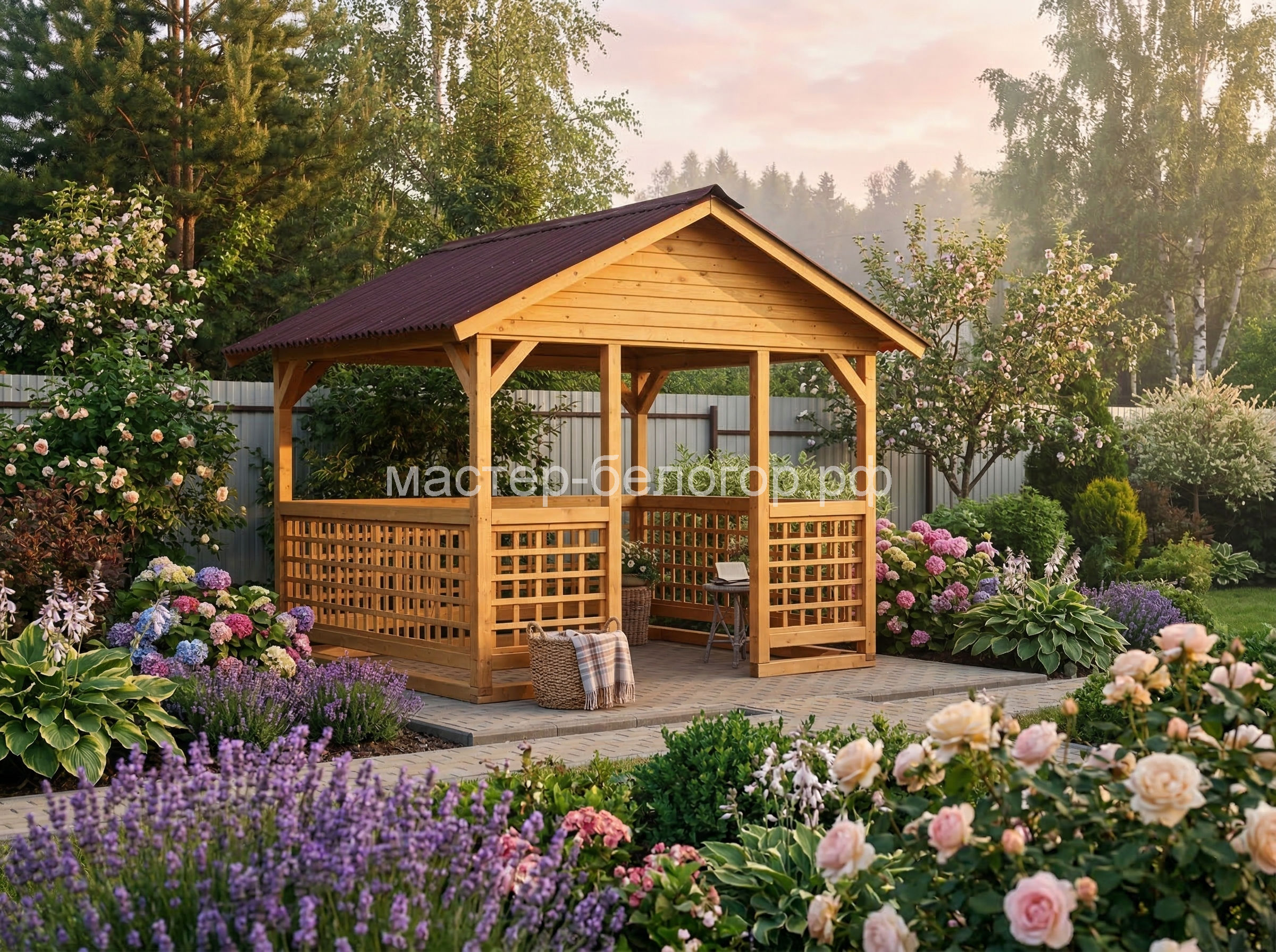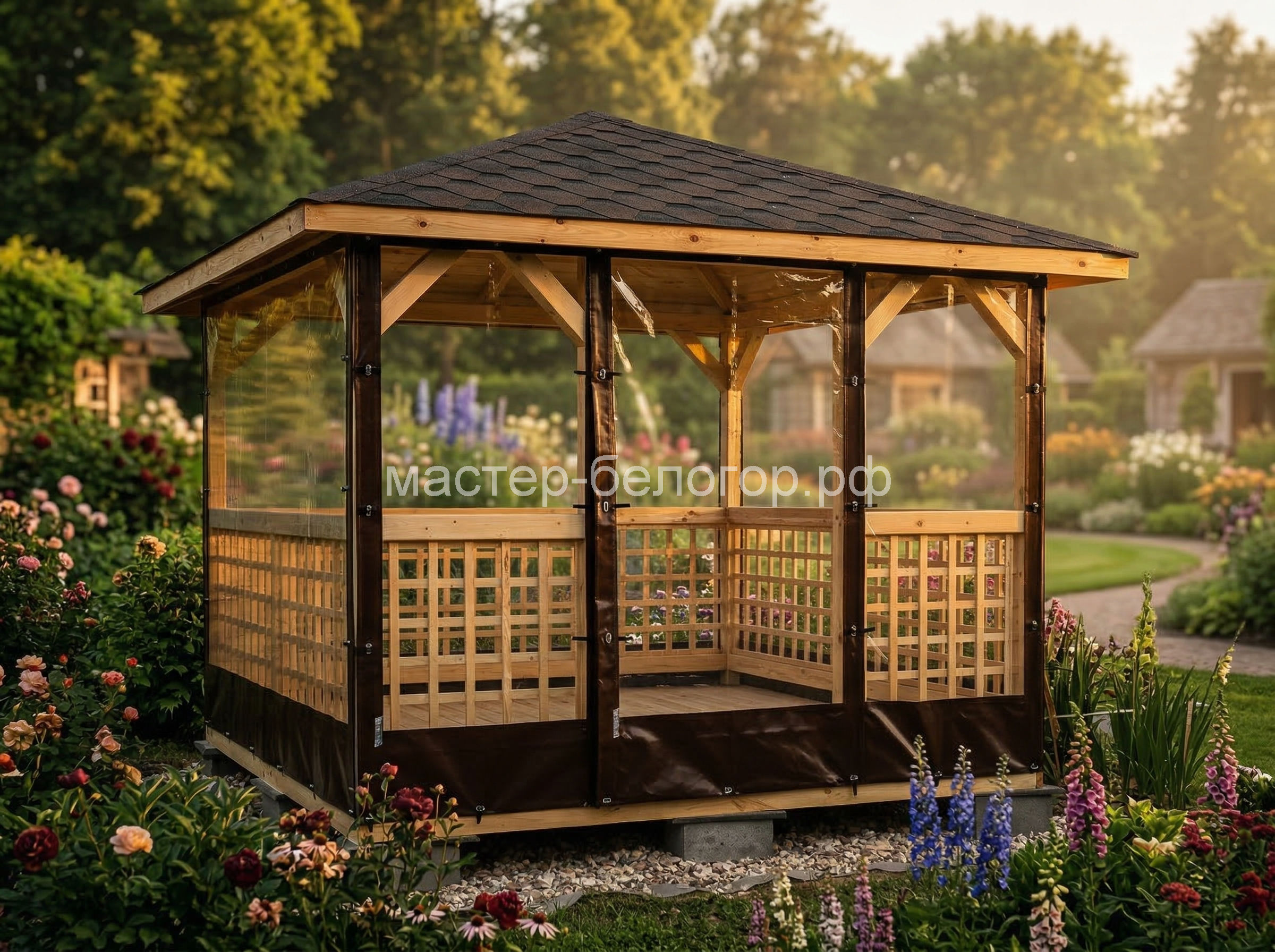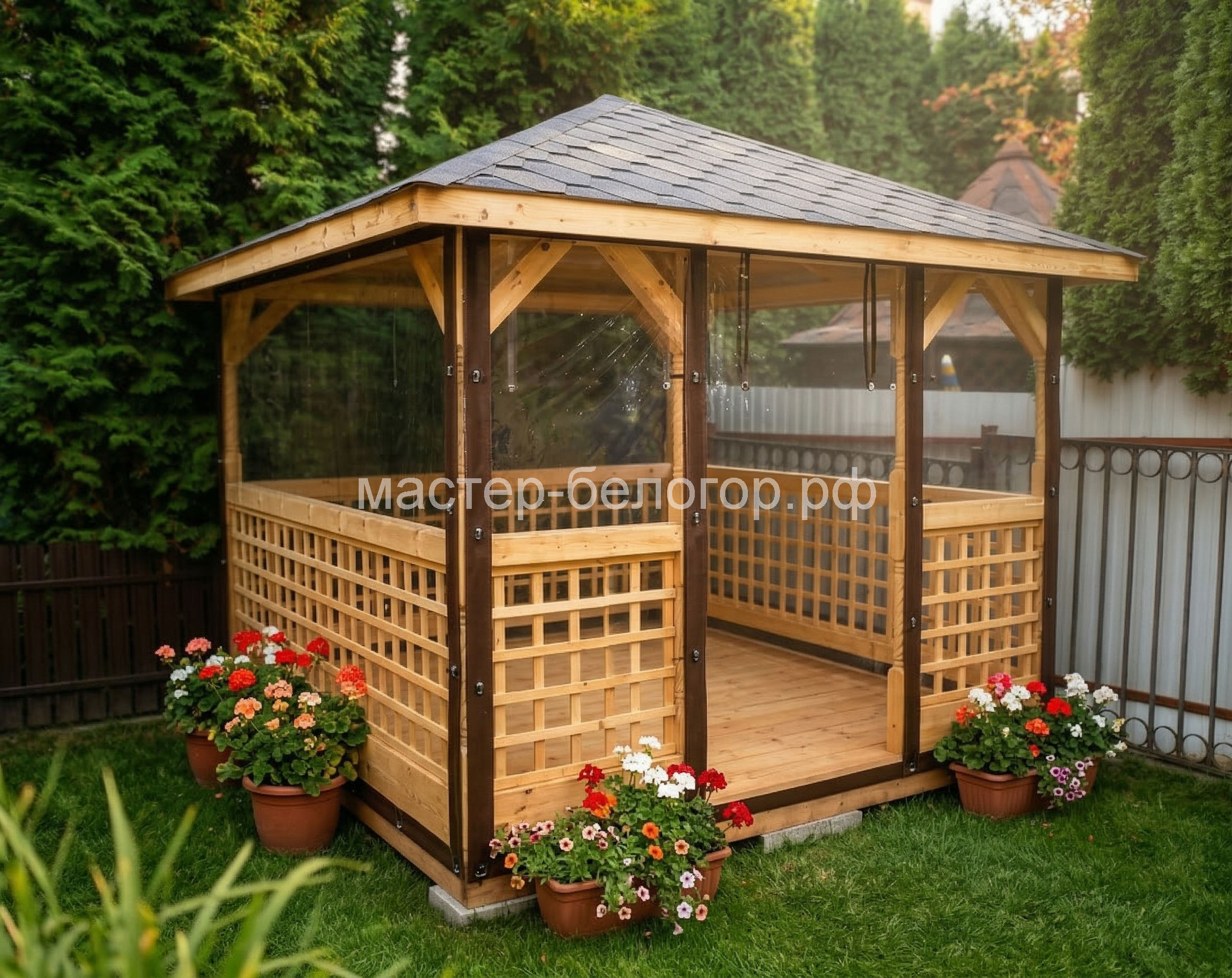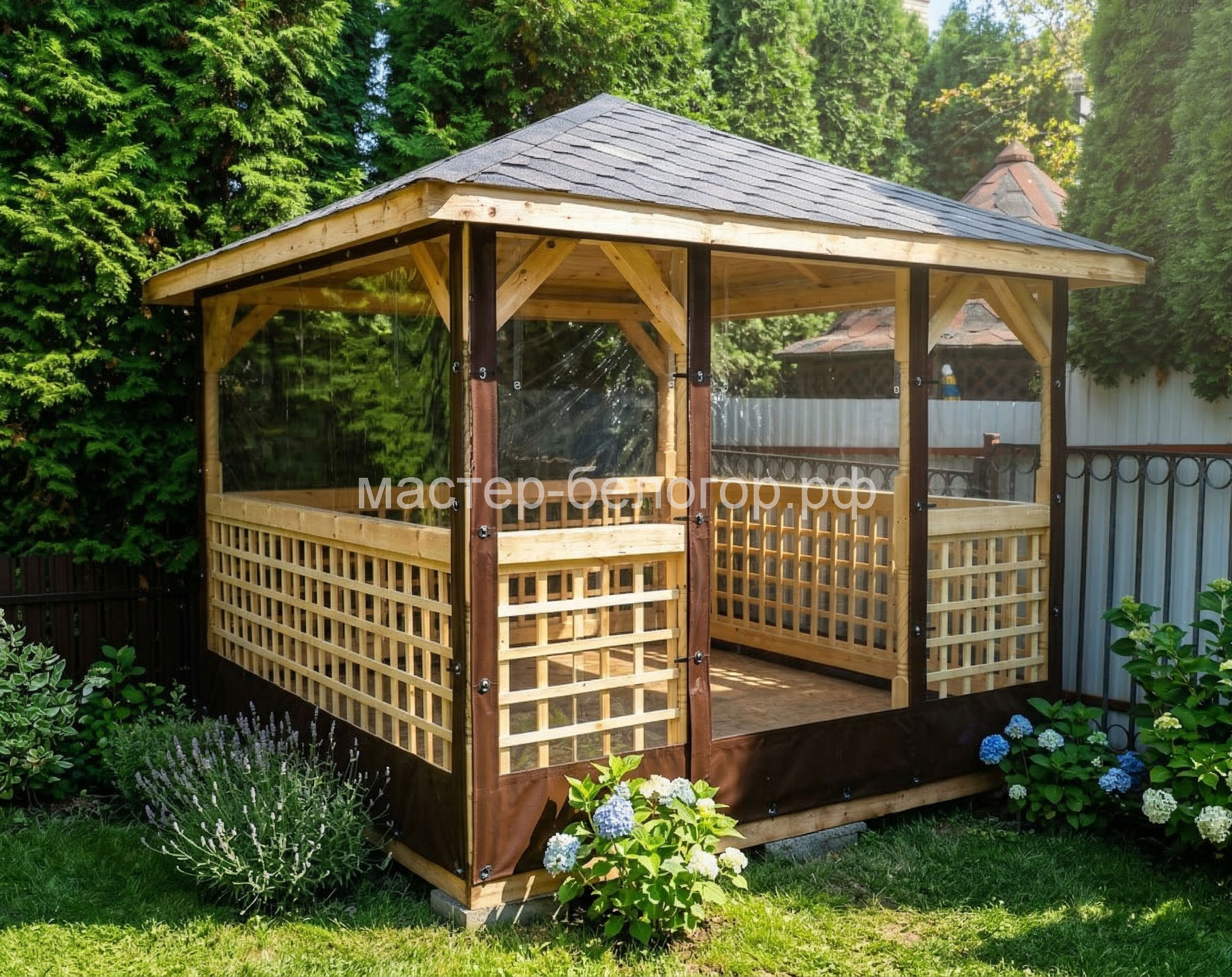 Крыша-ондулин,металлопрофиль или мягкая кровля(в зависимости от модели беседки).Цвет на выбор:красный,коричневый,зеленый.