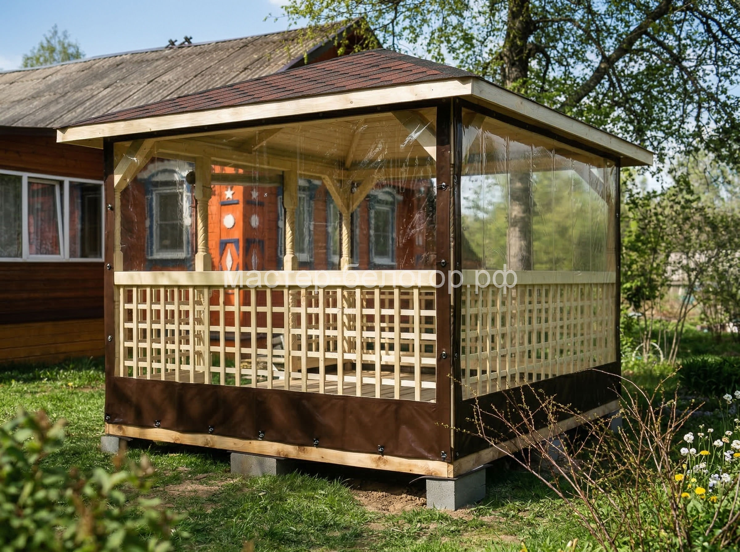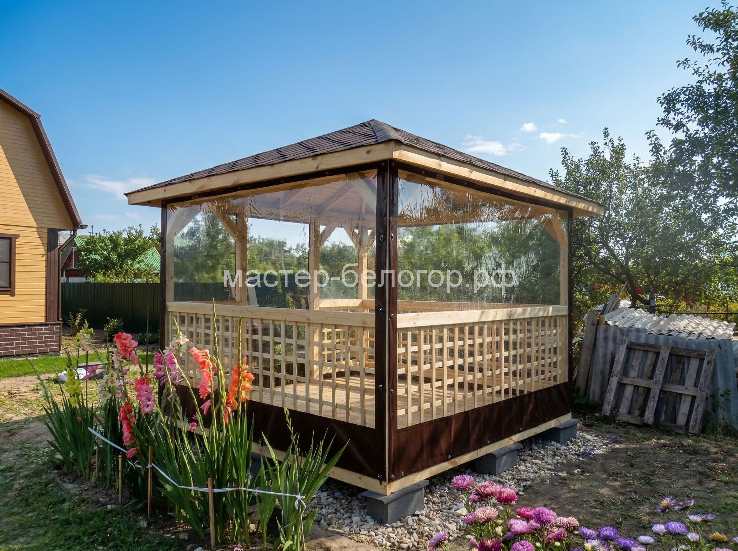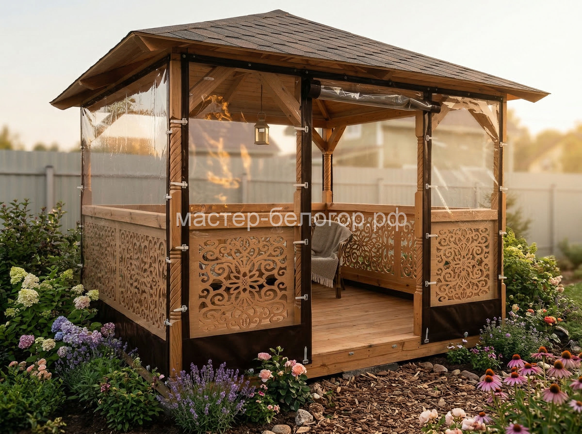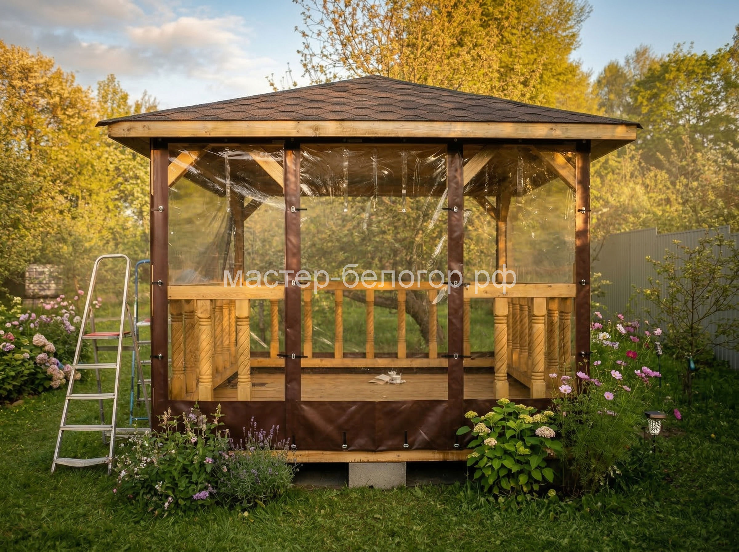 Крыша-ондулин,металлопрофиль или мягкая кровля(в зависимости от модели беседки).Цвет на выбор:красный,коричневый,зеленый.