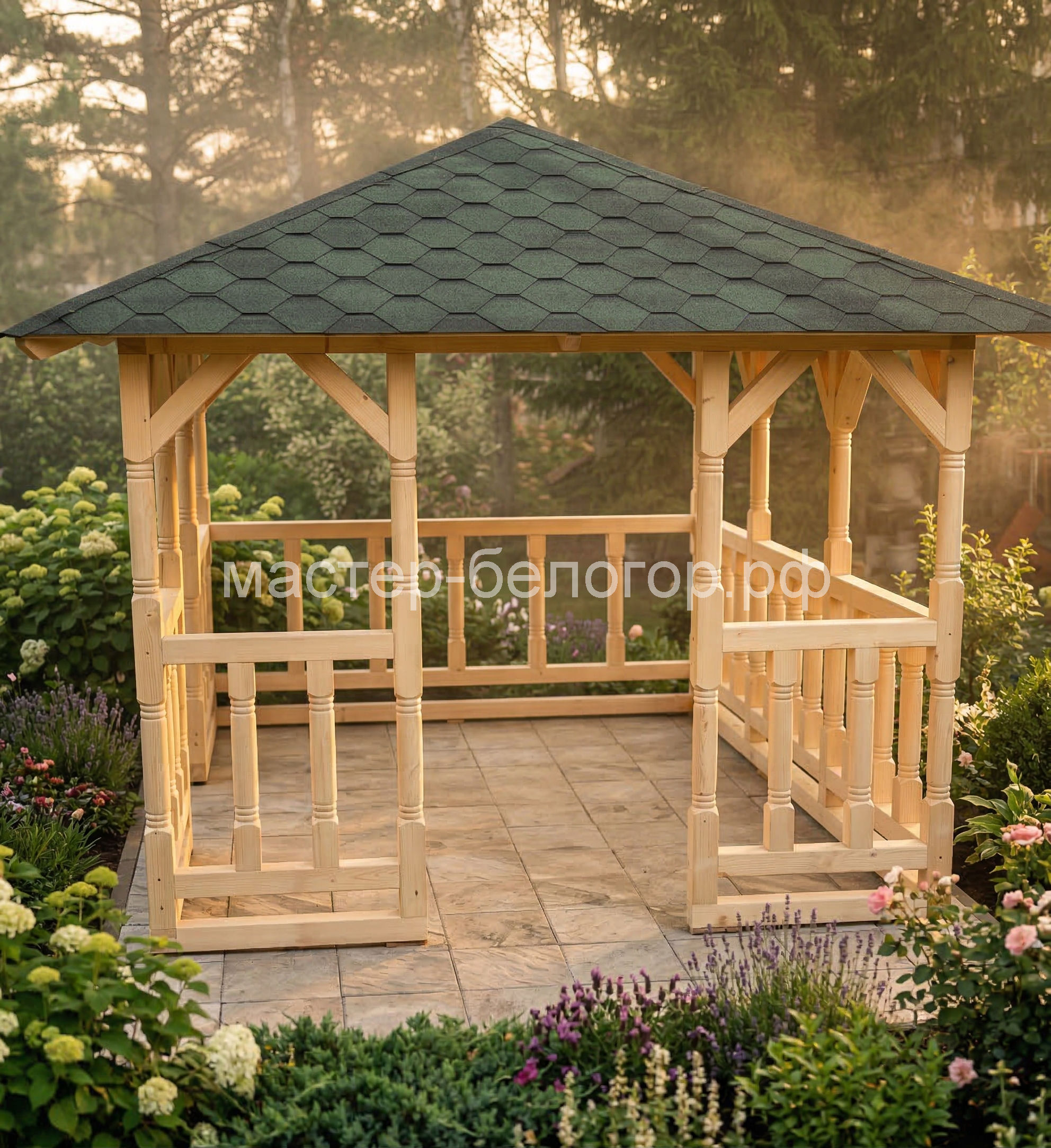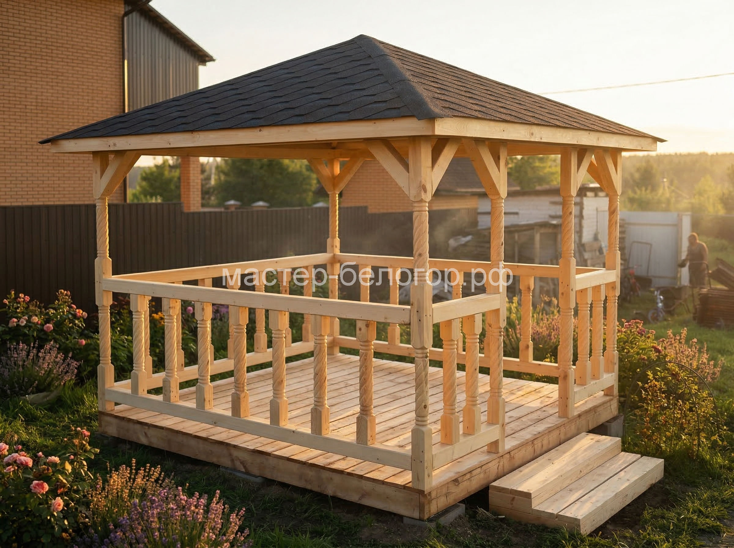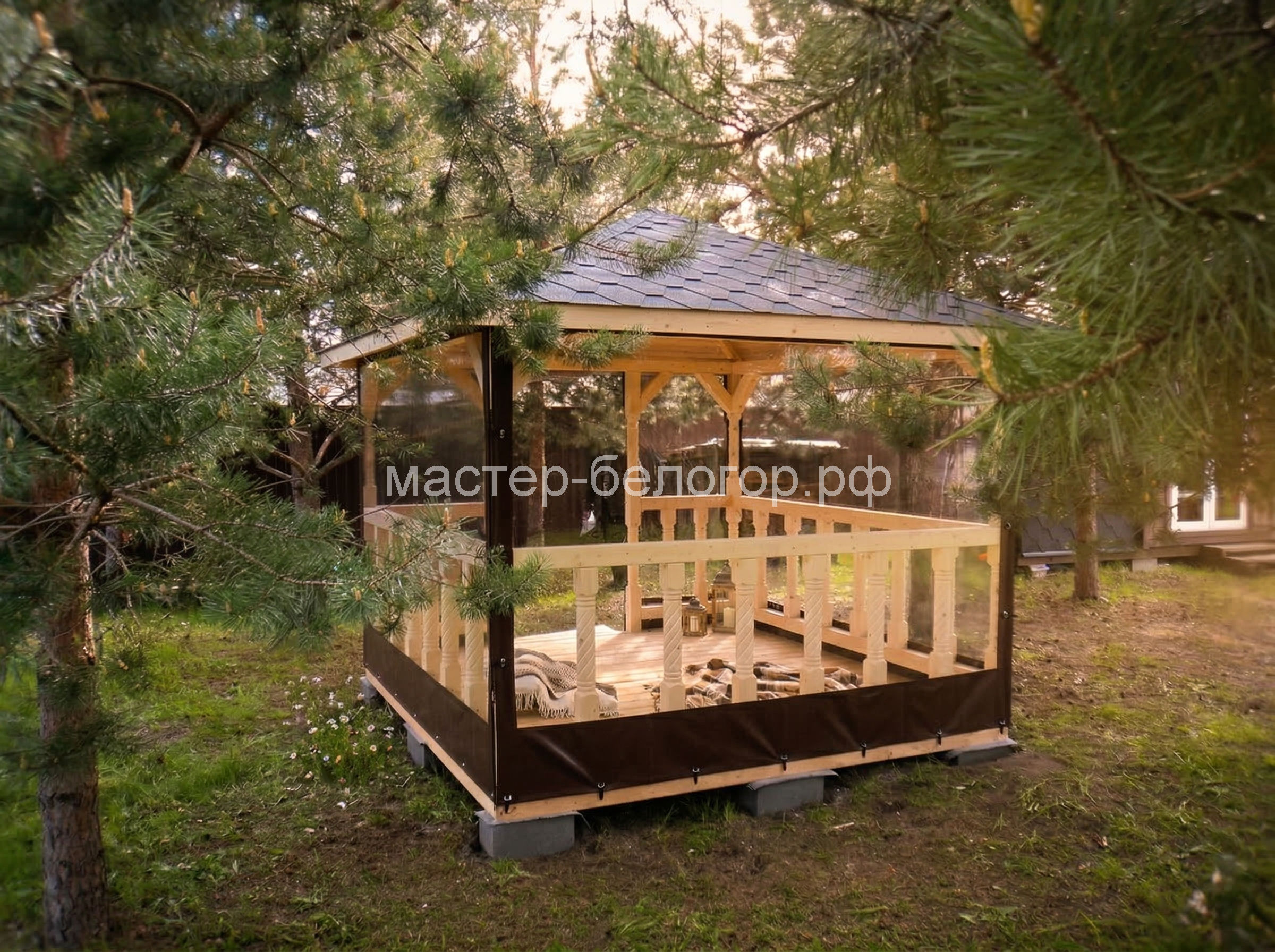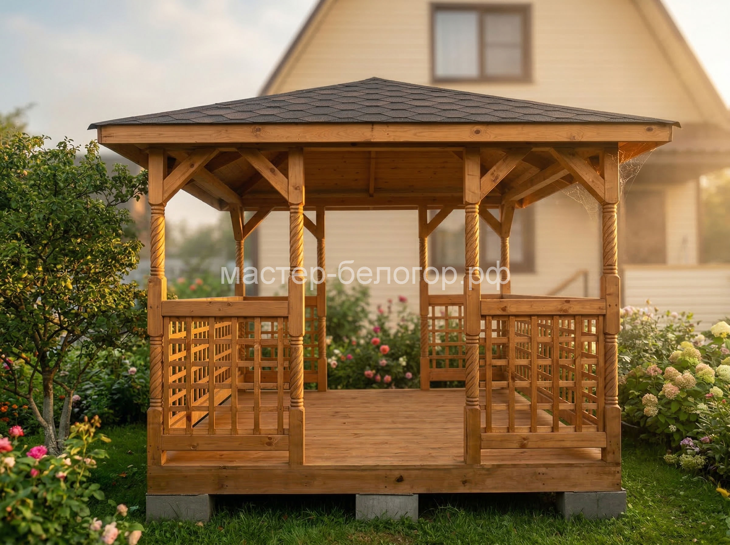 4х-гранная крыша,мягкая кровля,столбы,балясины.