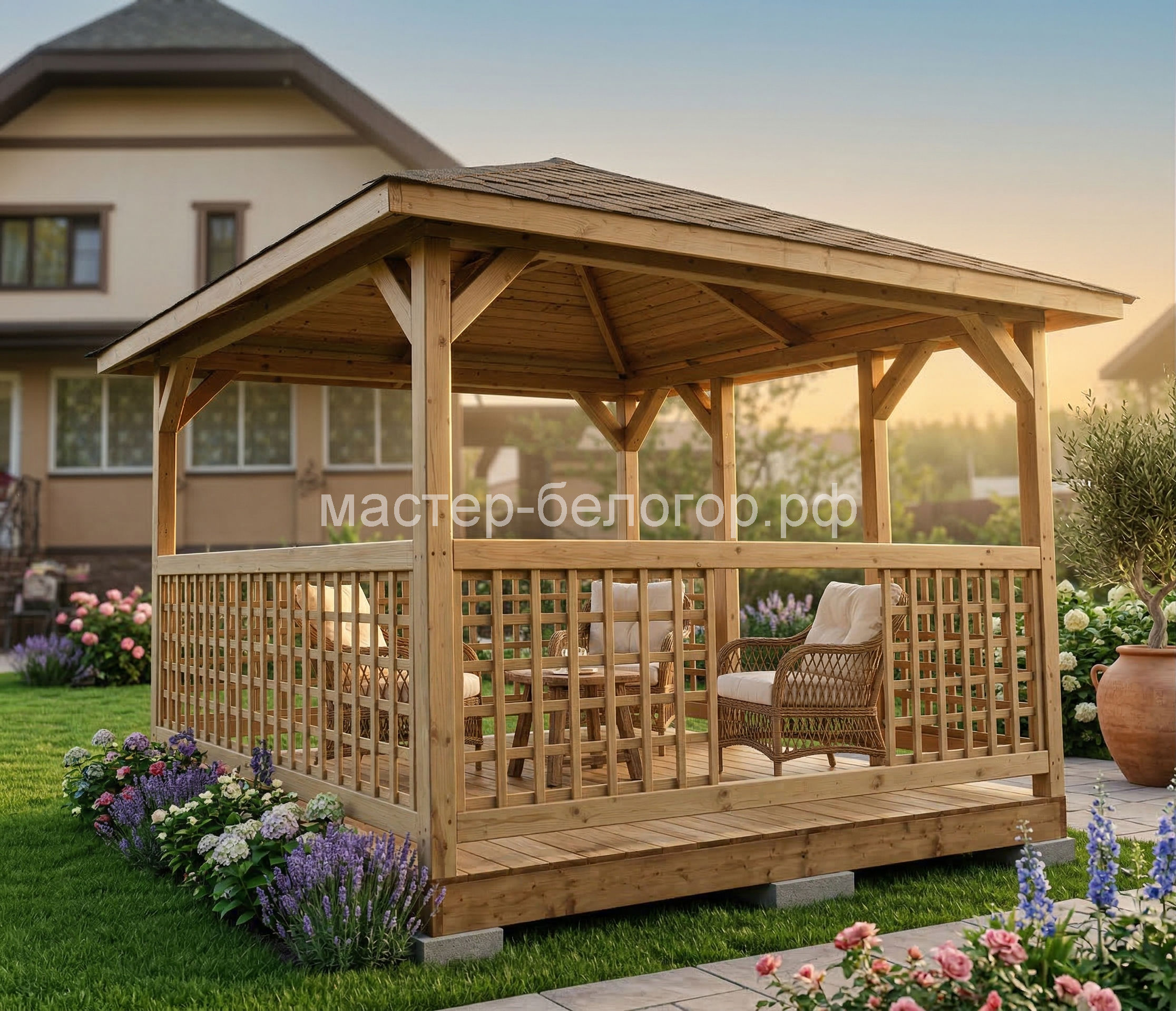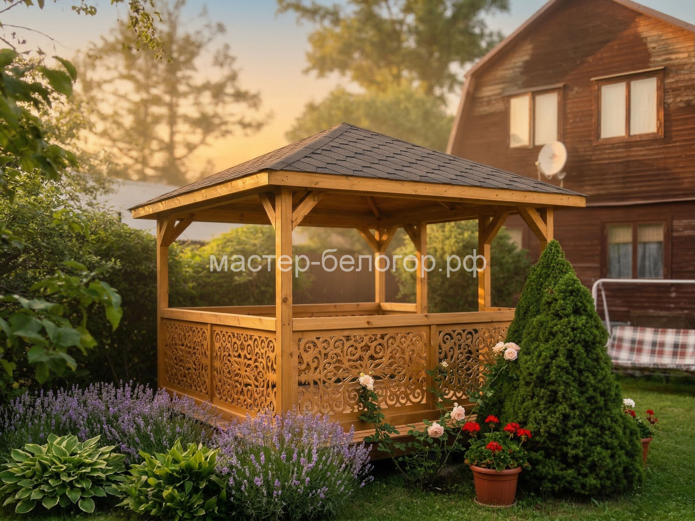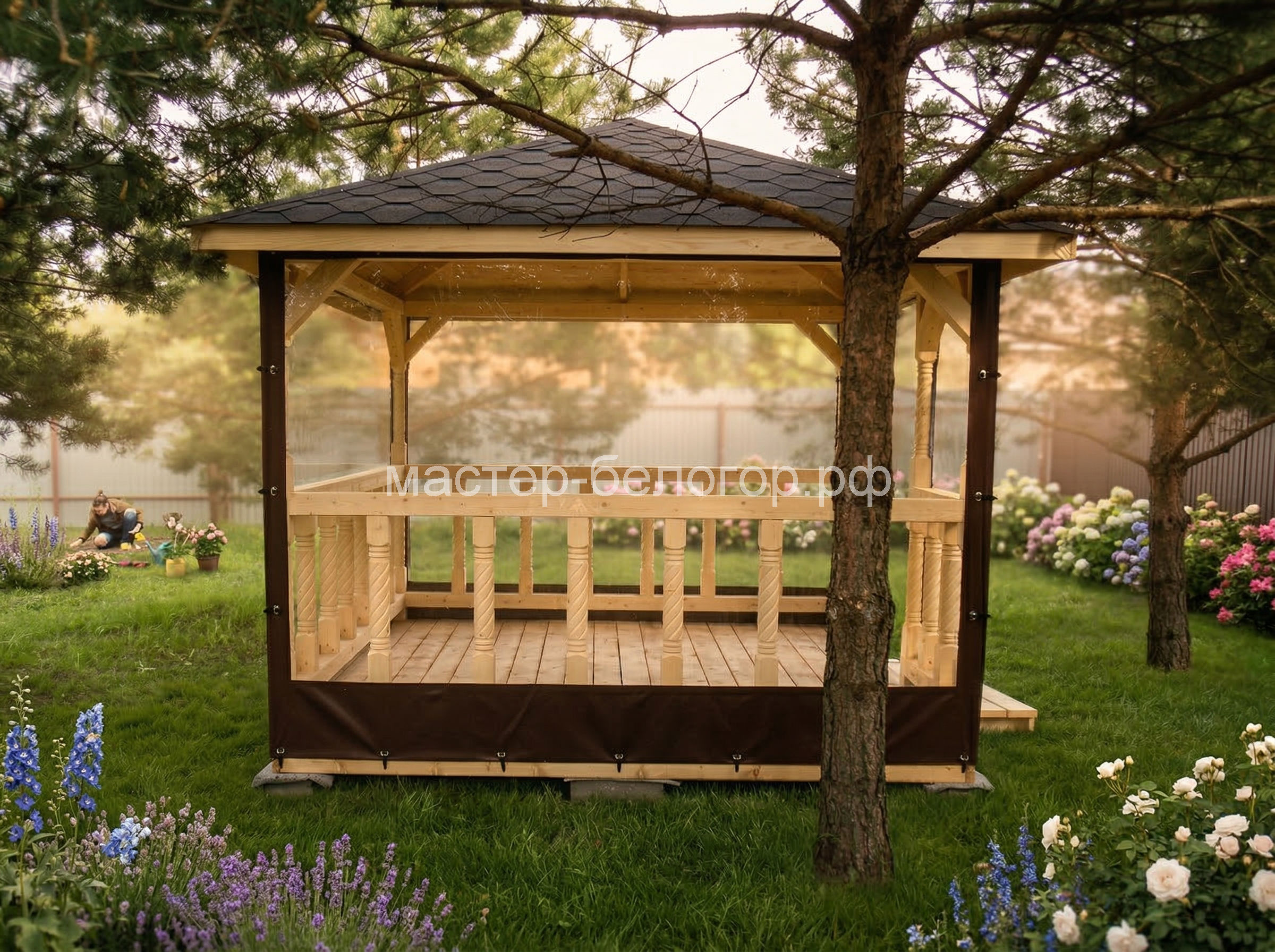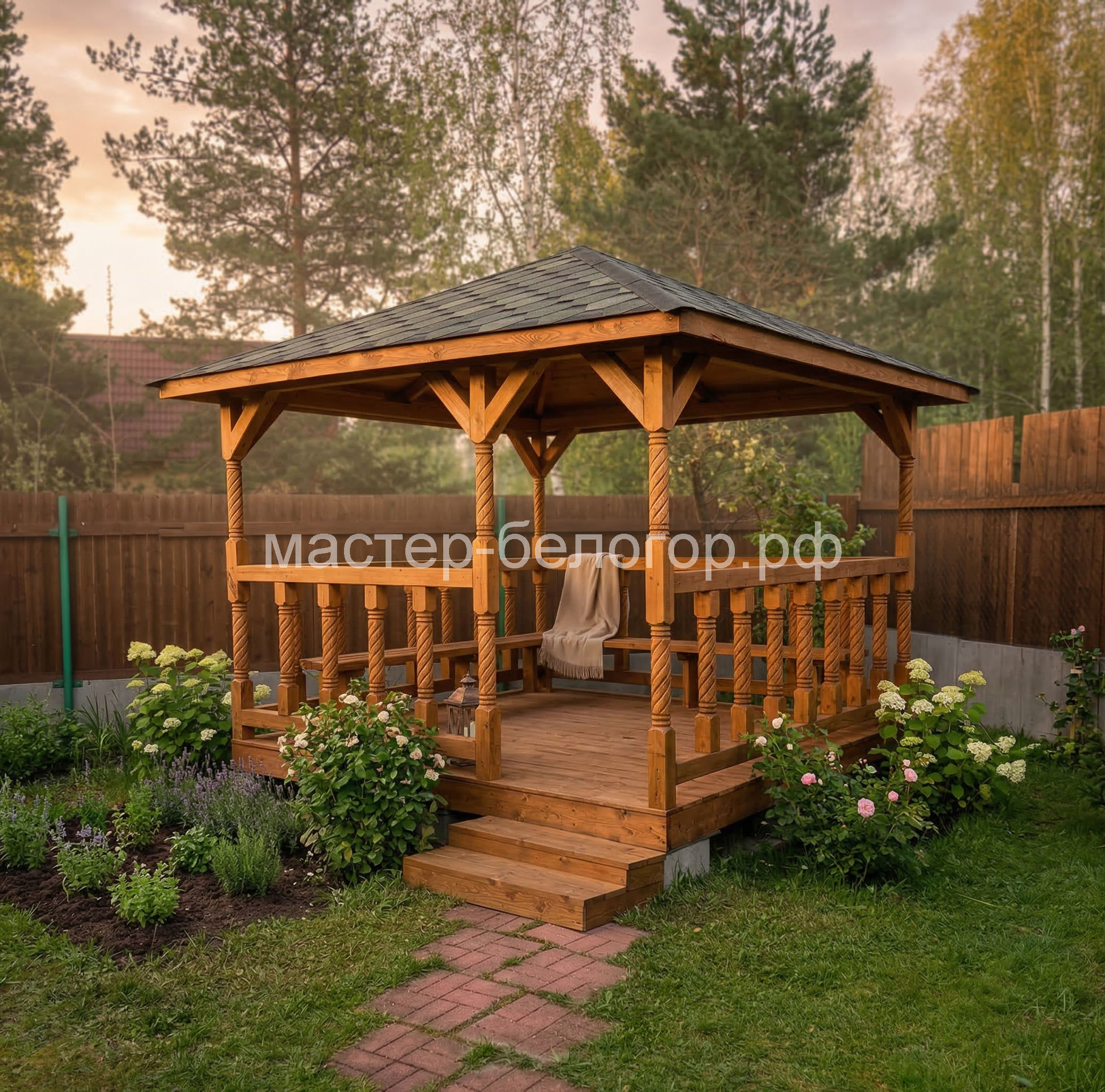 4х-гранная крыша,мягкая кровля,столбы,балясины.