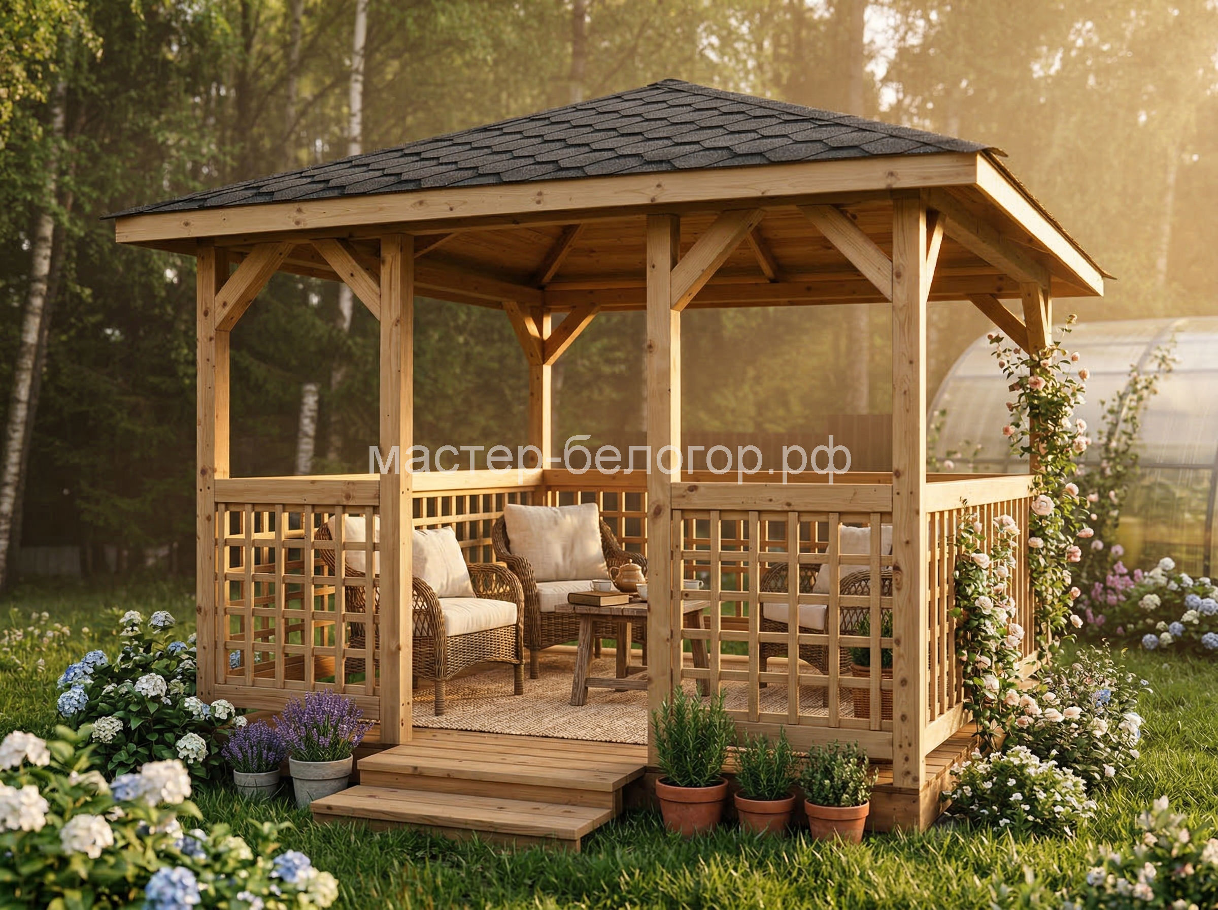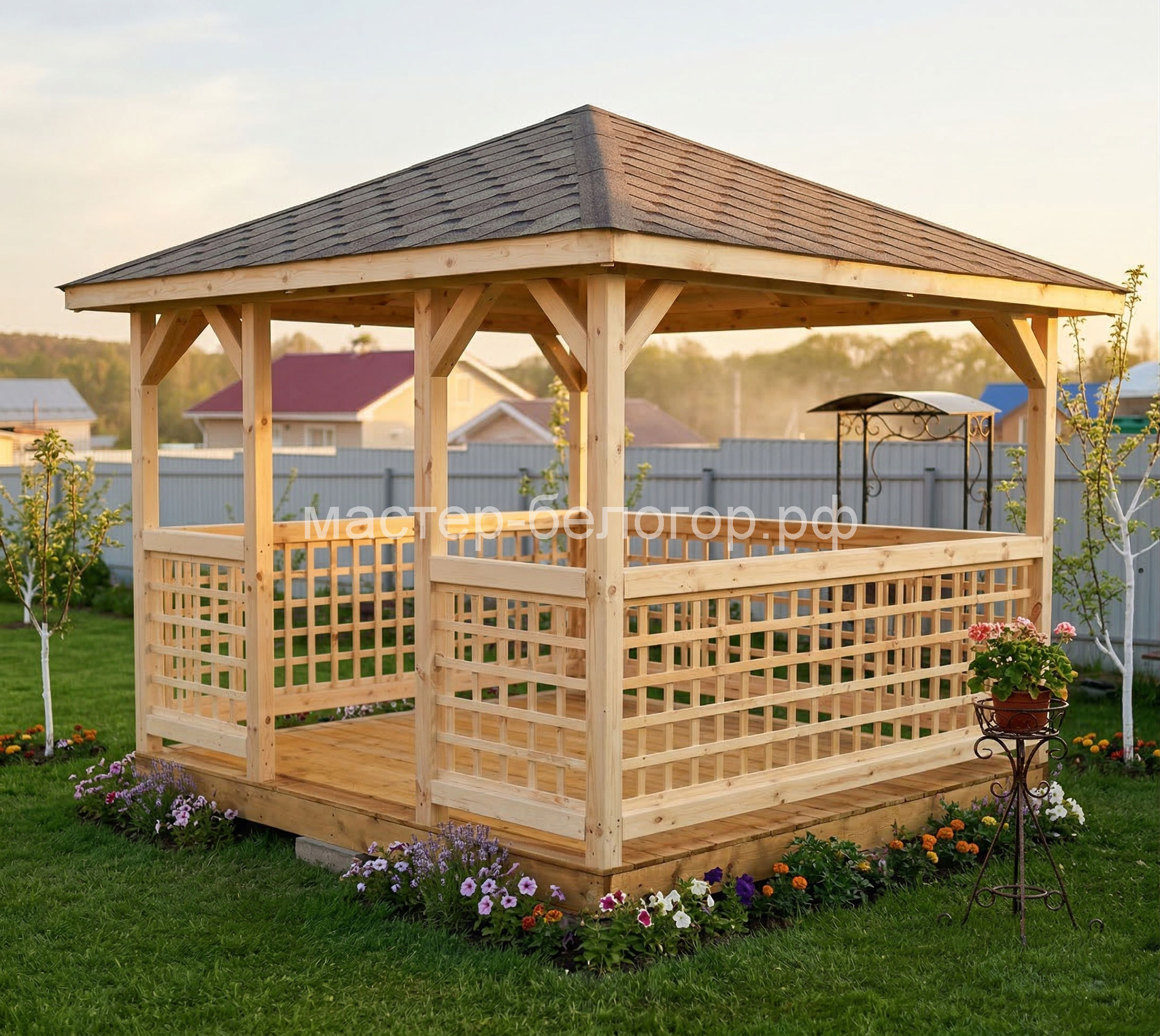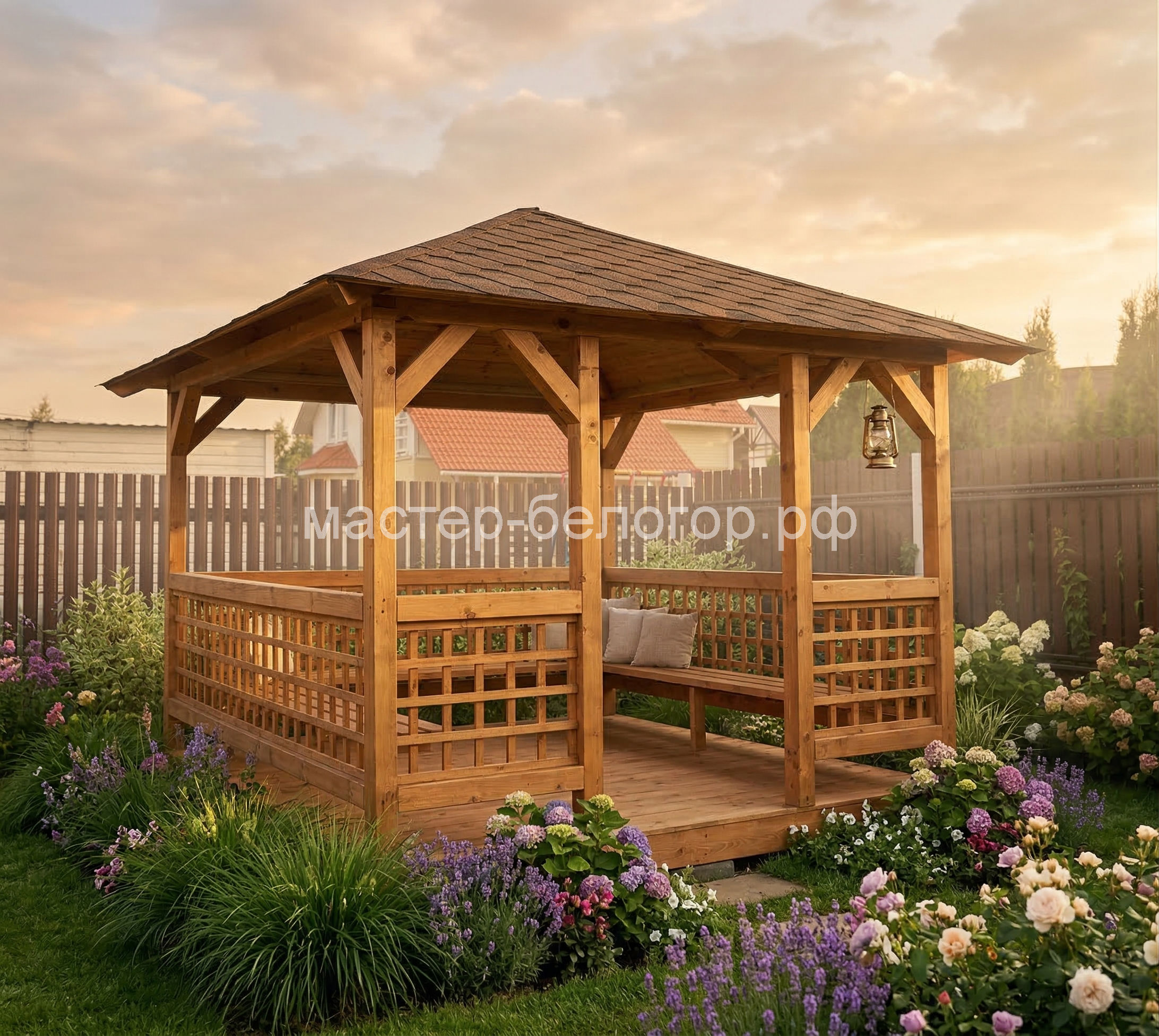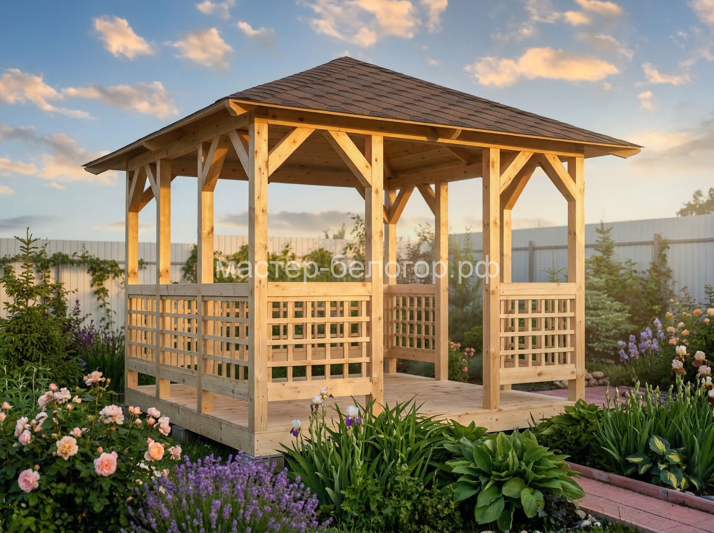 4х-гранная крыша,мягкая кровля,столбы,балясины.