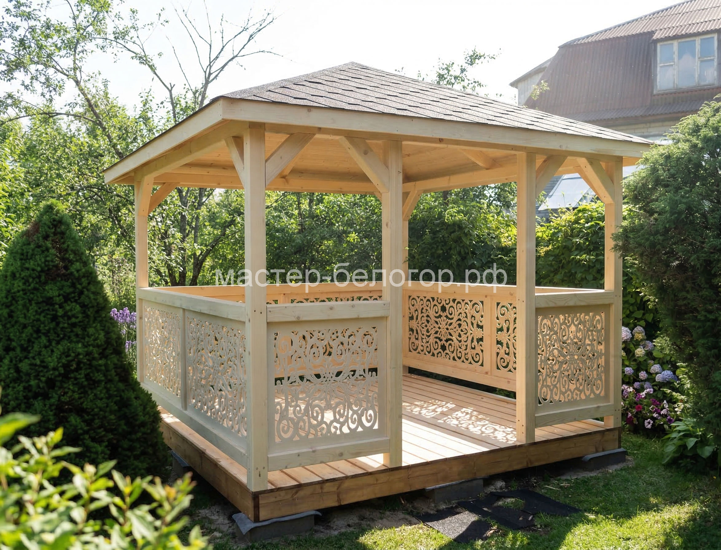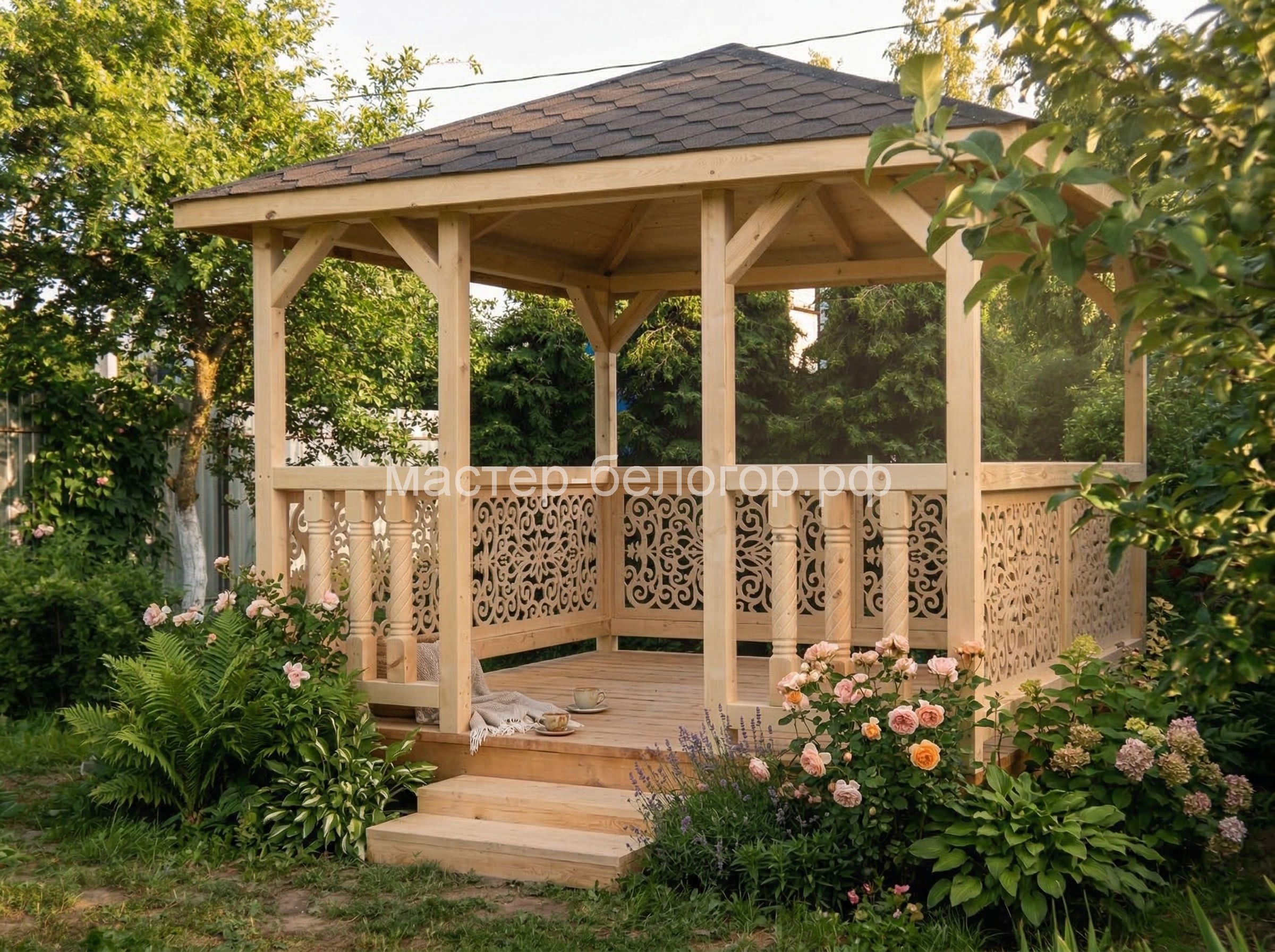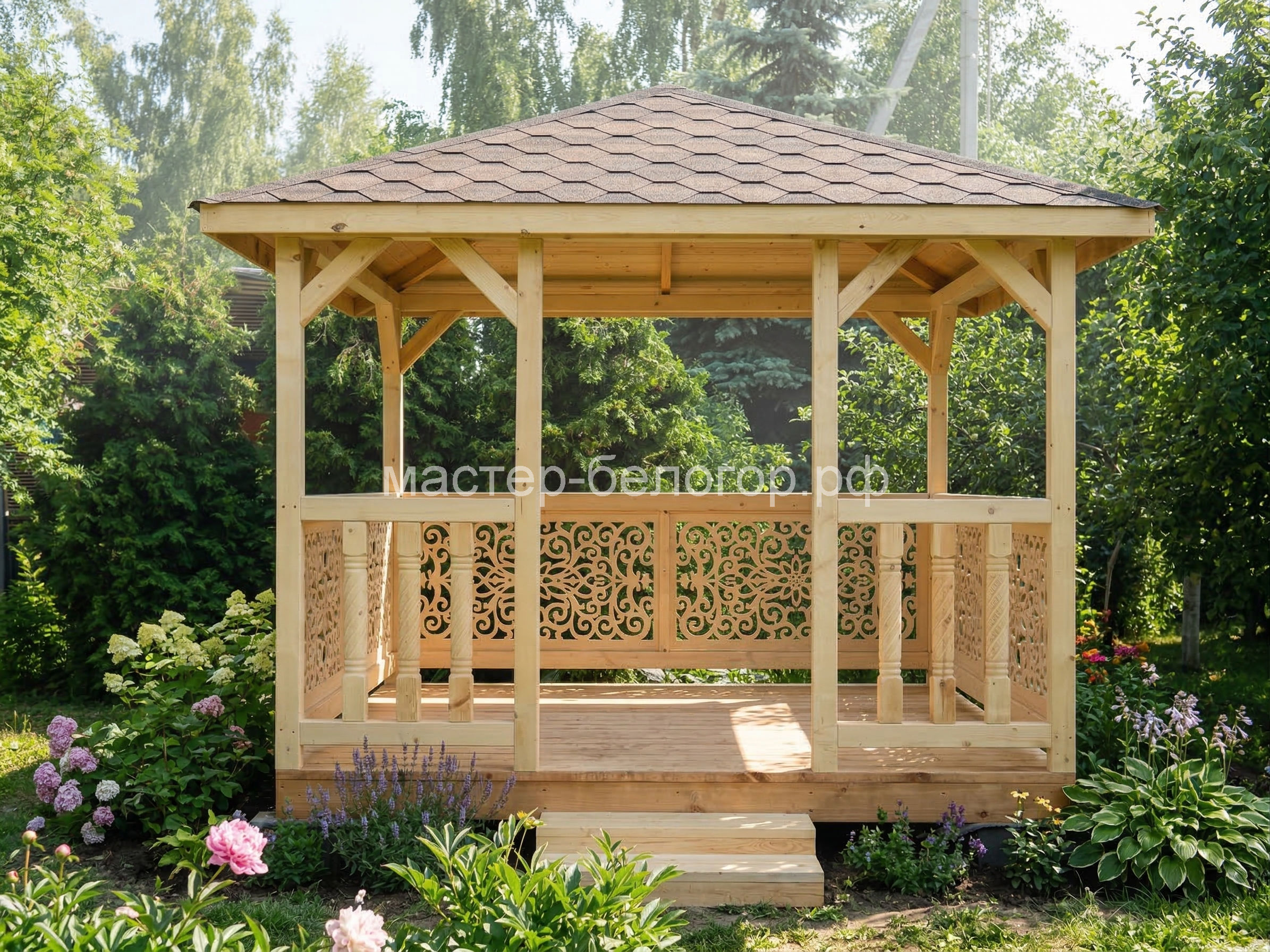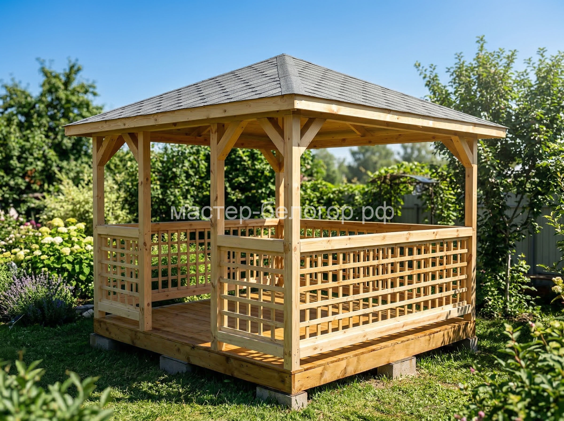 4х-гранная крыша,мягкая кровля,столбы,балясины.