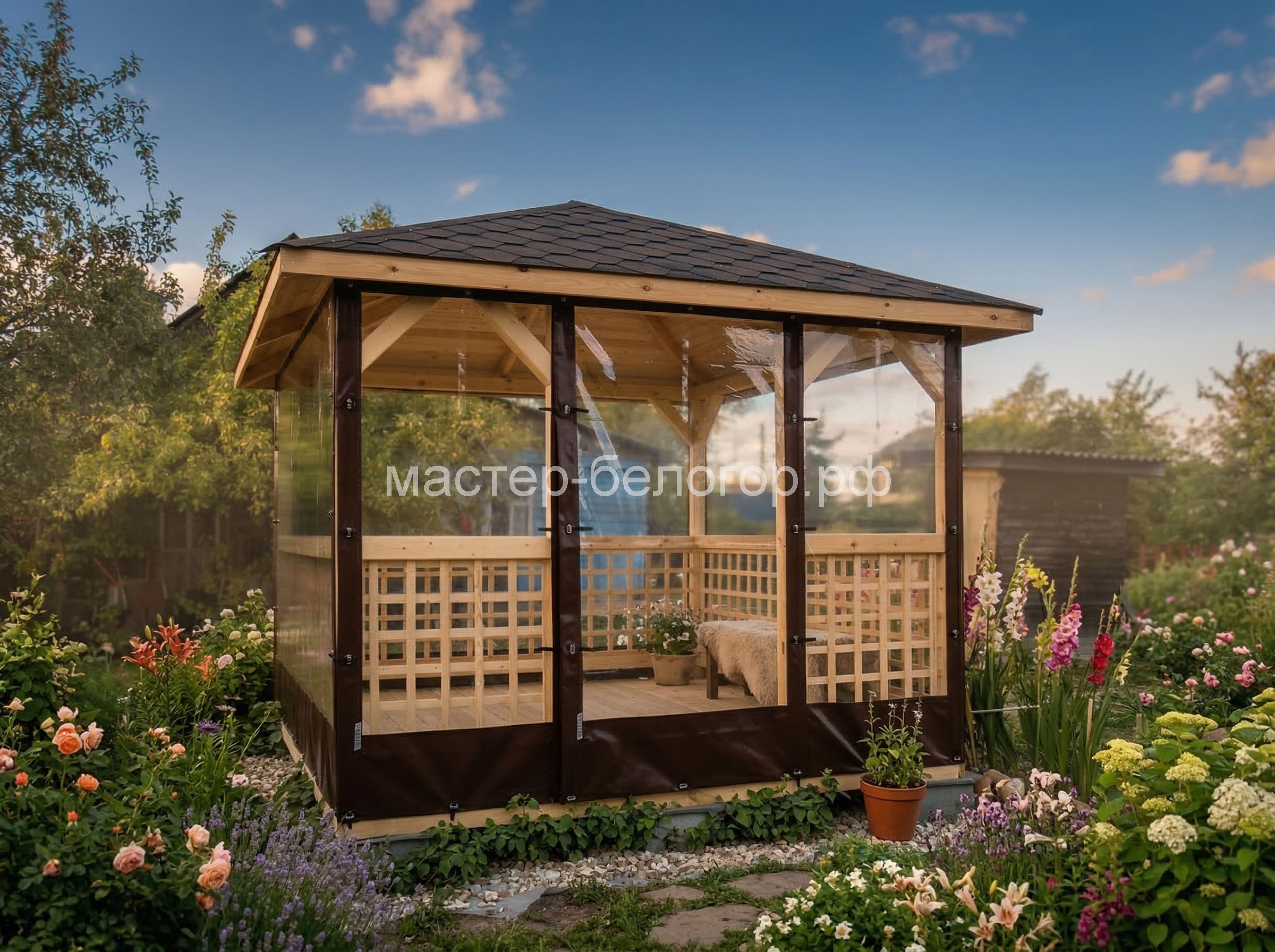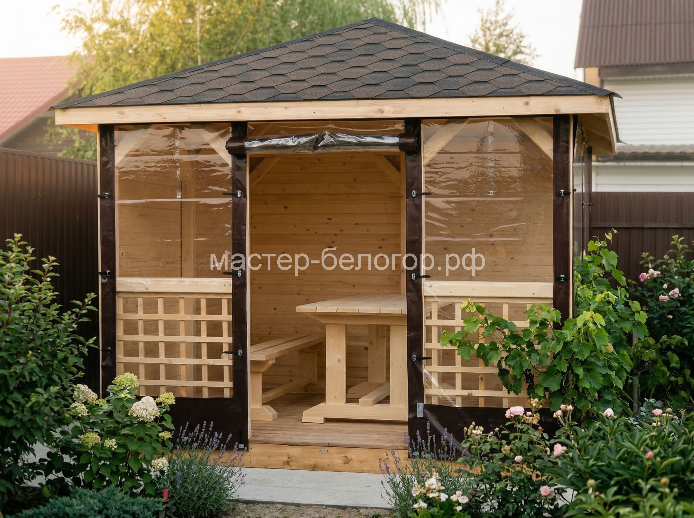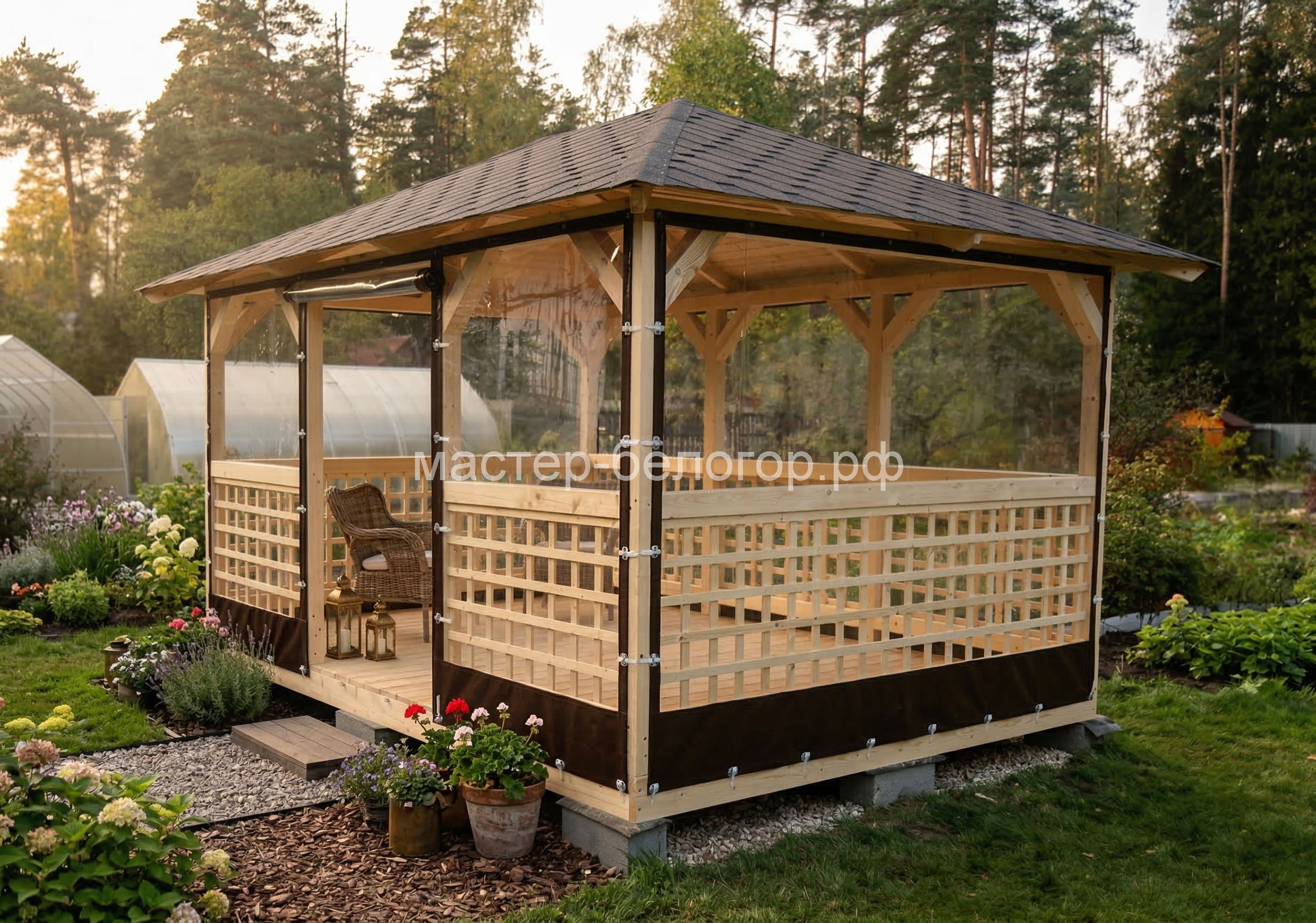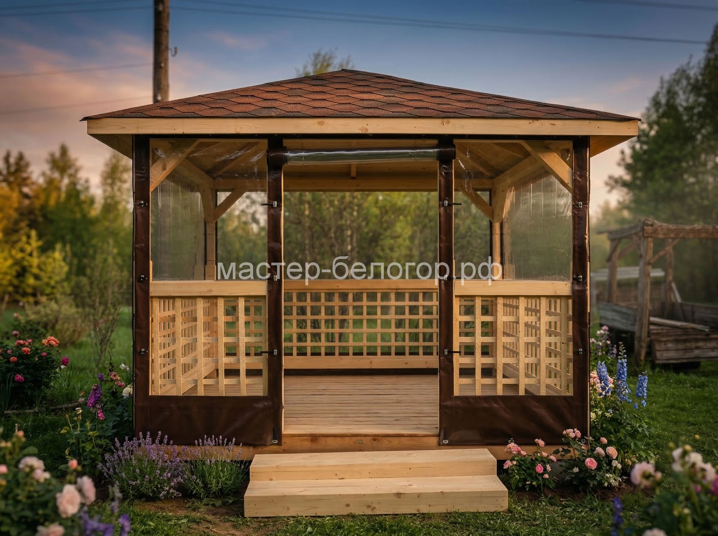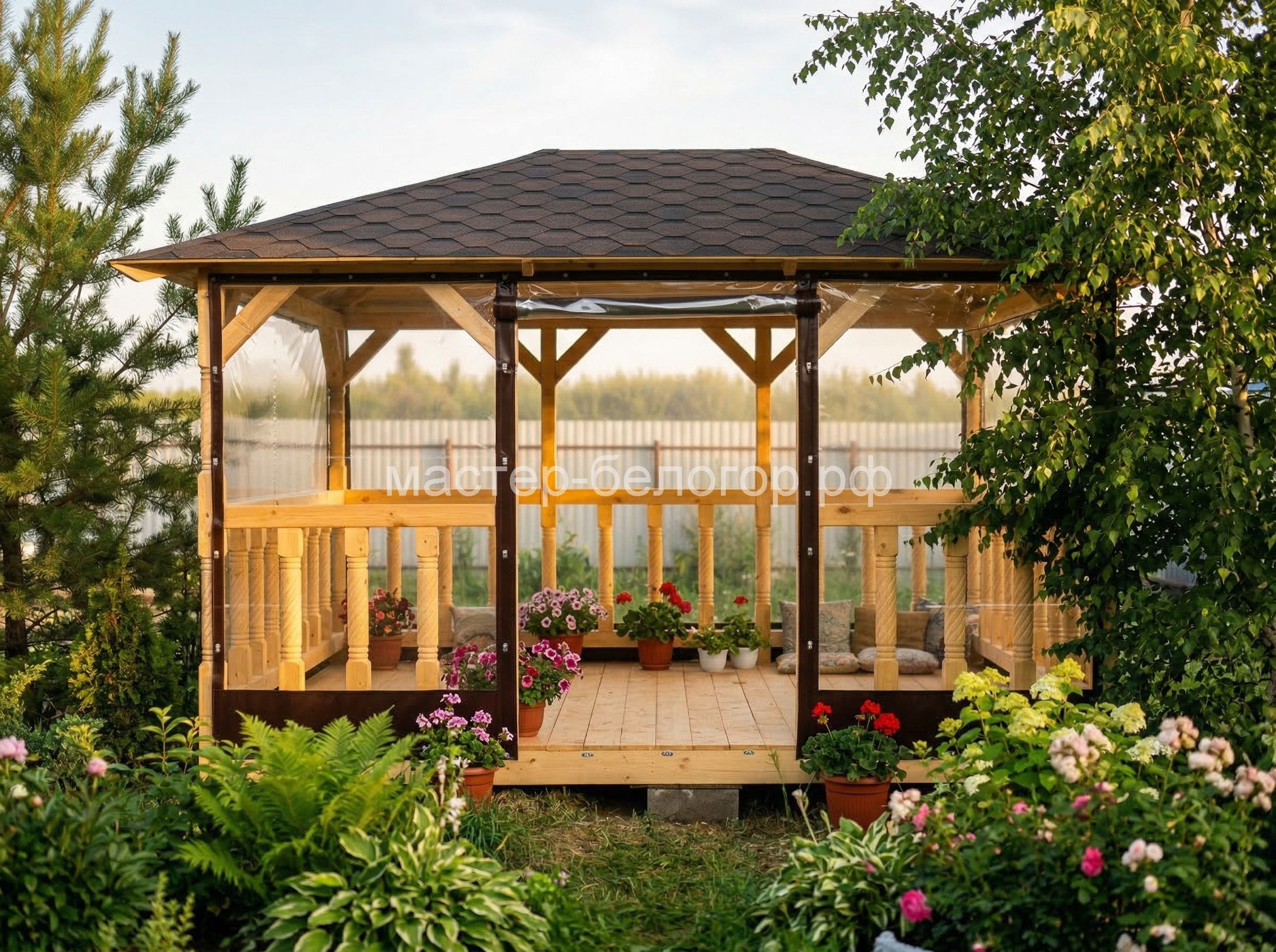 С окнами ПВХ,Вы получаете беседку 2в1(открытая и закрытая).Отличное решение!