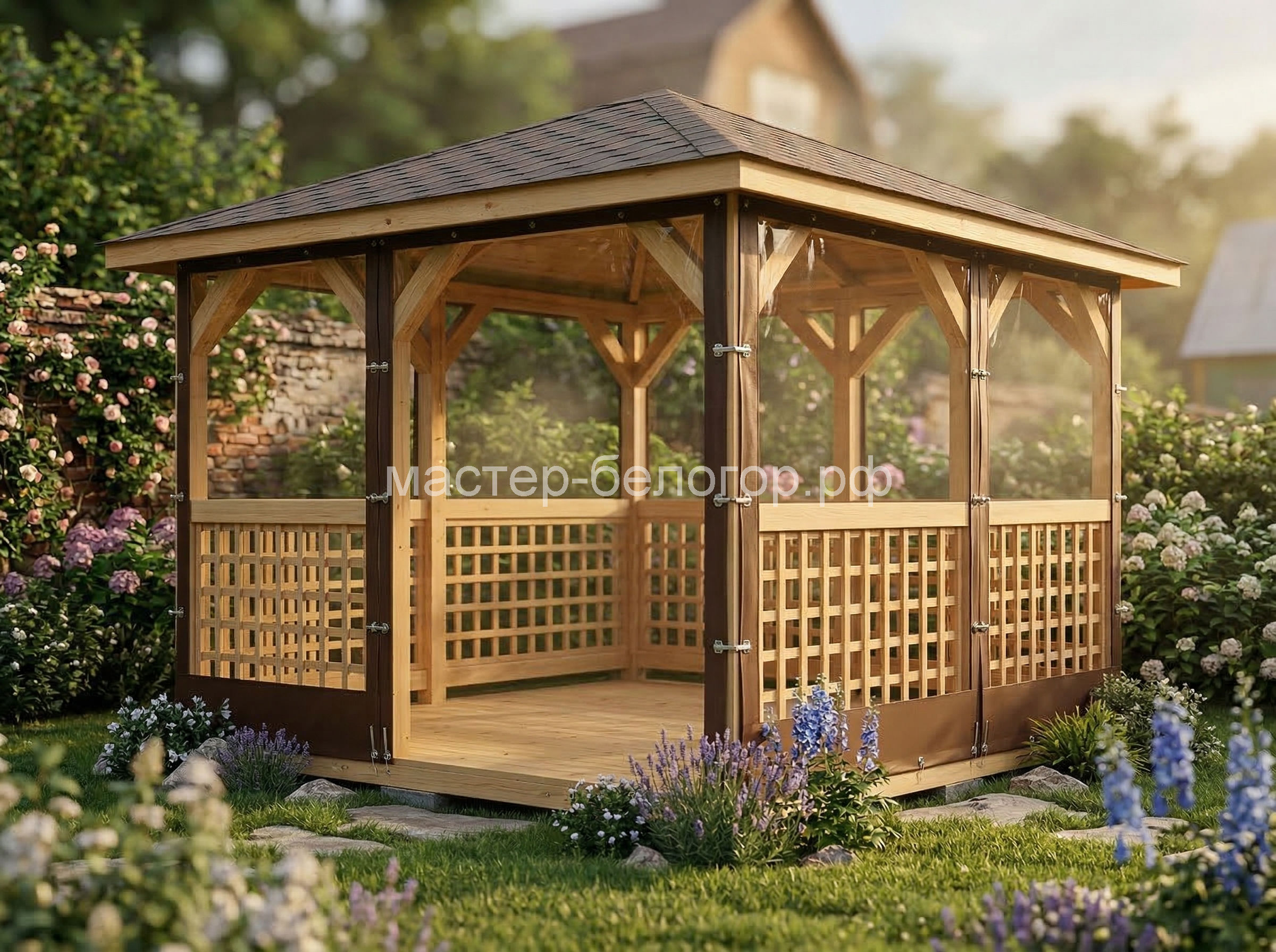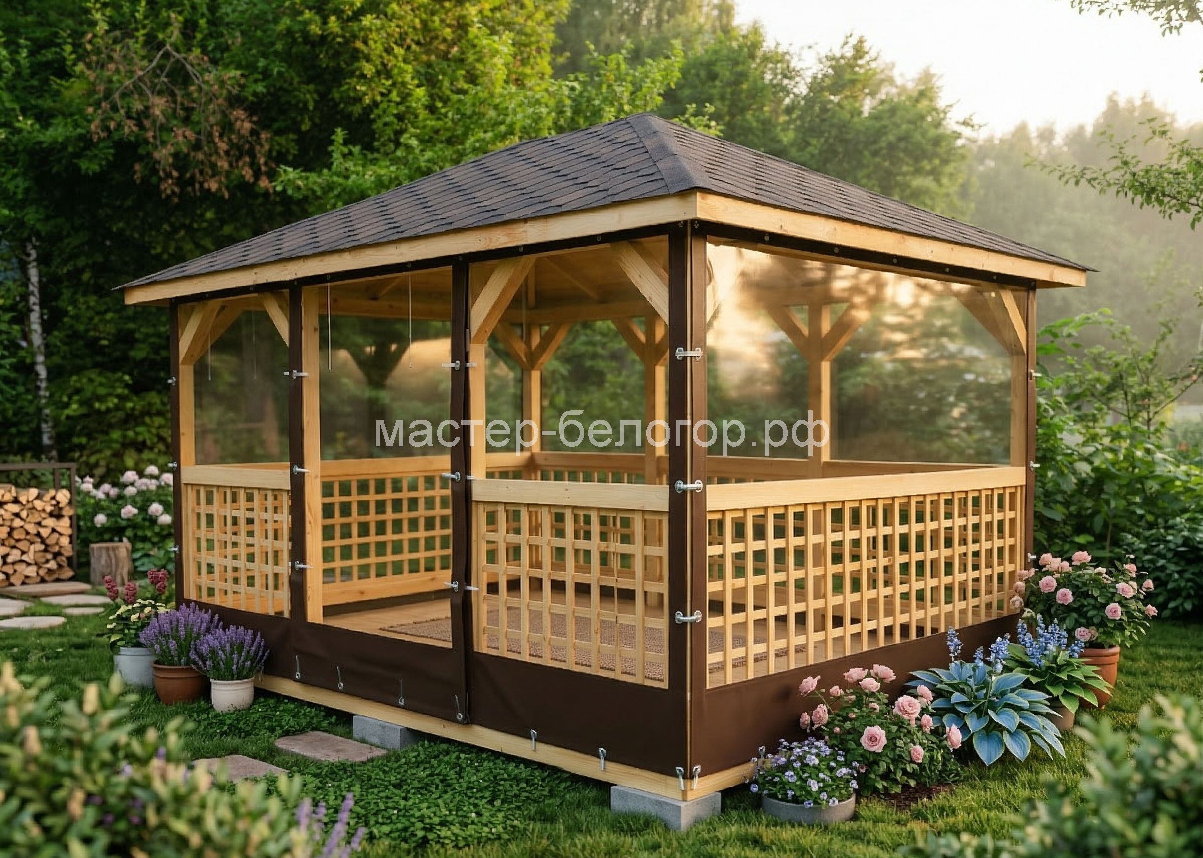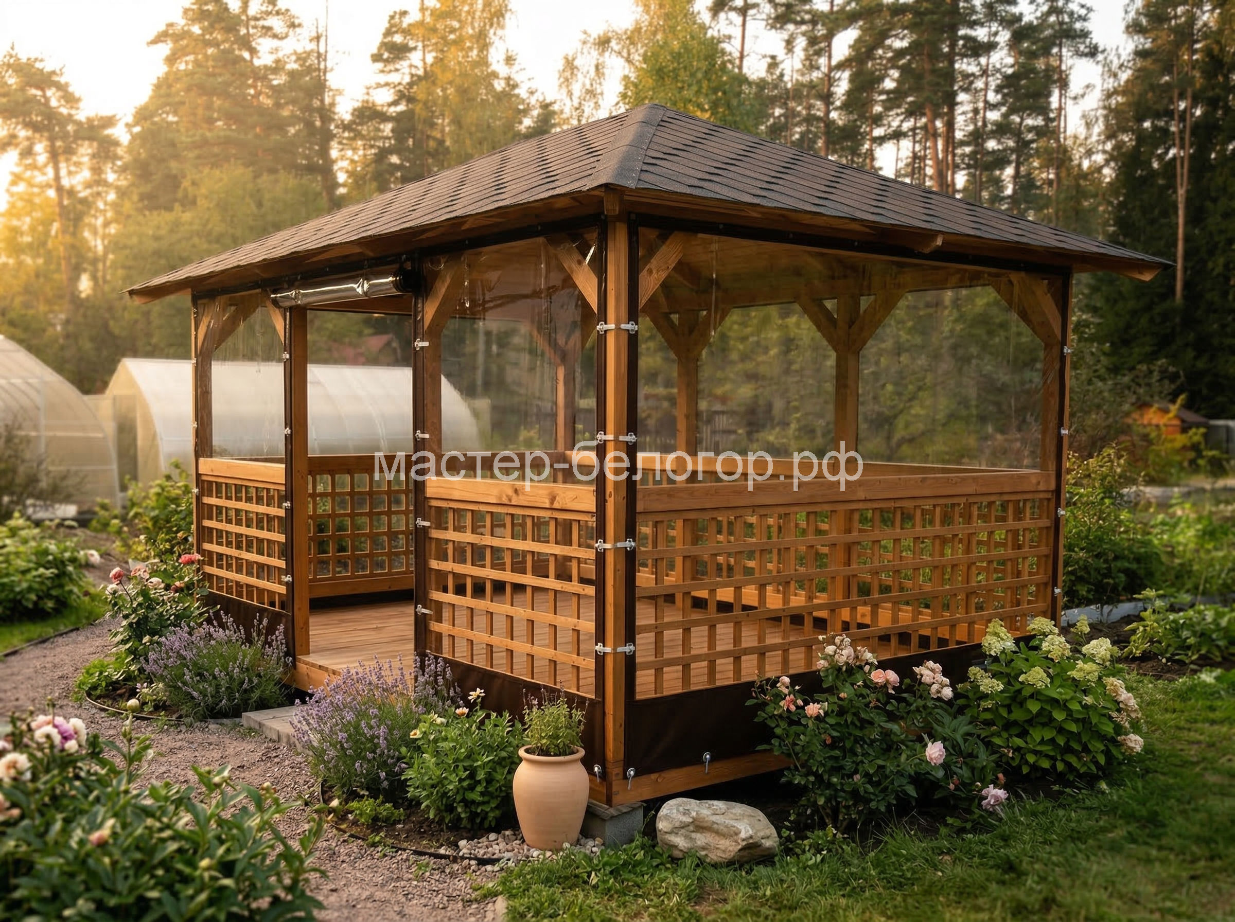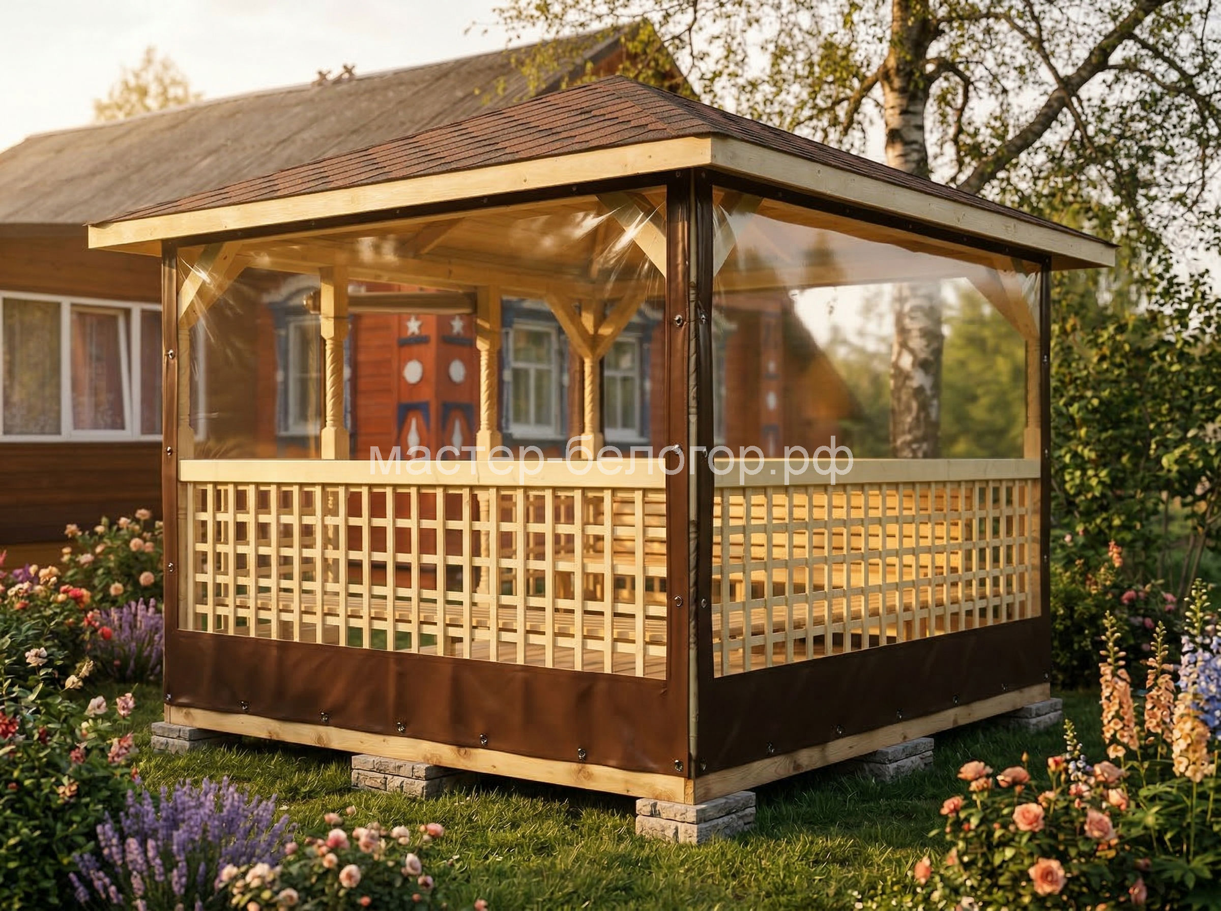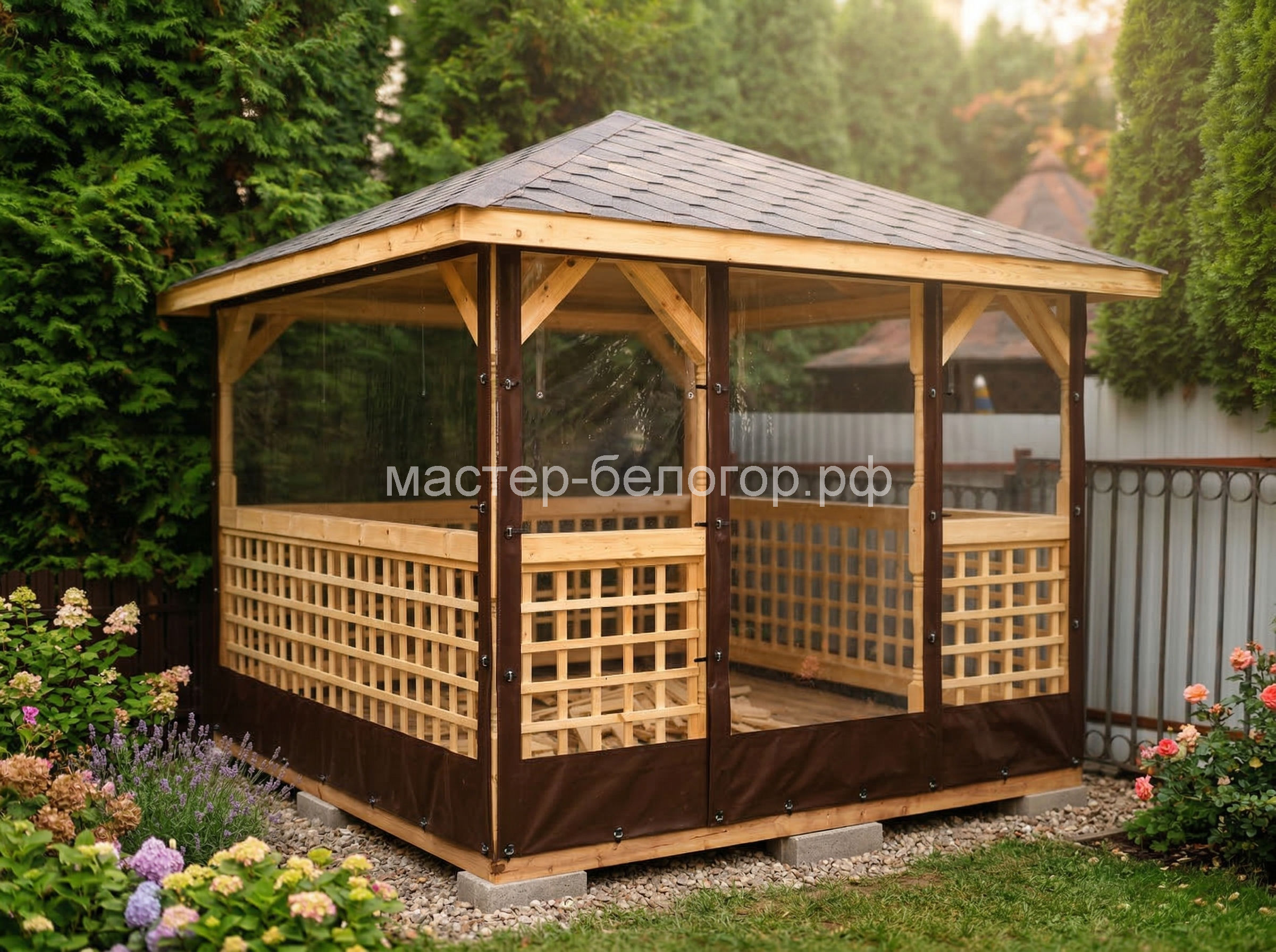 С окнами ПВХ,Вы получаете беседку 2в1(открытая и закрытая).Отличное решение!