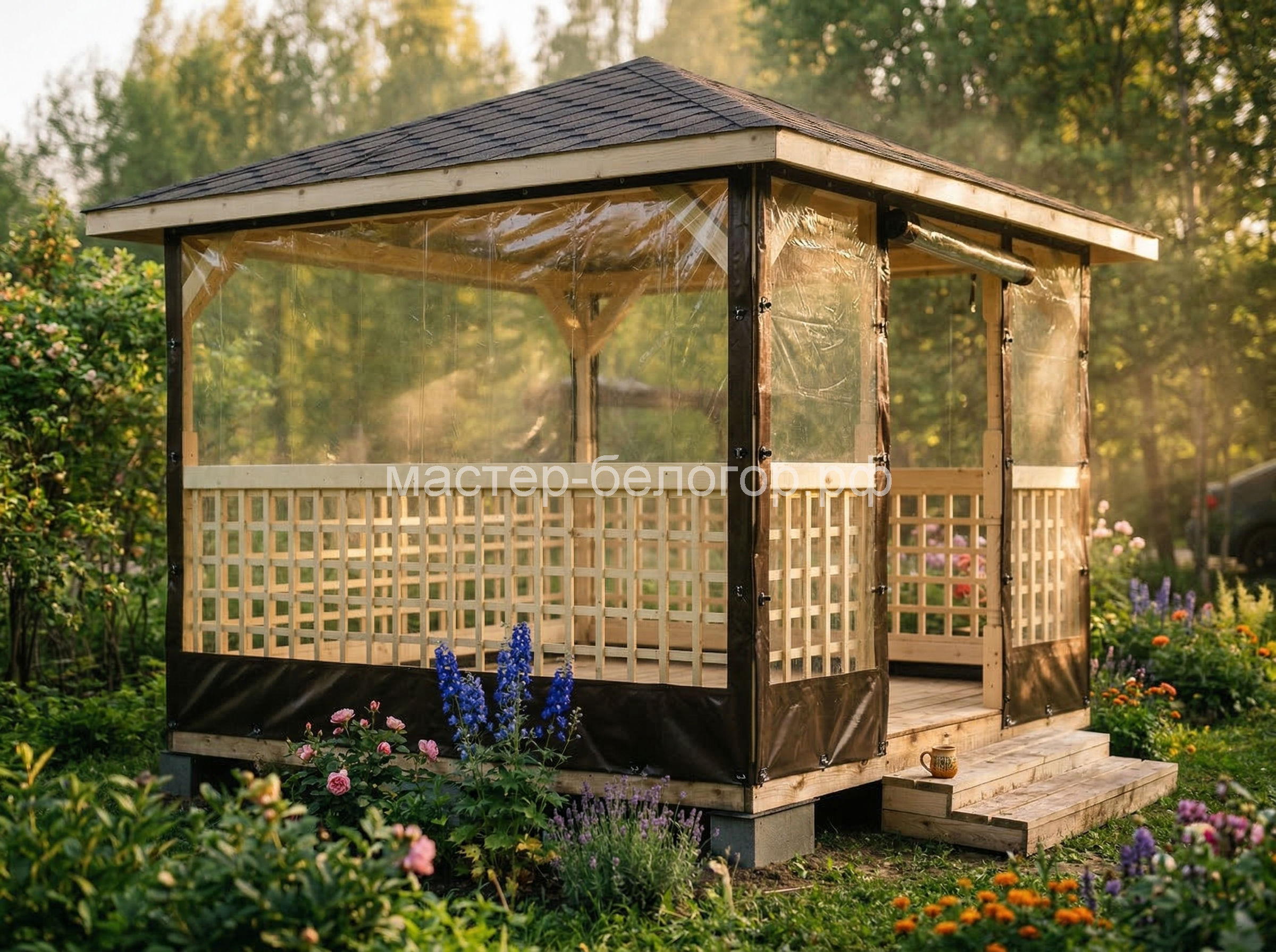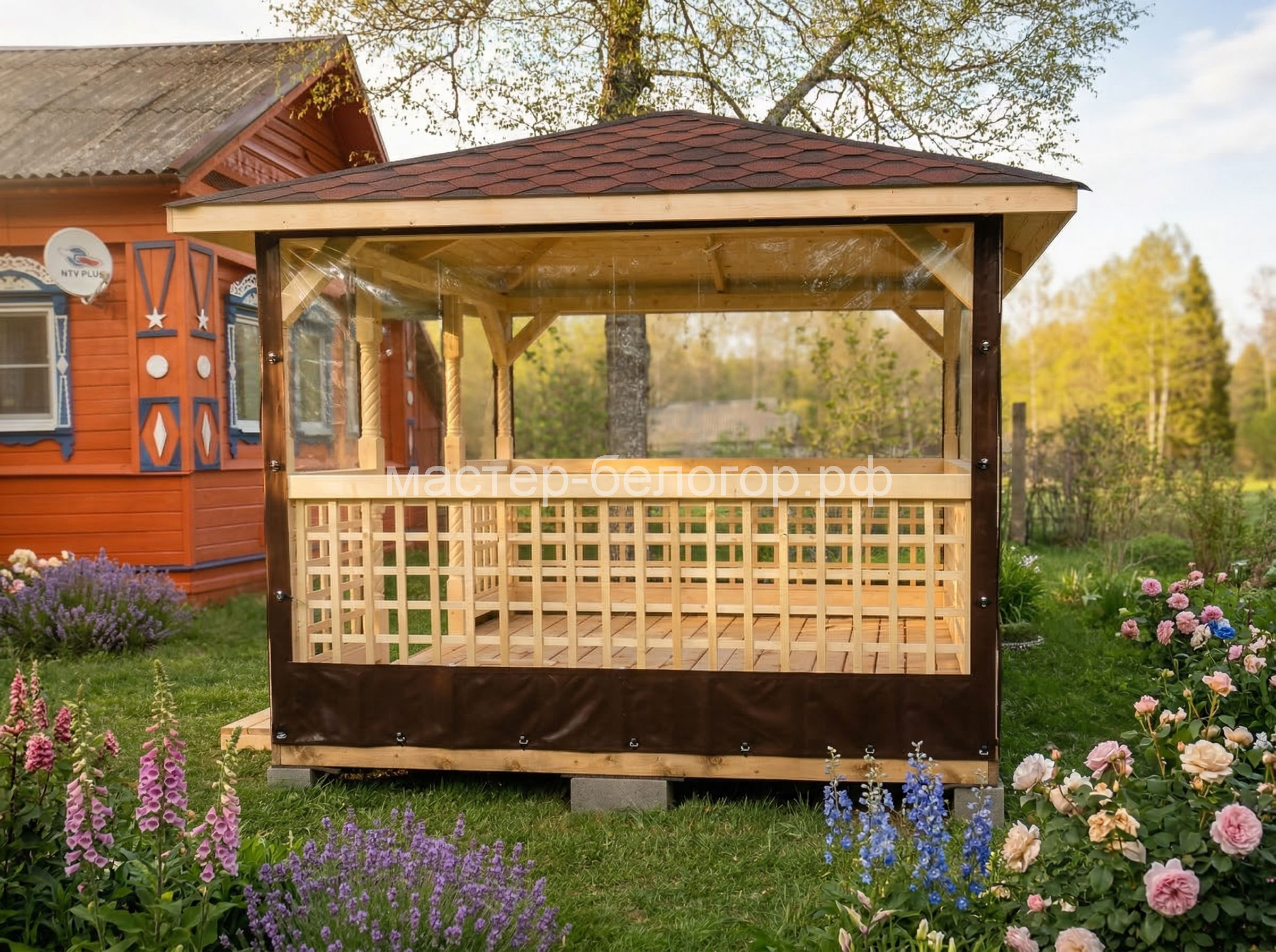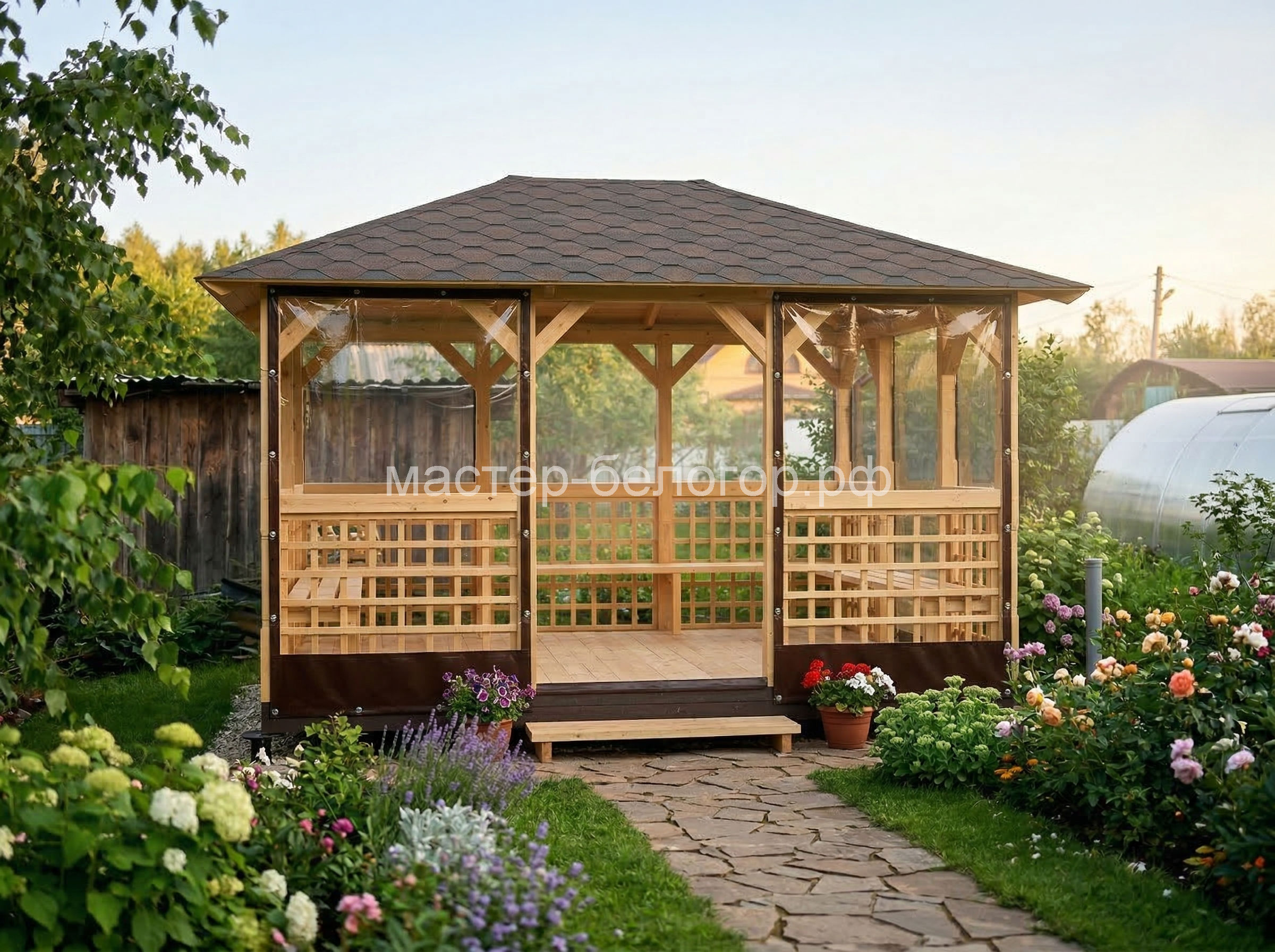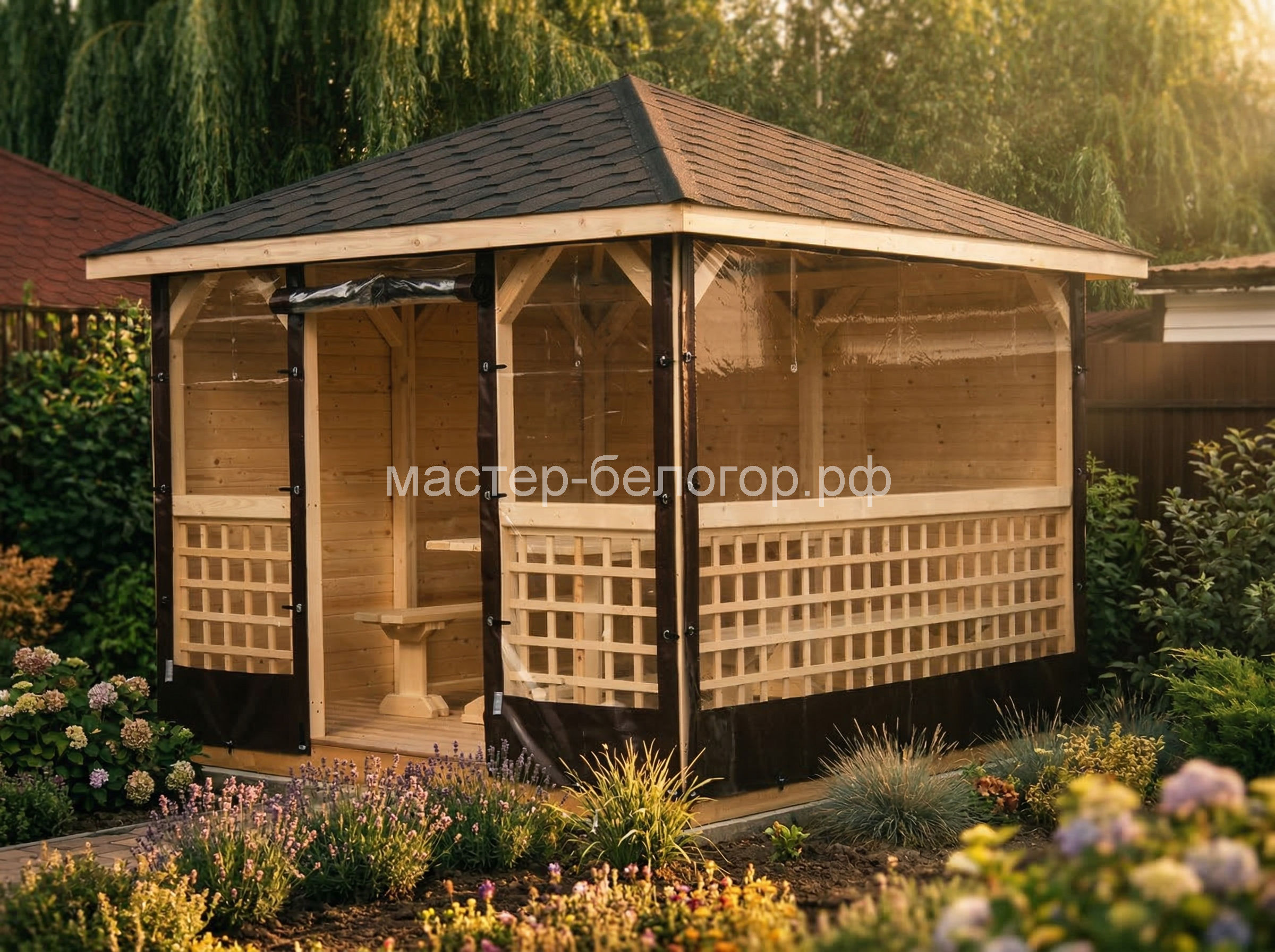 С окнами ПВХ,Вы получаете беседку 2в1(открытая и закрытая).Отличное решение!