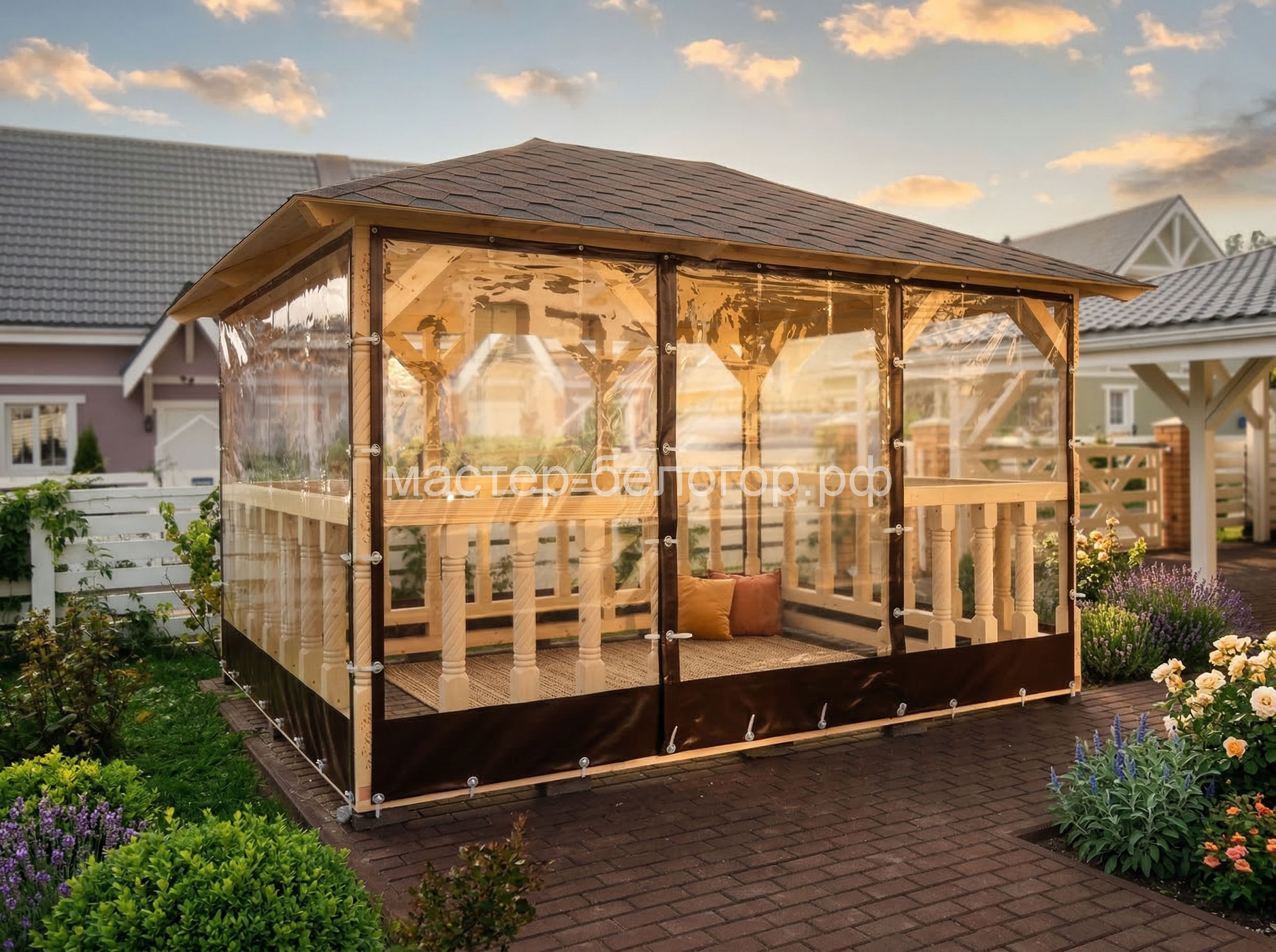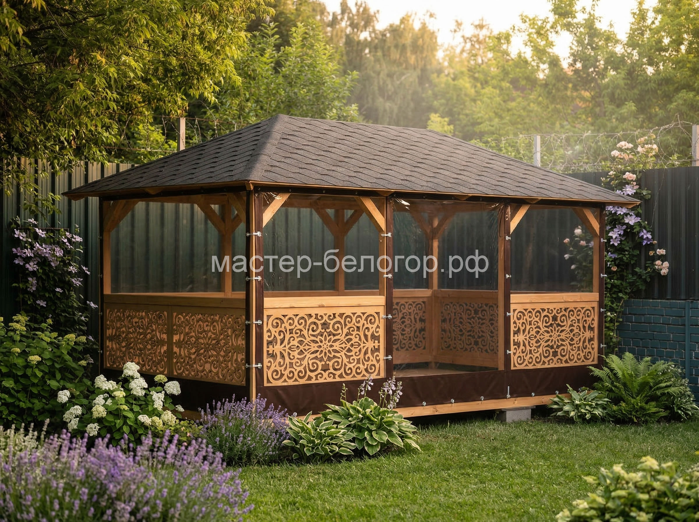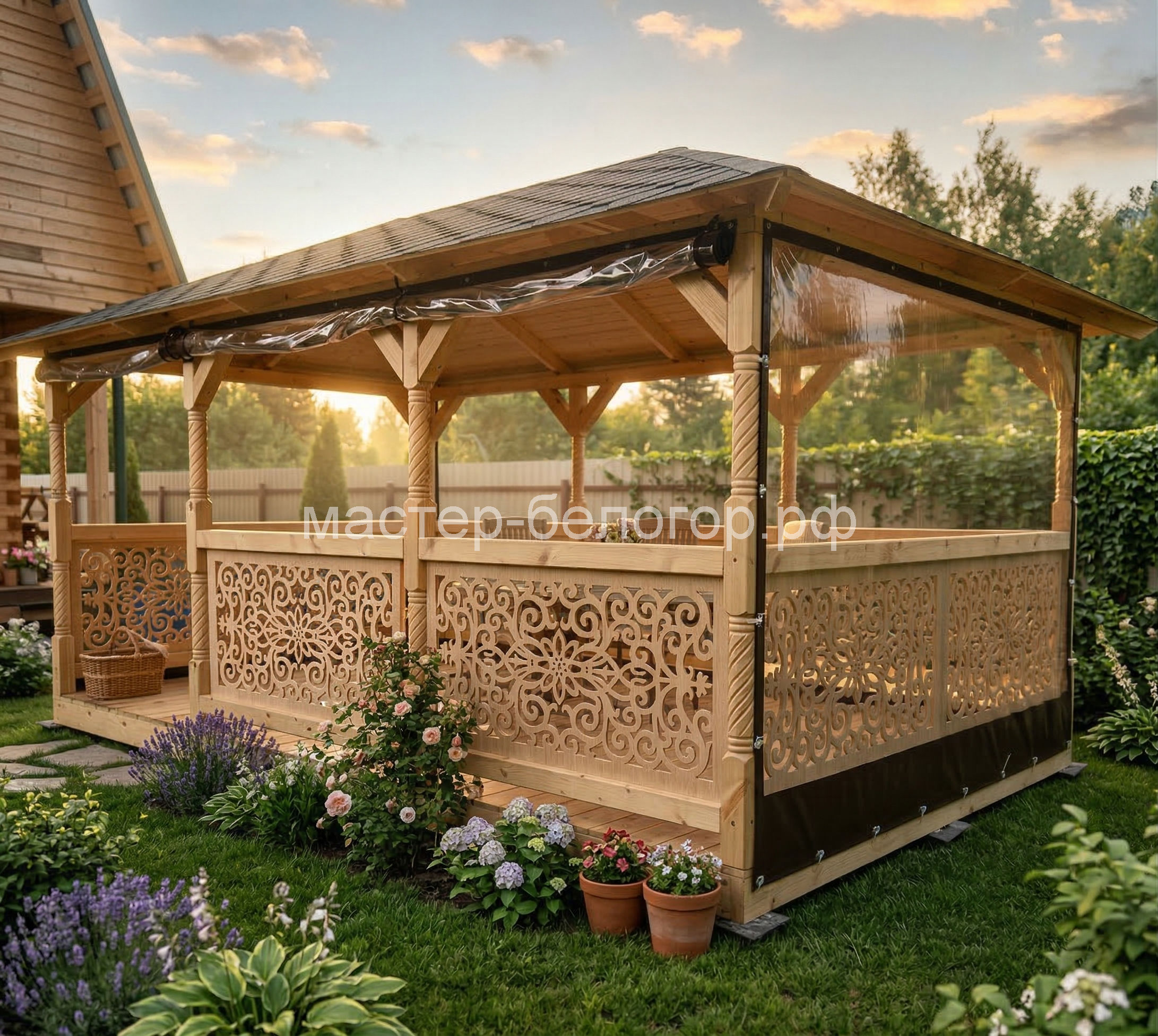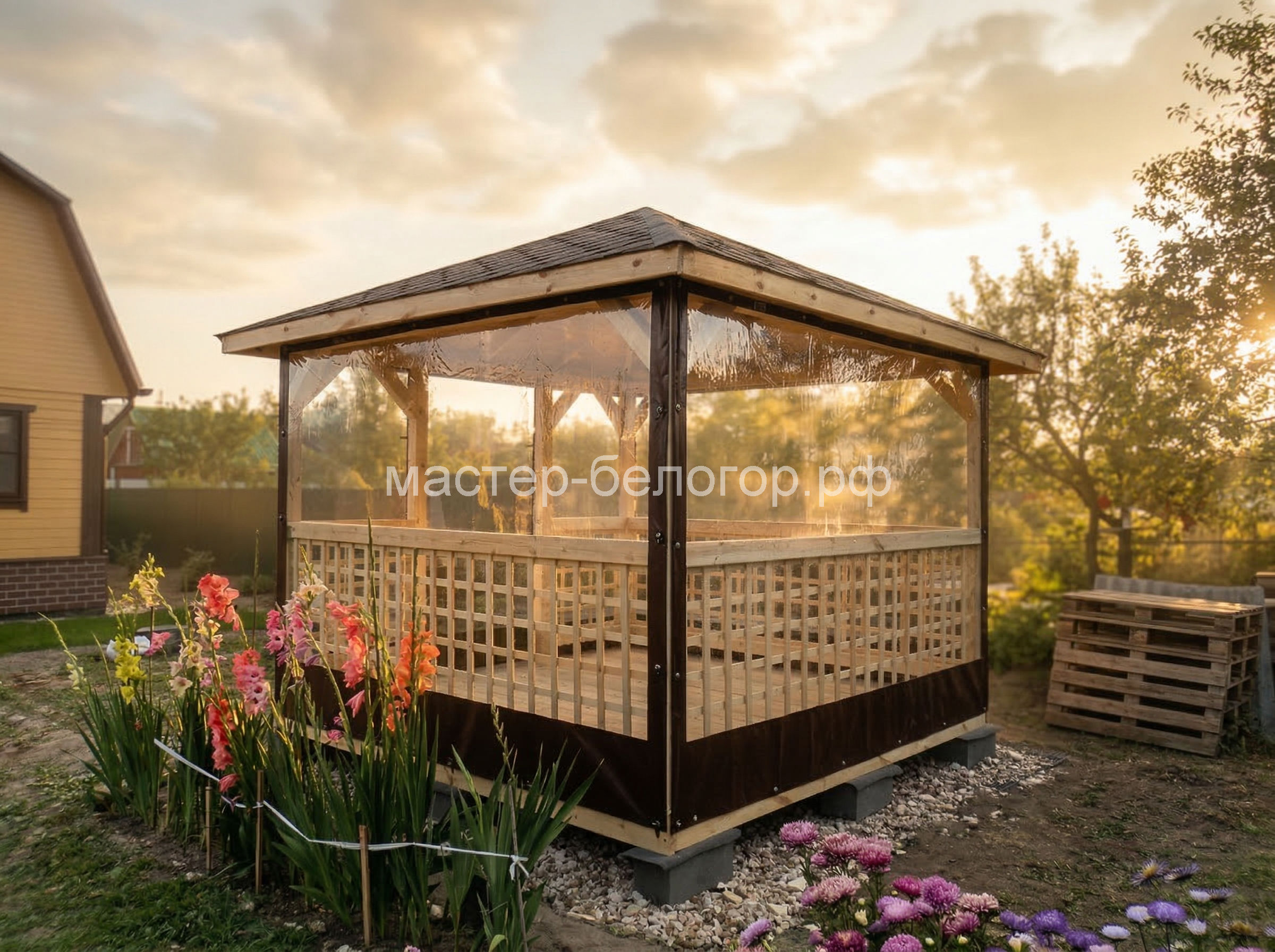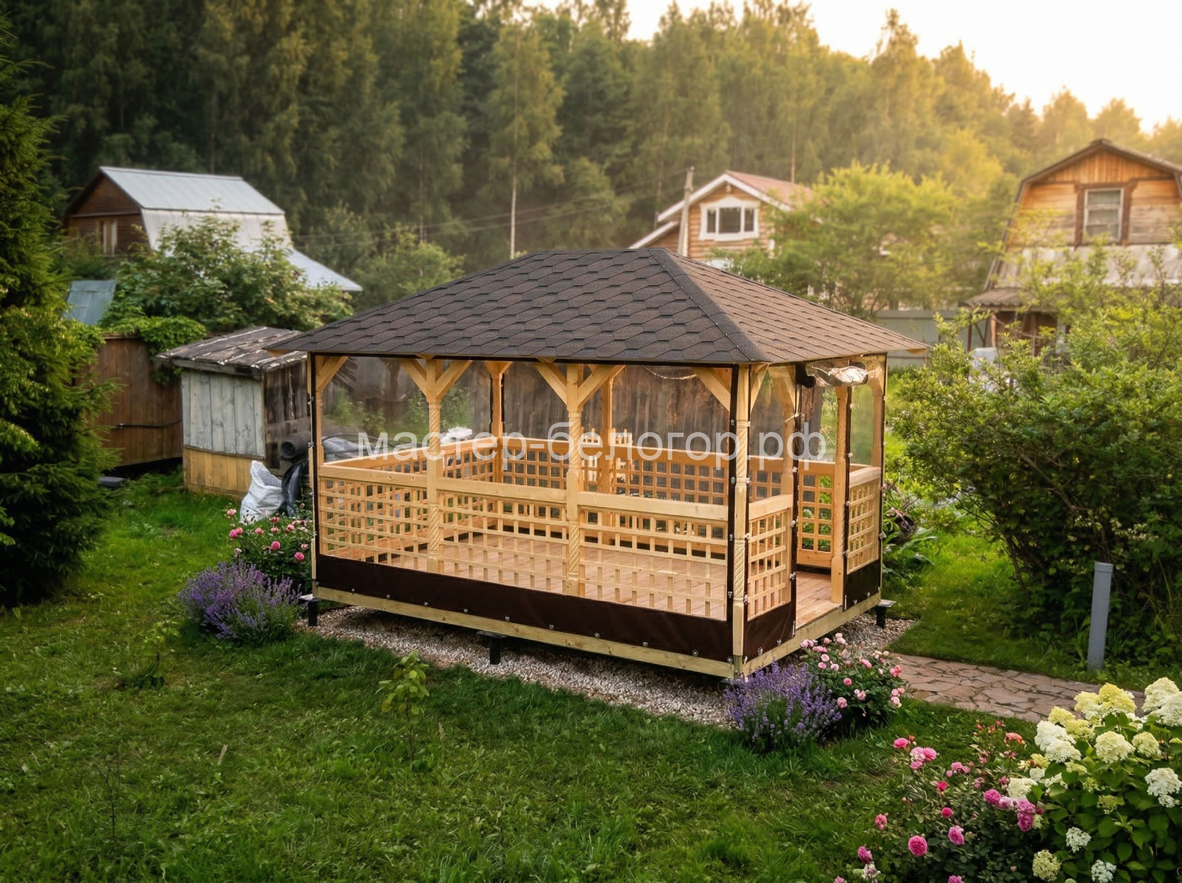 С окнами ПВХ,Вы получаете беседку 2в1(открытая и закрытая).Отличное решение!