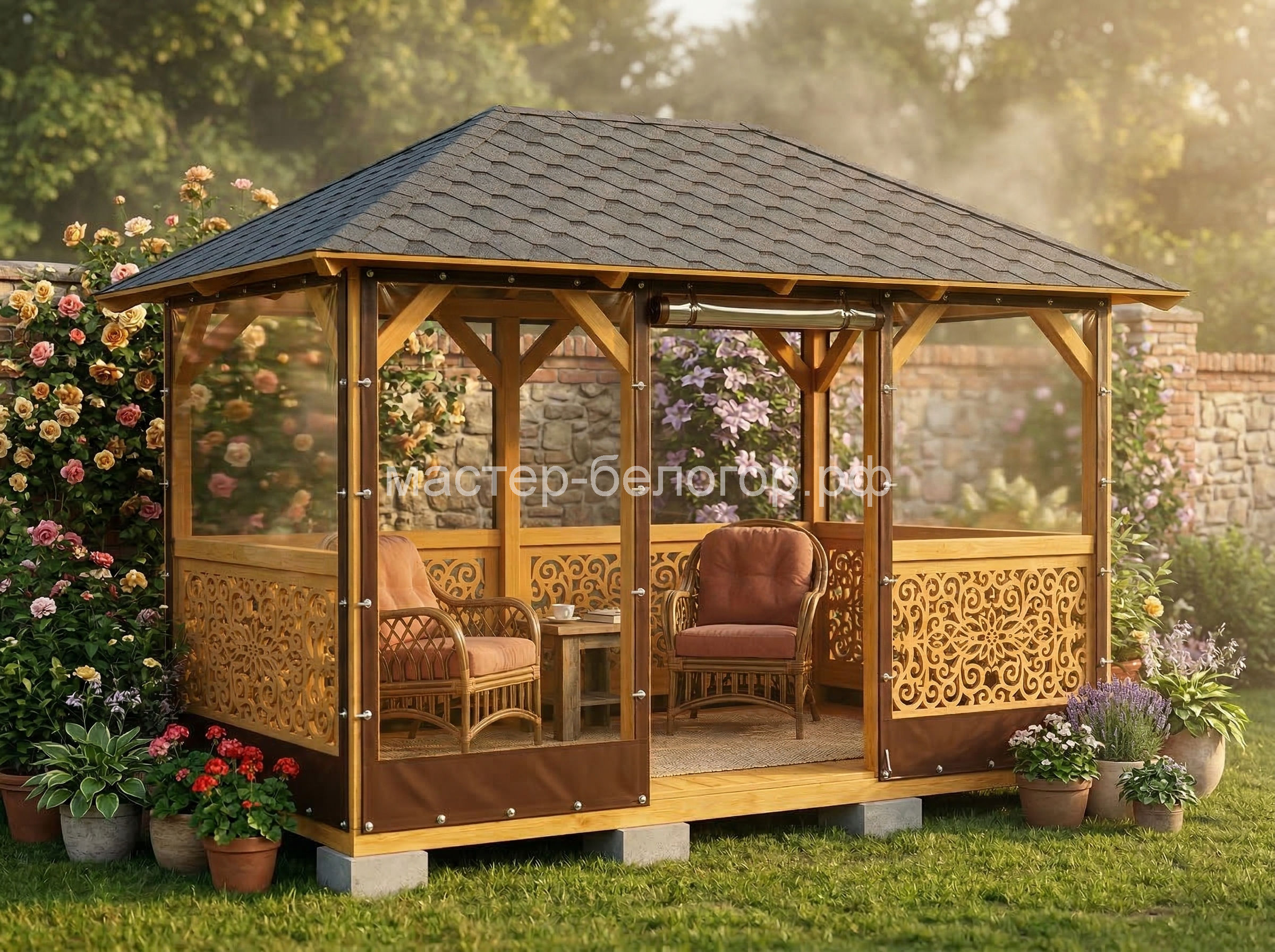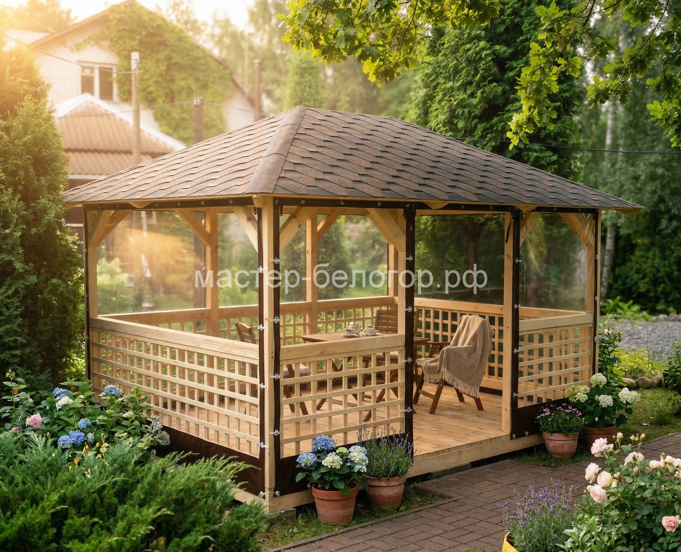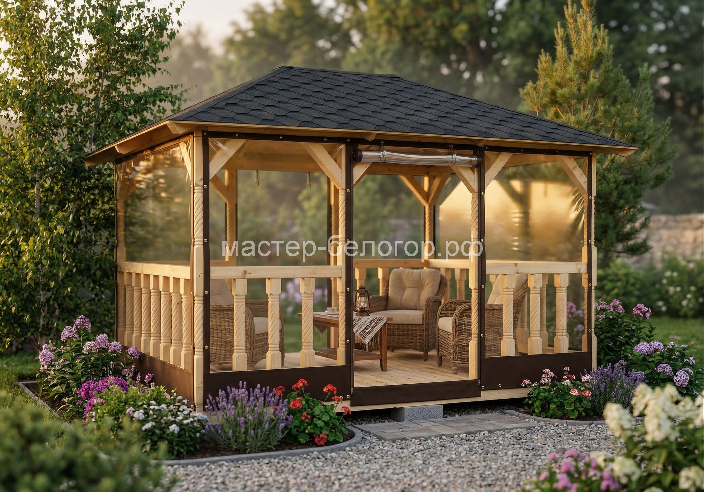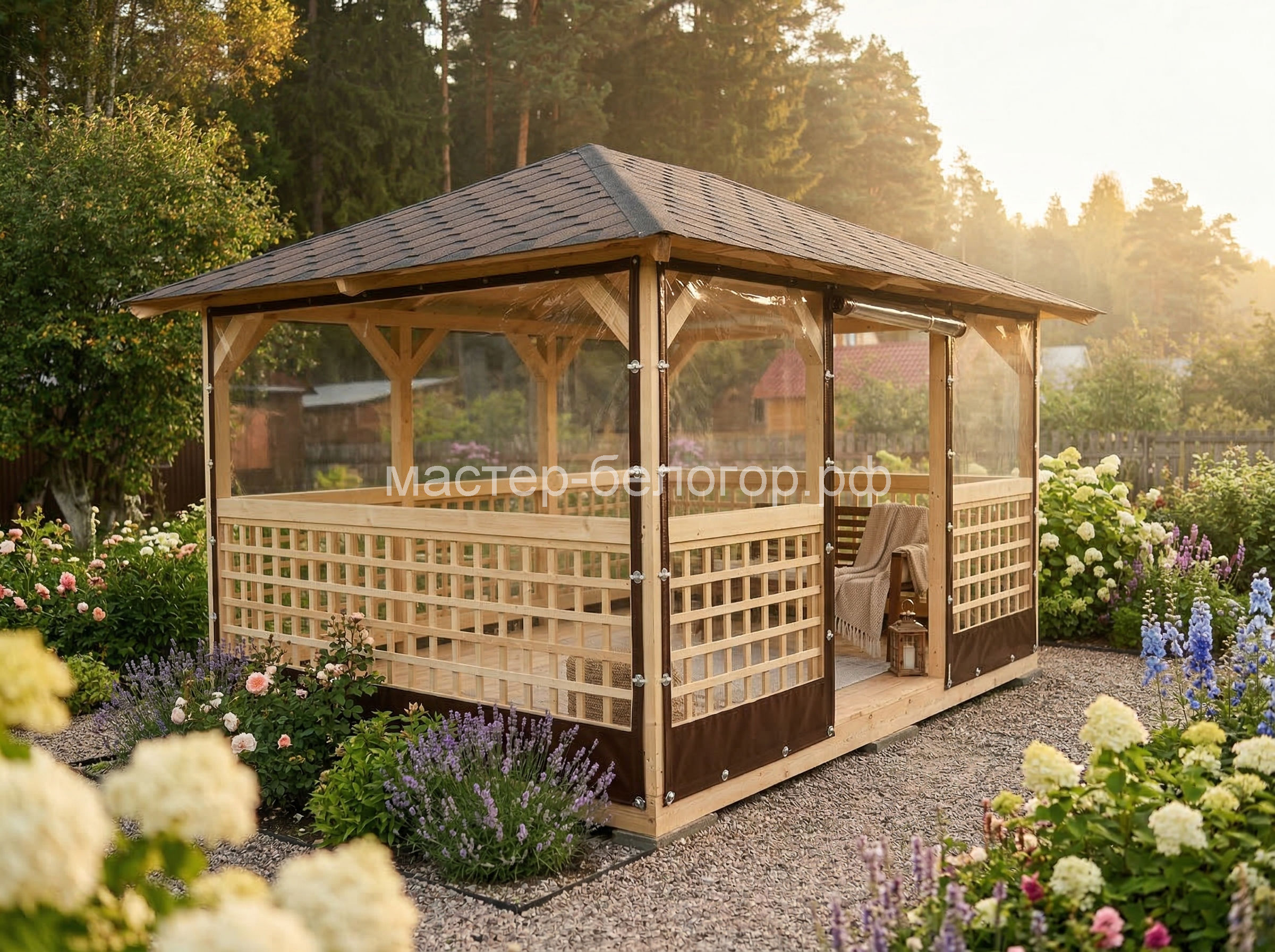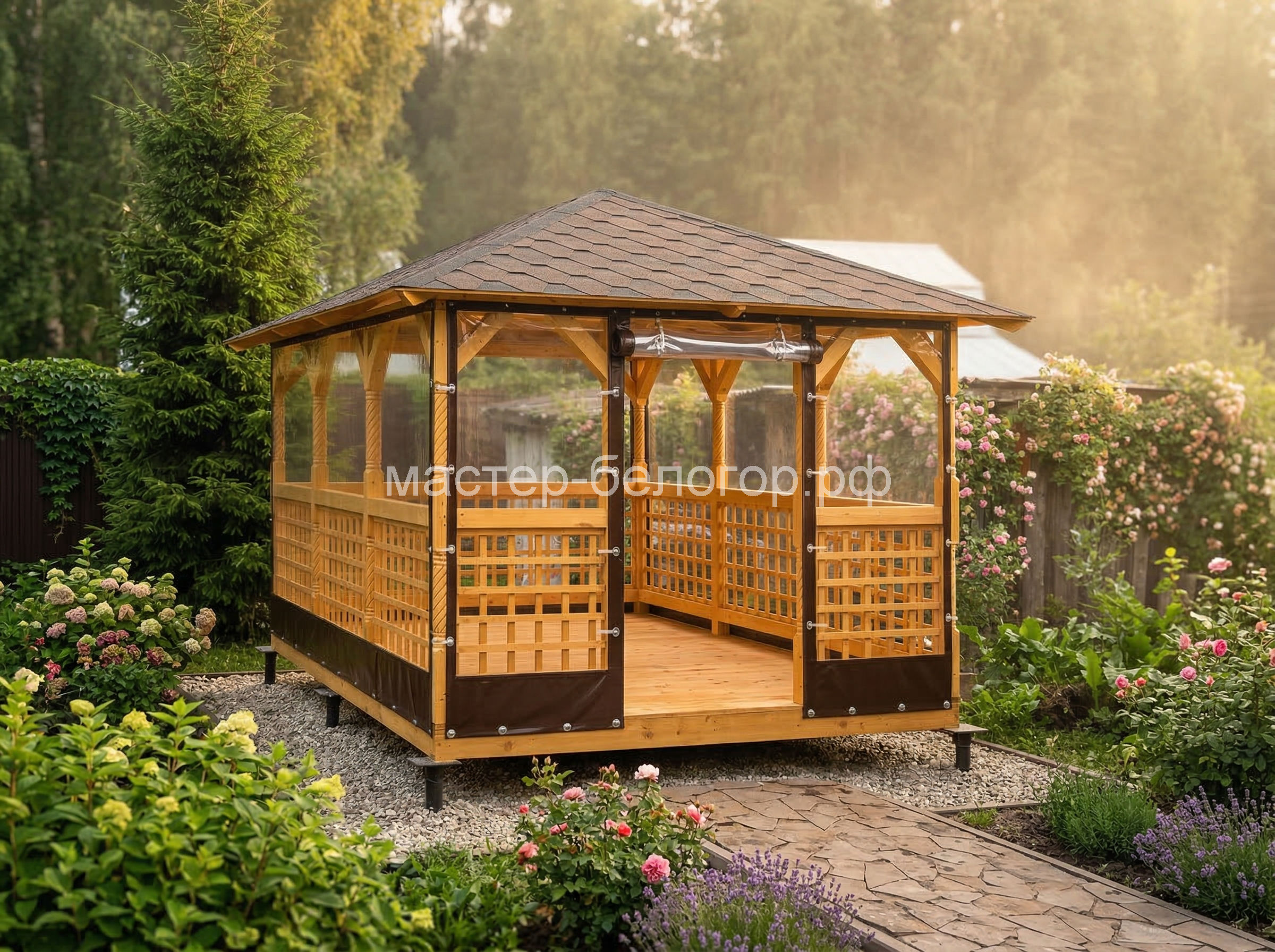 С окнами ПВХ,Вы получаете беседку 2в1(открытая и закрытая).Отличное решение!