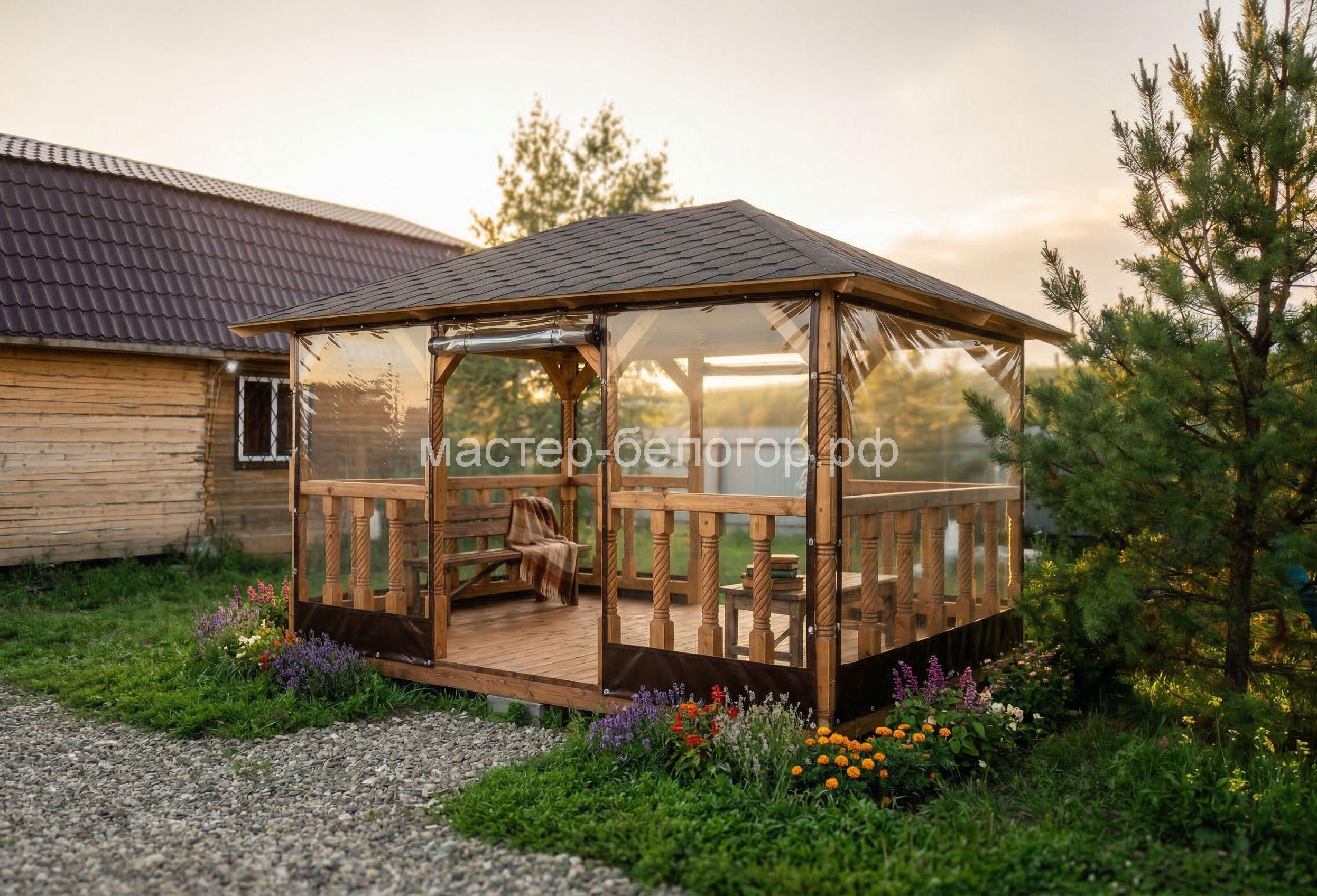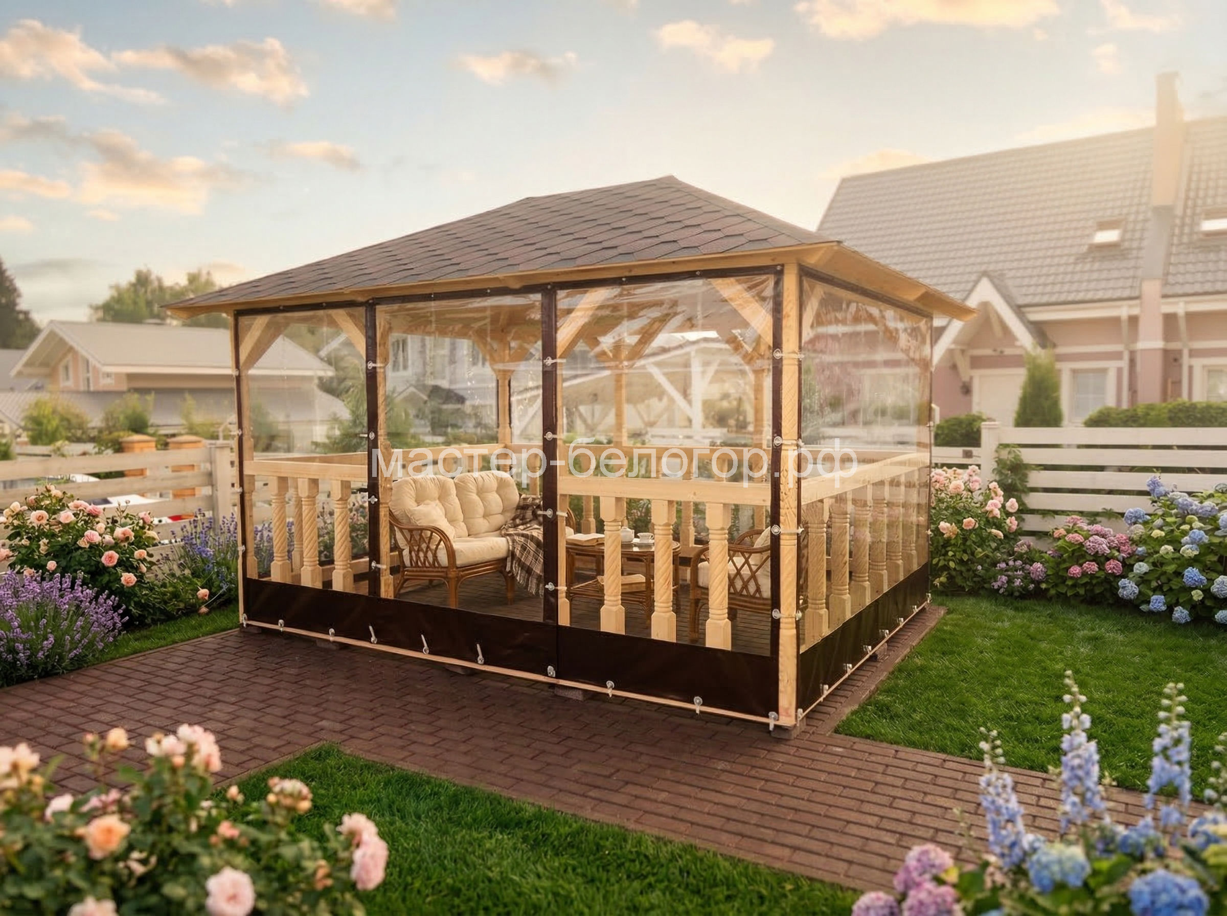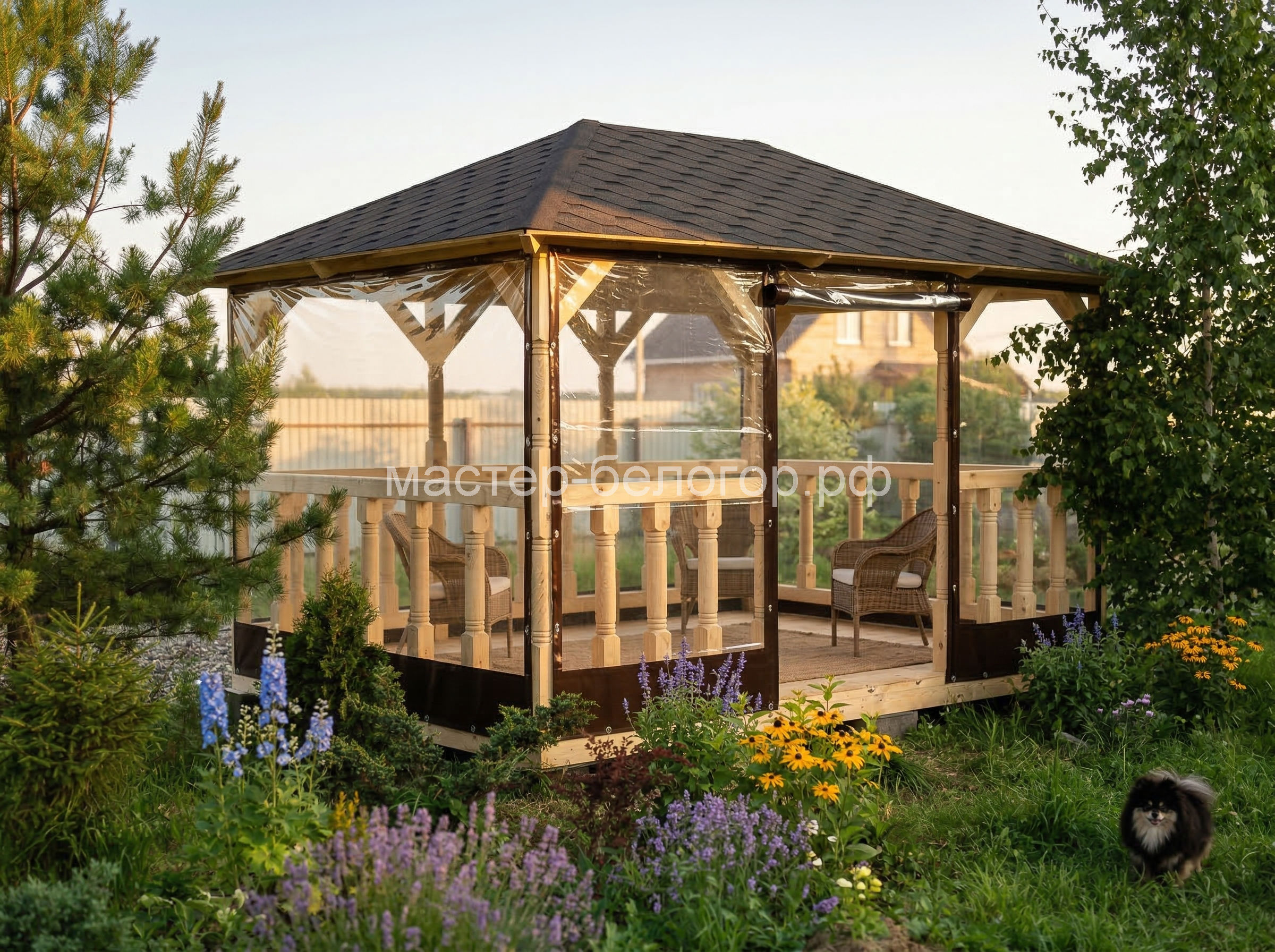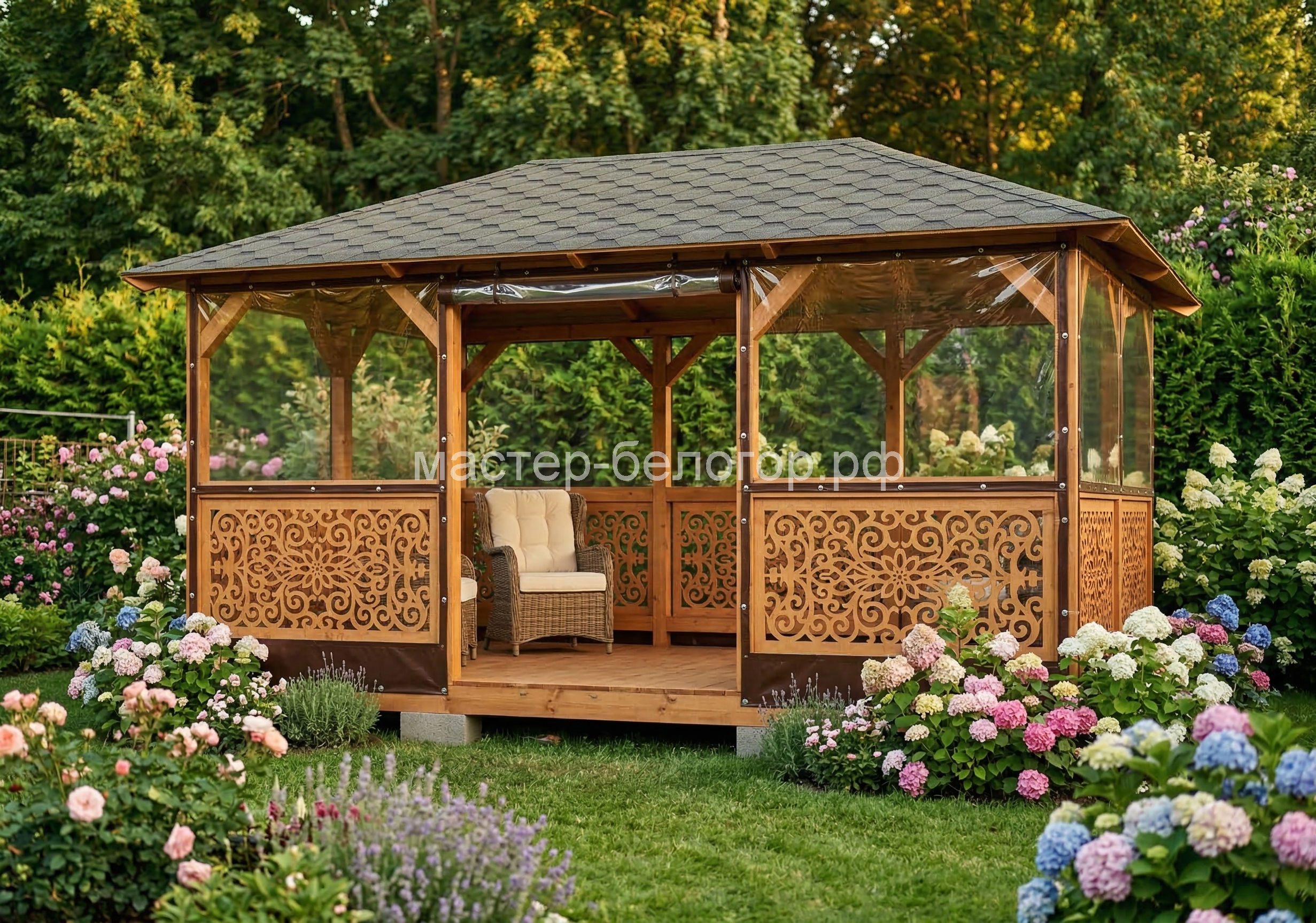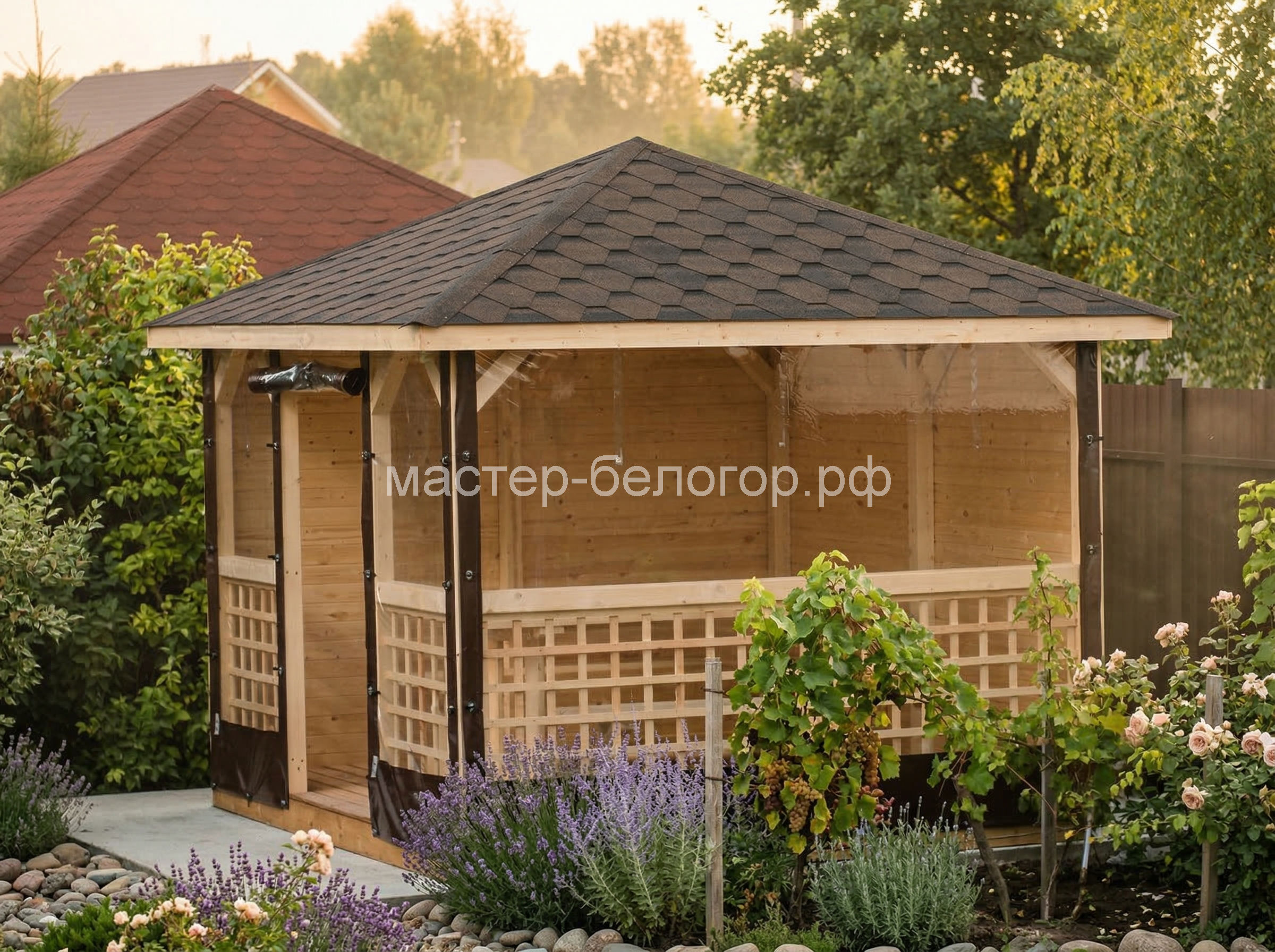 С окнами ПВХ,Вы получаете беседку 2в1(открытая и закрытая).Отличное решение!