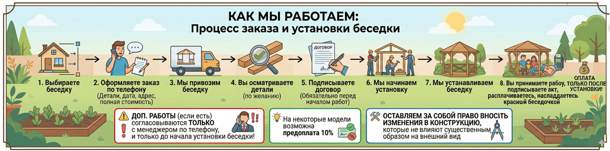 Доставляем и собираем в один день!(за исключением больших беседок)